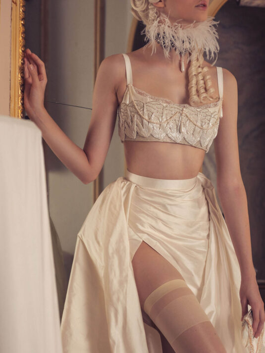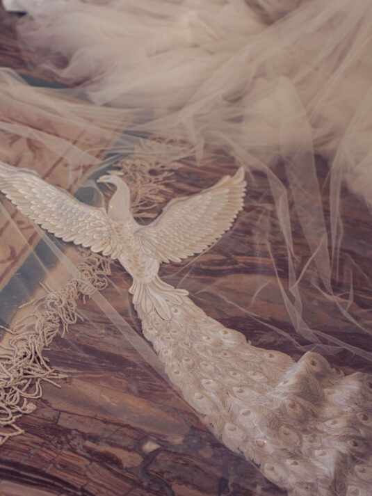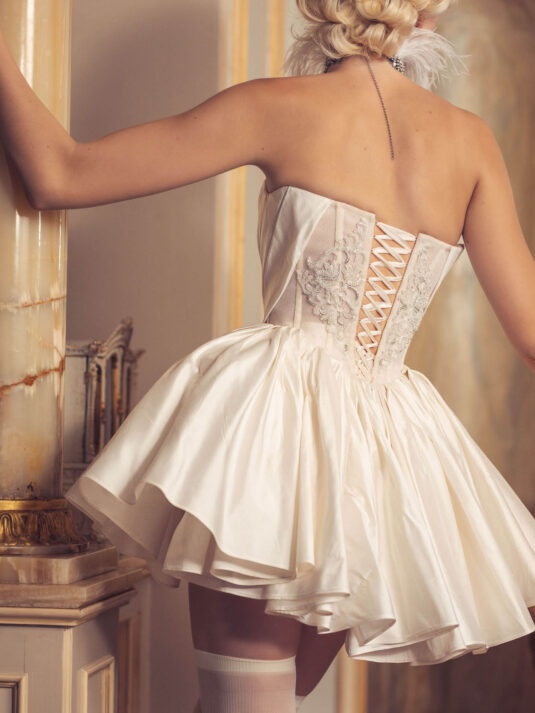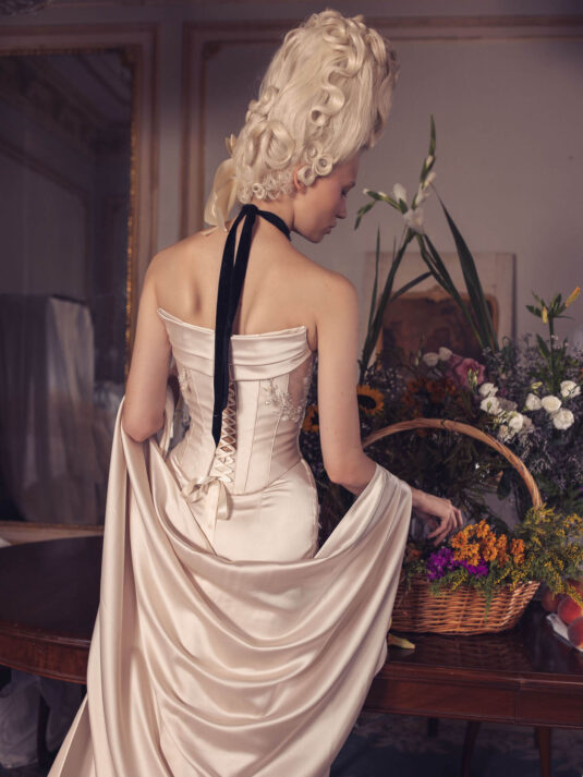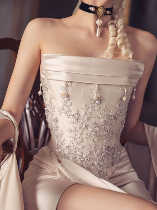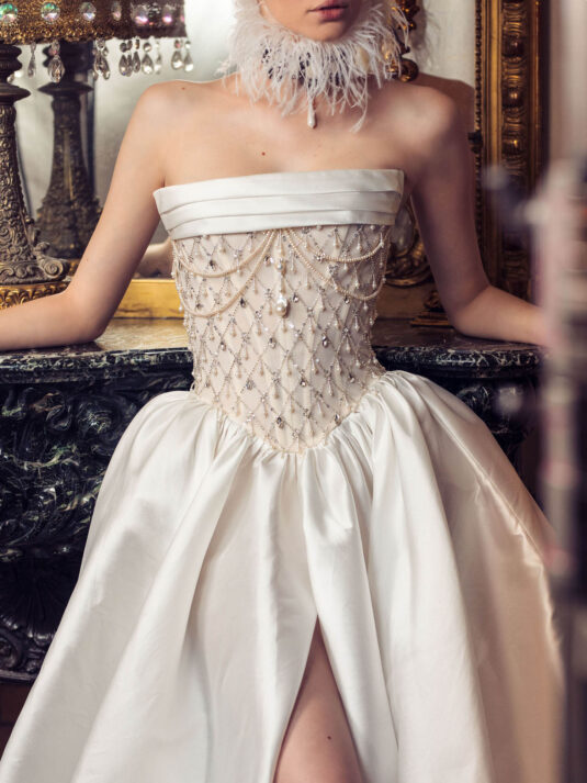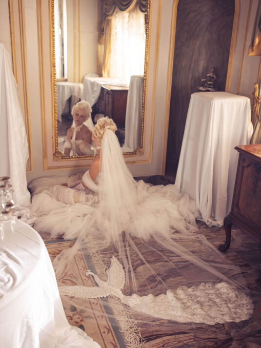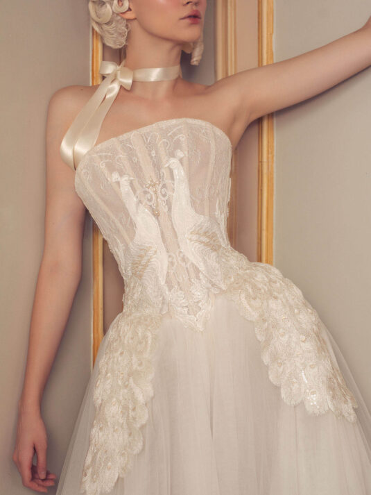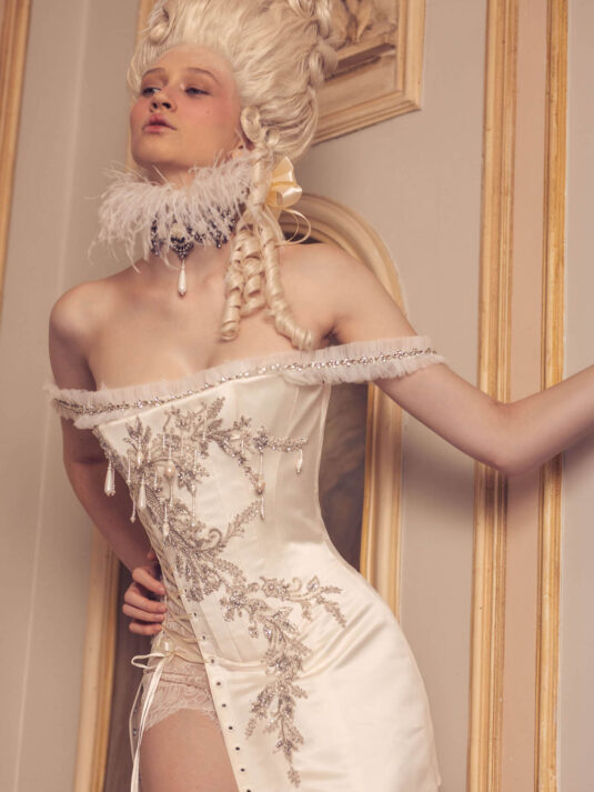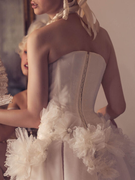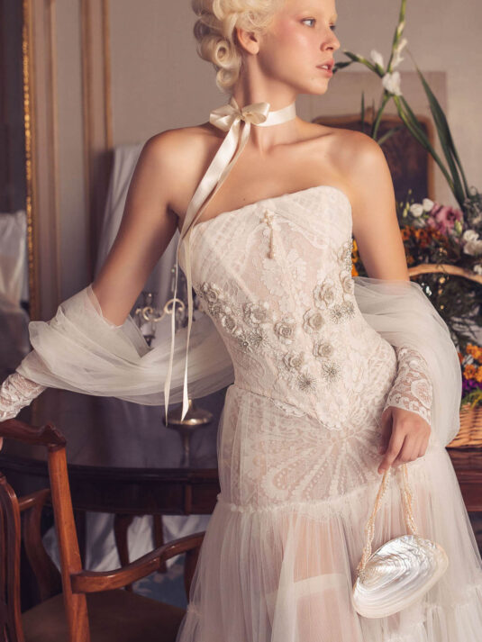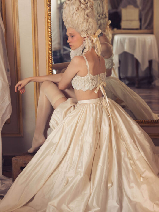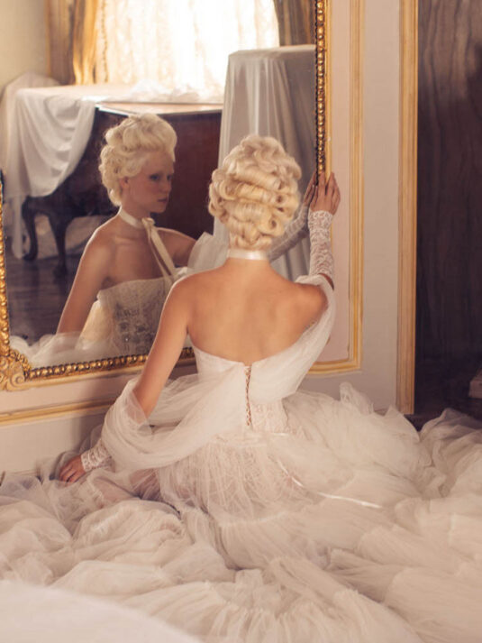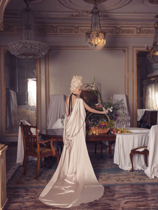 “Your Majesty” delves into the iconic undergarment ensemble of Marie Antoinette, reimagining luxurious corsets, chemises, panniers, bloomers, and petticoats into a stunning collection of 13 bridal gowns. More than ever, this collection celebrates the philosophy of ‘more is more,’ embracing avant-garde designs and an extravagance that encapsulates the true essence of royalty. The campaign portrays an exaggerated scene where the Queen and her entourage prepare for a lavish event, setting the stage for the opulence that awaits.