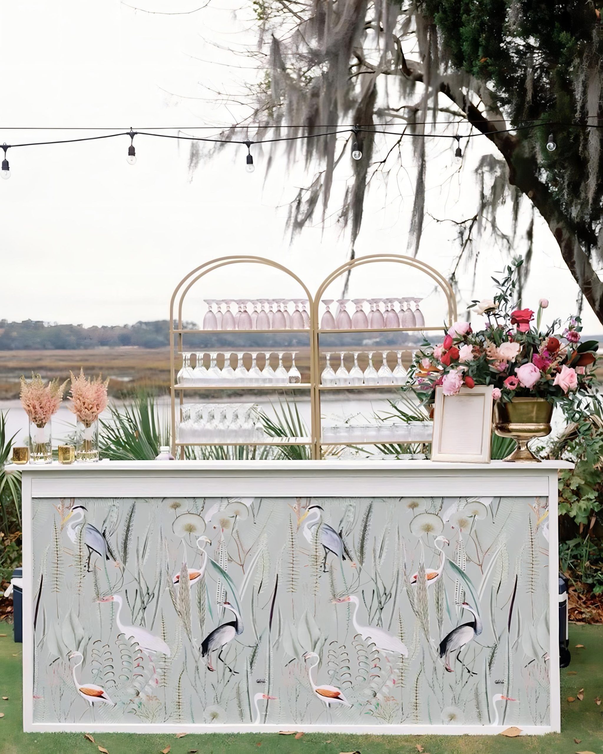 You can never go wrong with a well-designed bar! We love it when a custom-printed vinyl motif is applied to a rented bar front, perfectly capturing the Low Country vibes.