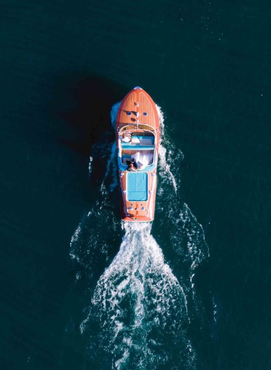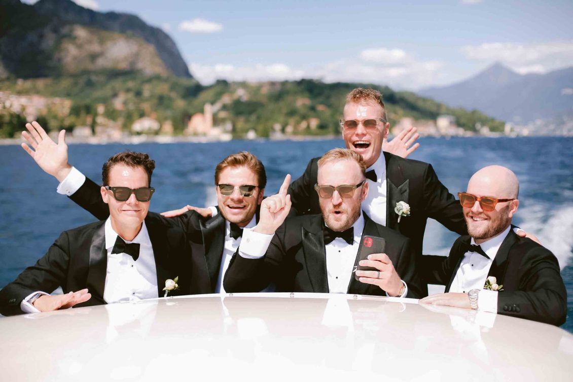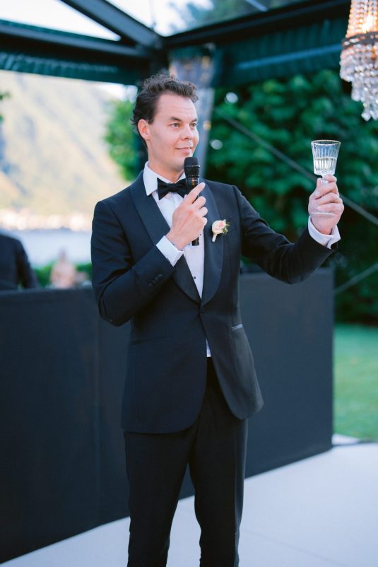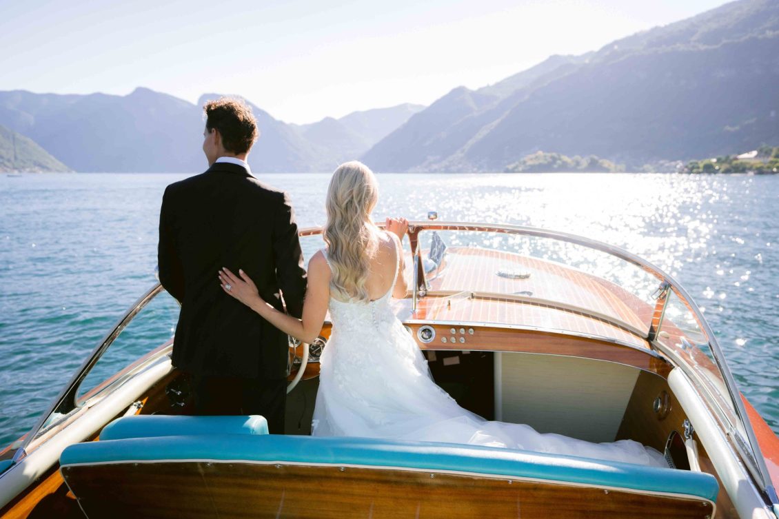 Immediately following the wedding ceremony, the newlyweds boarded a classic wooden boat dubbed a “Venetian Limousine” from Como Classic Boats for a sunset portrait session on Lake Como. At the same time, a cocktail hour commenced for guests on the mountain-facing back lawn of Villa Balbiano.