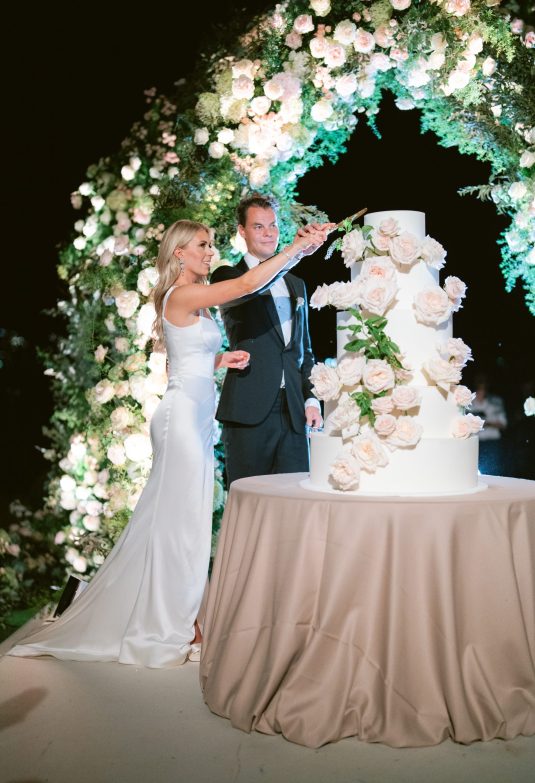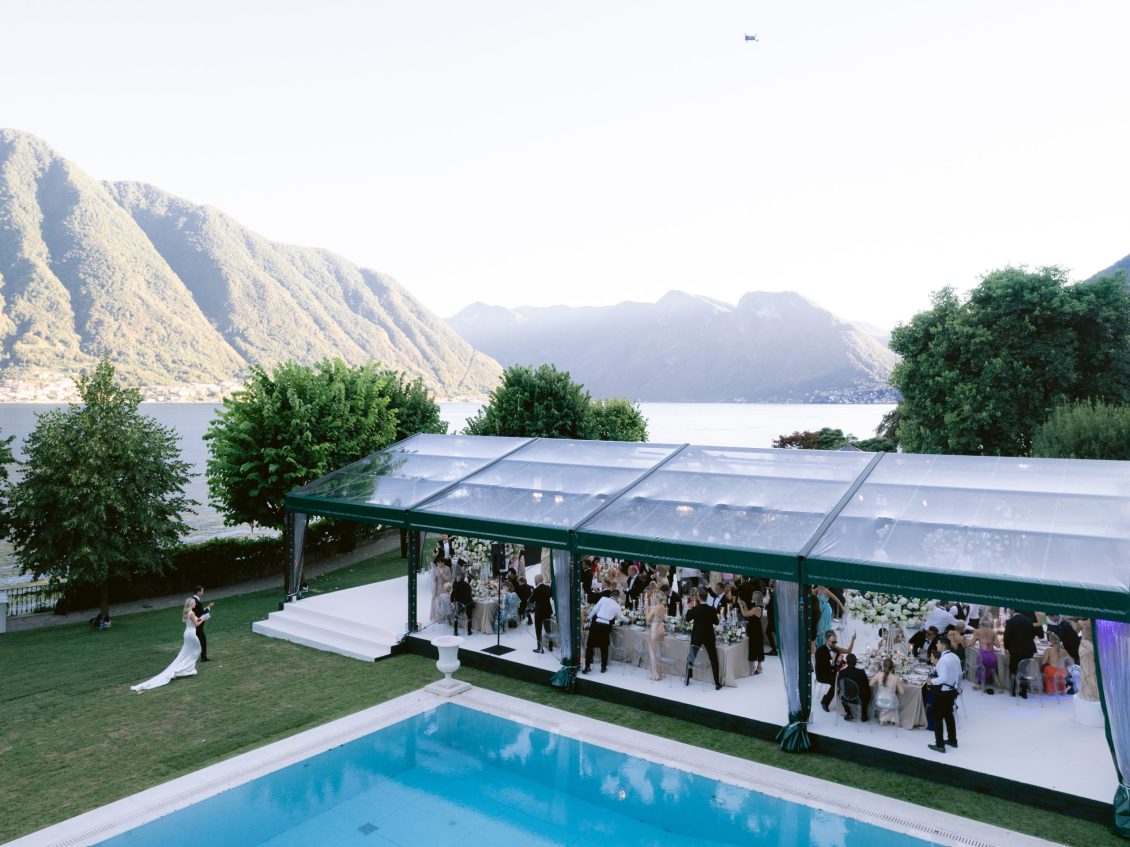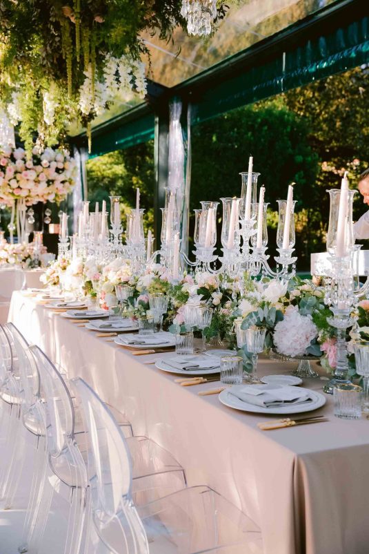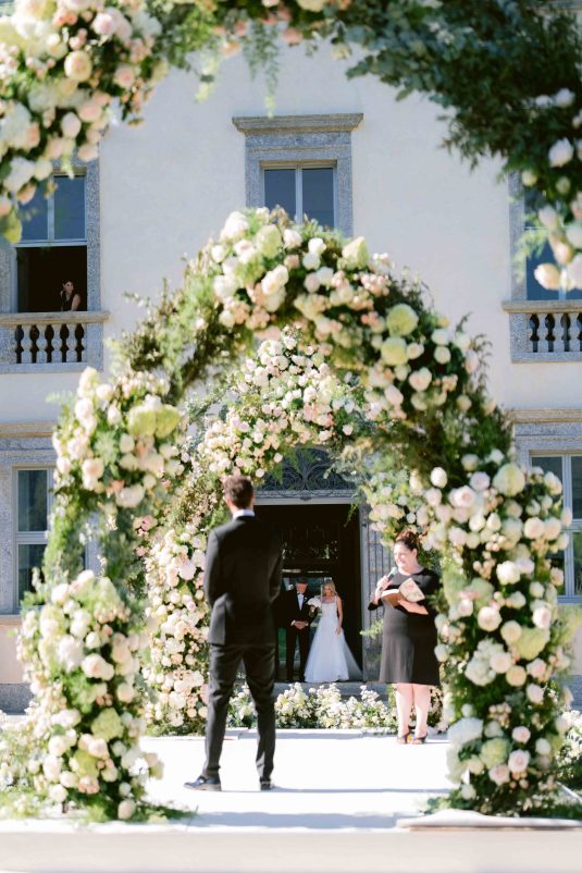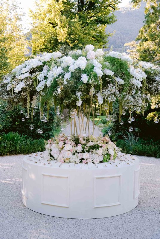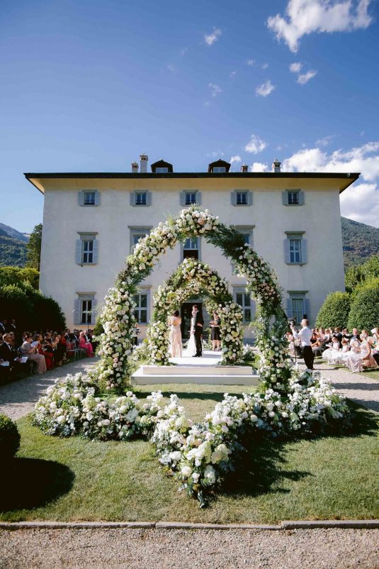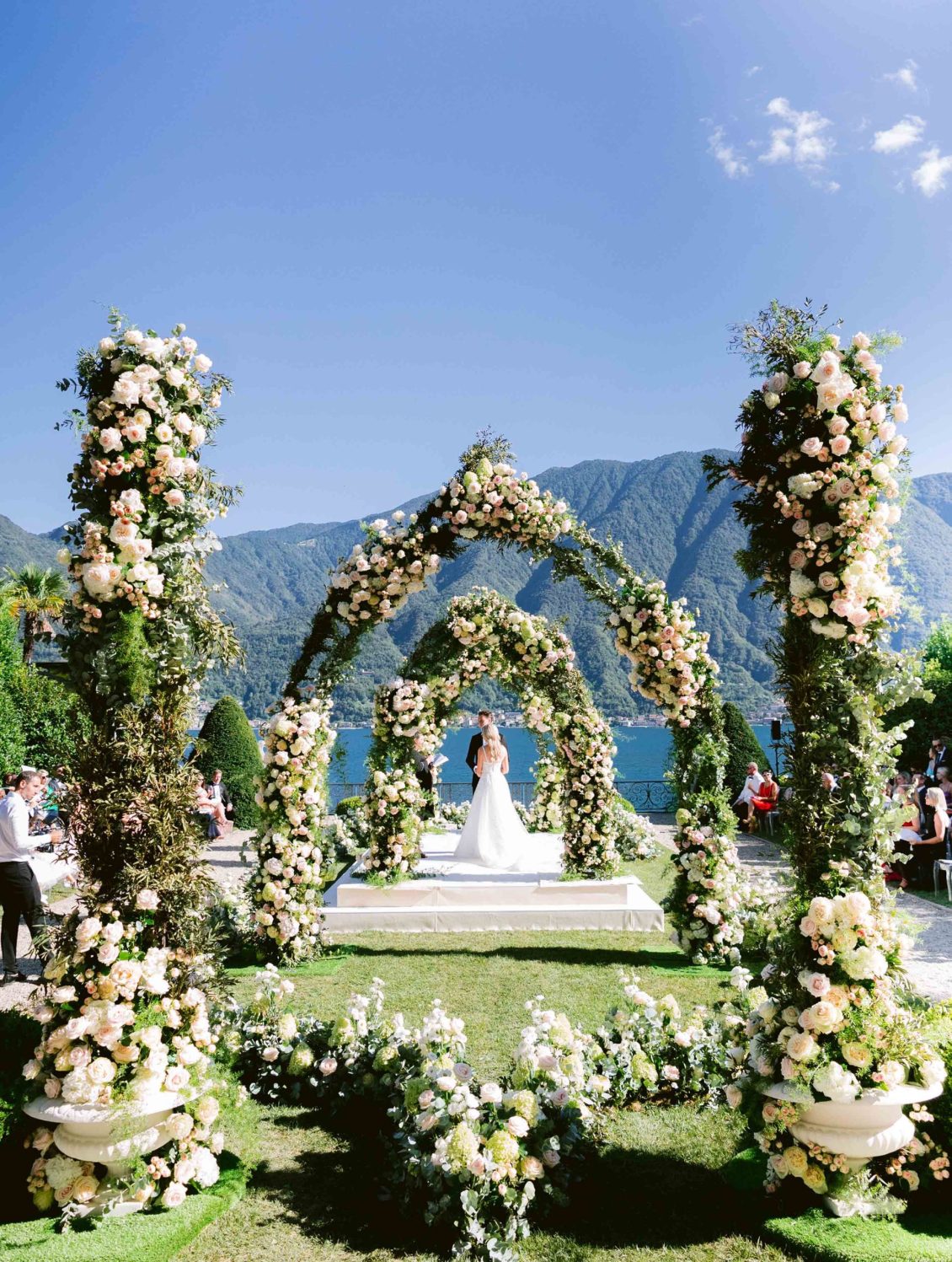 The wedding ceremony took place on the lakefront garden at Villa Balbiano with guests arriving by boat. The dramatic design featured four floral arches made with thousands of blooms by Roni Floral Design, who closely collaborated with Eventoile on the overall design and decor of the wedding day.