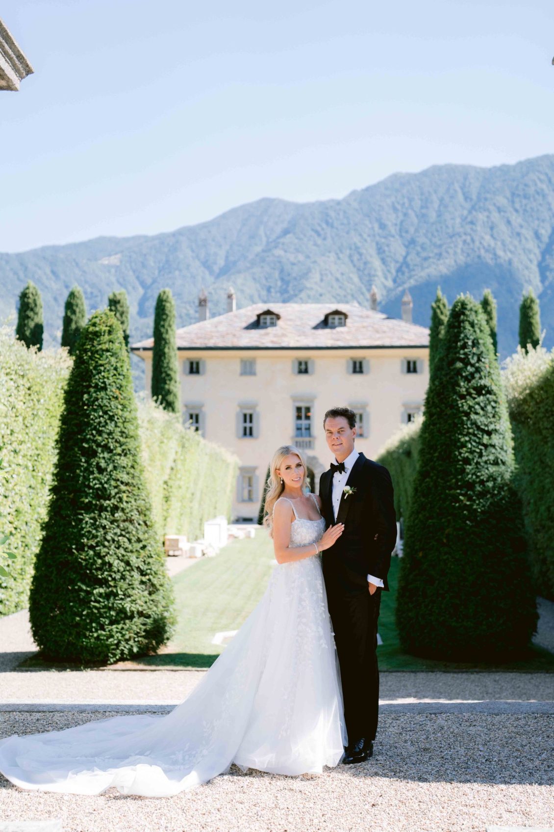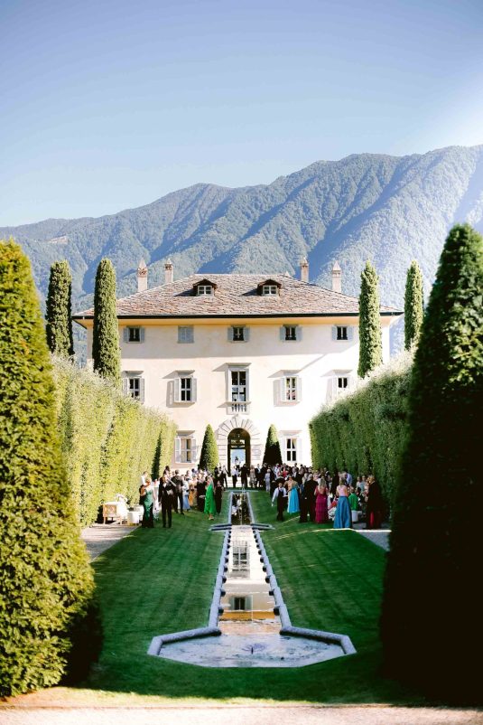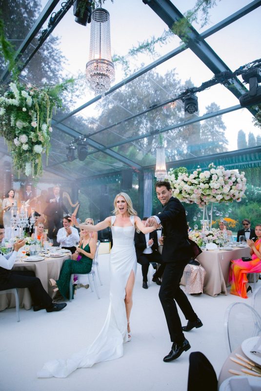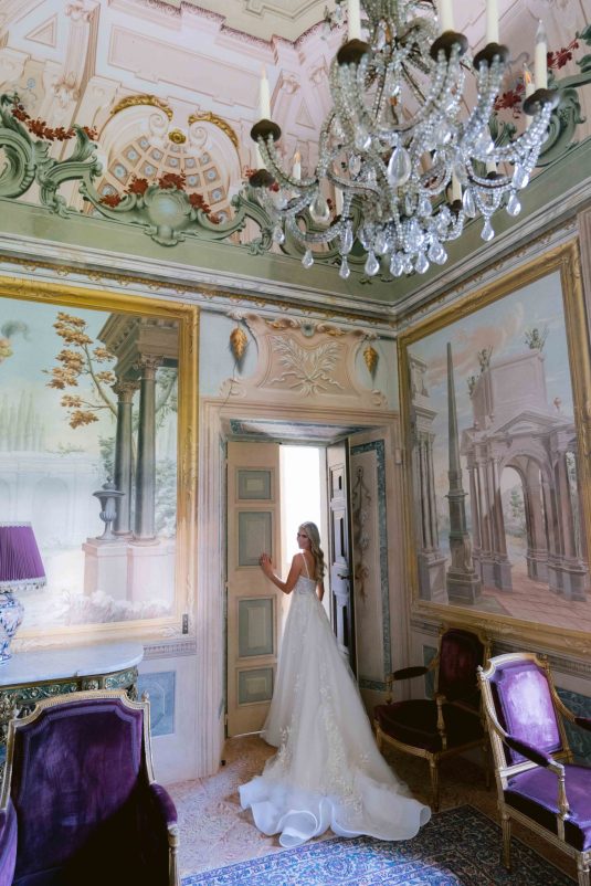 Nestled on the shores of Lake Como, the couple’s wedding venue, Villa Balbiano, boasts a rich history as a 16th-century palazzo turned luxury event space. In its historic heyday, the villa hosted elaborate festivals and dances. Today, it remains the largest private Lake Como residence, with sumptuous gardens that guarantee extraordinary photo opportunities. Villa Balbiano’s gardens have even won the Colson Stone, the British Society of Garden Designers’ top honor for historic garden restoration. Beyond the gardens, the villa features a private pier and boathouse. Inside, its historic interiors overflow with fine art and antique furnishings acquired from Sotheby’s and Christie’s auctions. Most notably, 17th century frescoes by the Recchi brothers and Agostino Silva still adorn the walls, their vibrant colors untouched by time. With such pedigree and amenities, it’s easy to see why Villa Balbiano remains one of Lake Como’s most sought-after event venues.