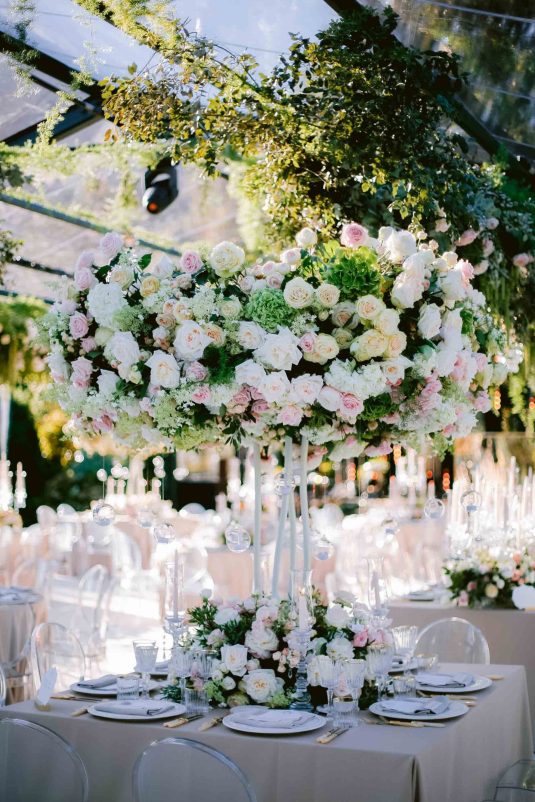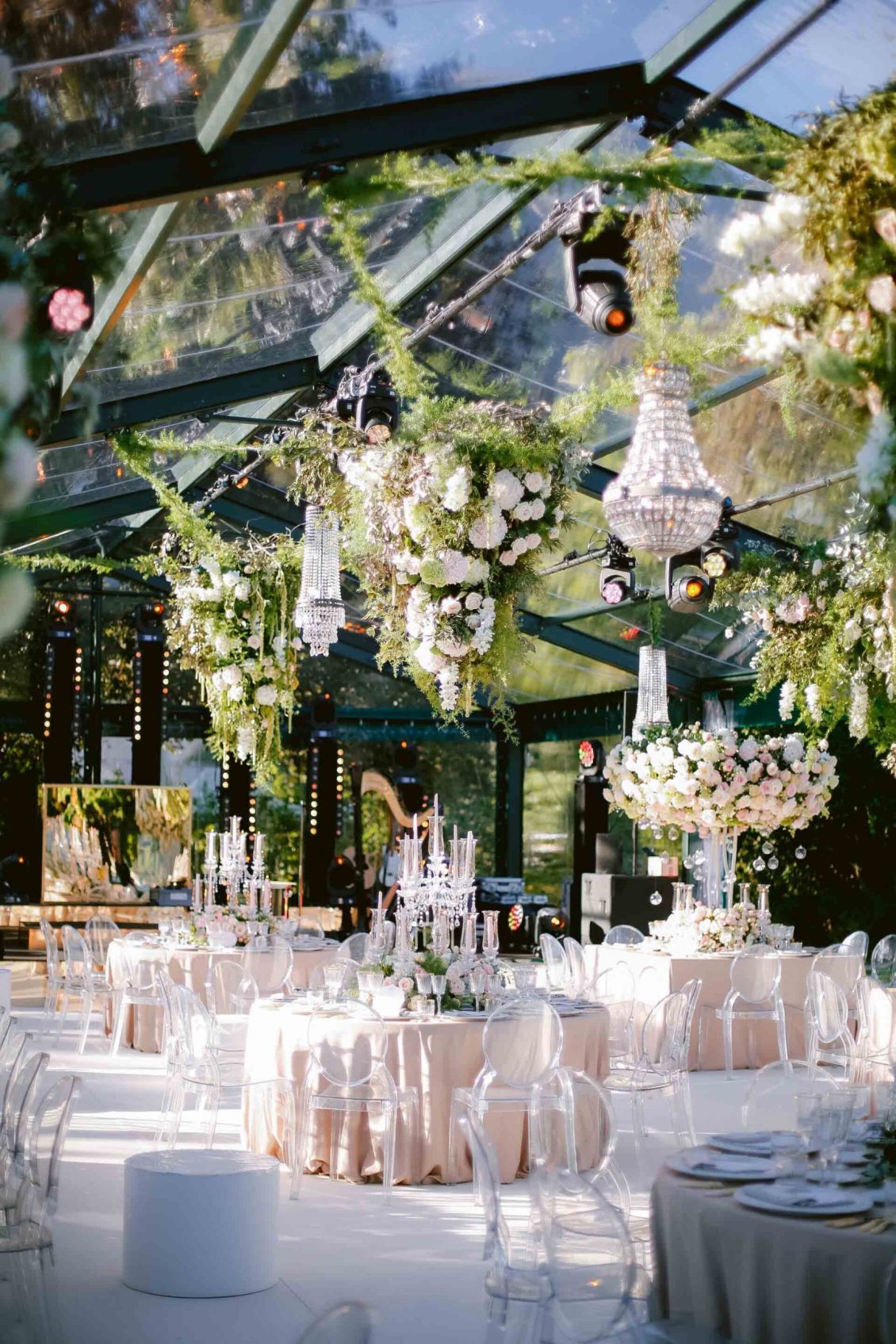 The reception design was a modern fairytale brought to life with oversized floral chandeliers and canopies of fragrant greenery designed by Roni Floral Design. LatiniDesign provided furniture rentals for the weekend. Le Coperture provided the marquee tent for the reception.