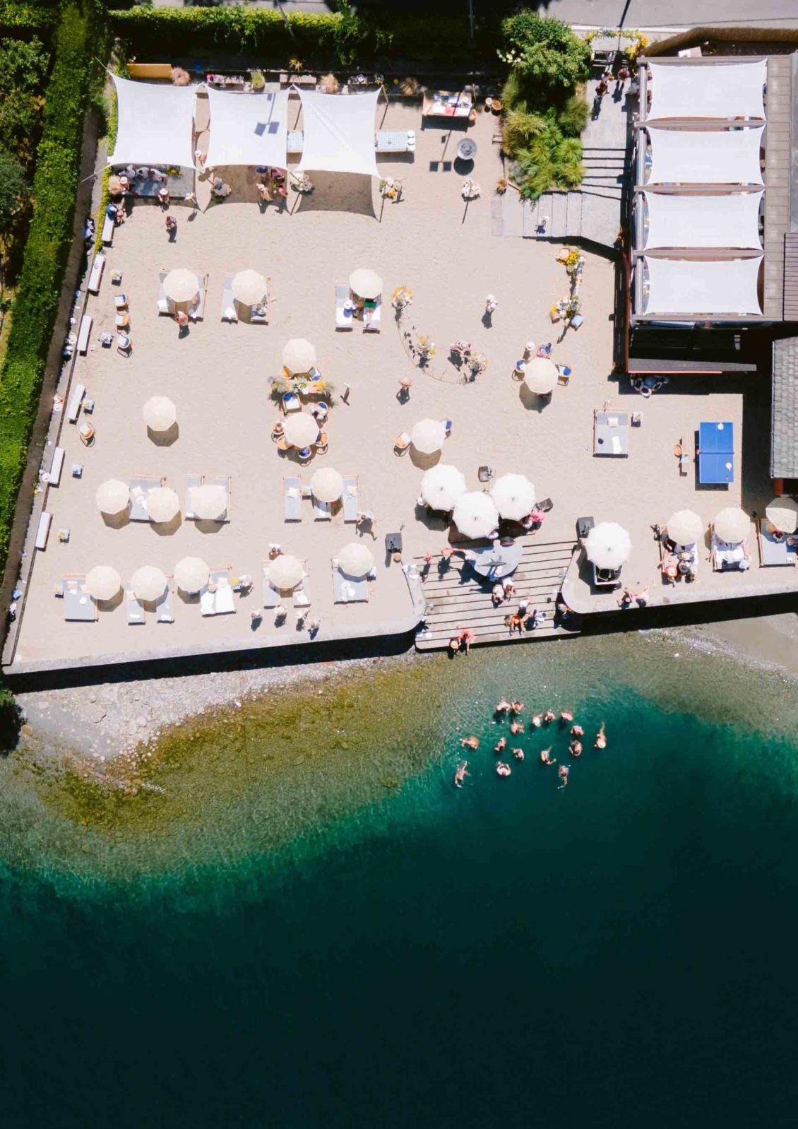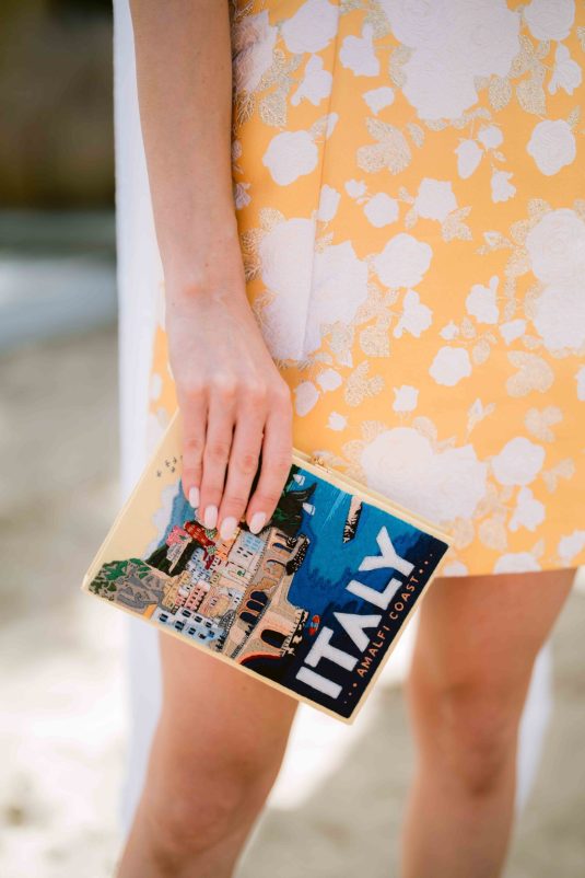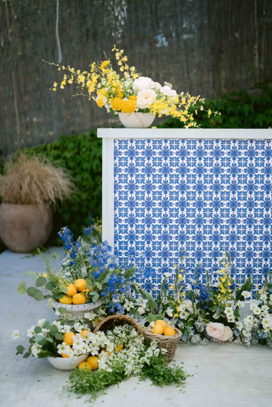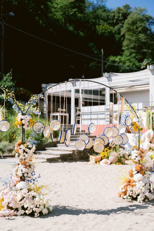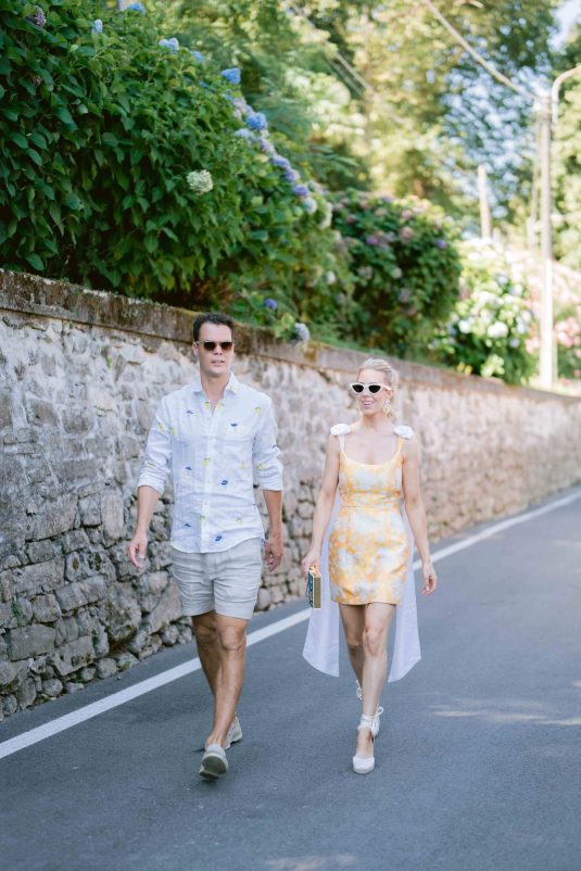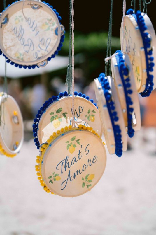 The farewell brunch, held at Lido Di Lenno Beach Club, featured floral design by Chiara Sperti Floral Events, and highlighted the couple’s love for Italy. The decor featured bright colors, lemons, and Majolica motifs. Custom tambourines, hats, and towels were offered to guests as keepsakes.