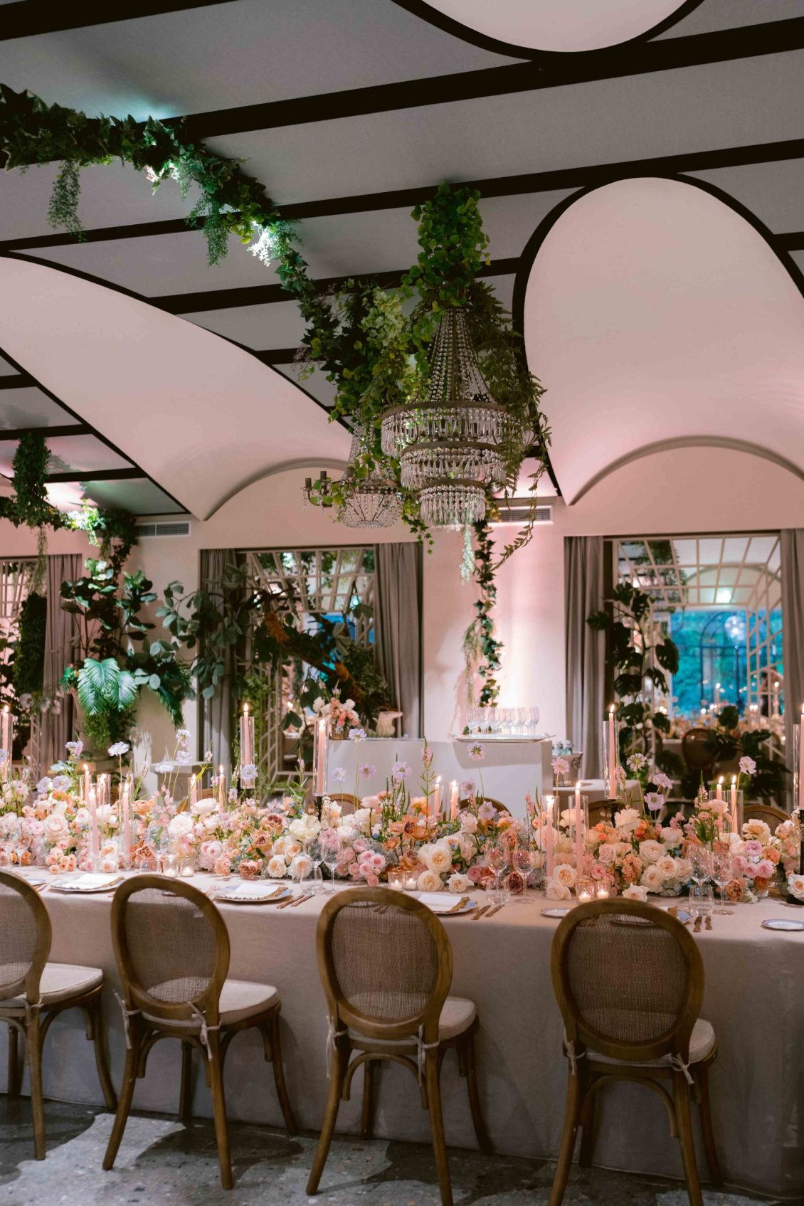 The rehearsal dinner was held at the legendary Grand Hotel Tremezzo, known for its Belle Époque history and scenic location on the shores of Lake Como. The property faces directly onto the village of Bellagio, where the two branches of Lake Como meet against the rose-tinted backdrop of the Grigne mountains. The evening’s decor palette of powder pink and light blue was inspired by the venue.