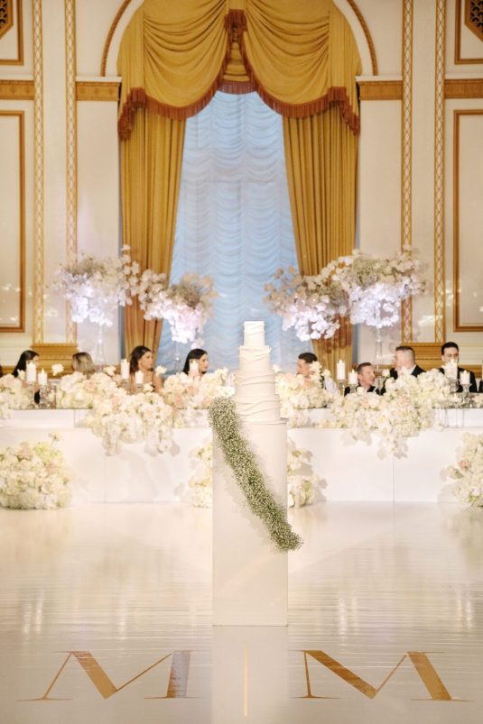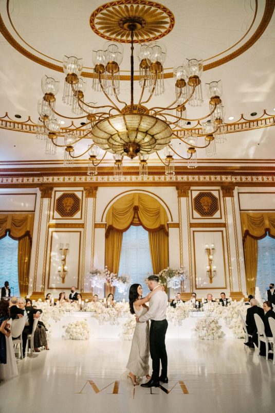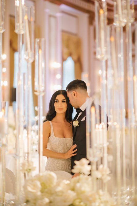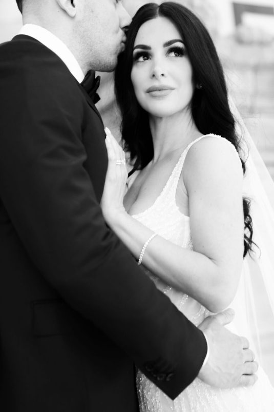It had been a dream of Maria’s to wear a gown by the Australian design house Pallas Couture. Alongside her mother and sister, she traveled to New York to attend the designer’s trunk show in search of the perfect gown and found it. On the wedding day, she wore her dream dress with diamond accessories gifted to her by Marco. Her bracelet was gifted to her the morning of the wedding day.