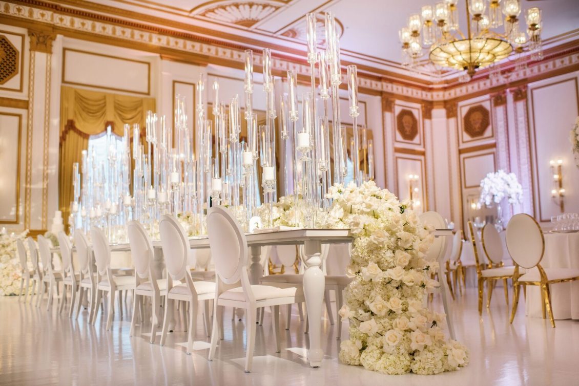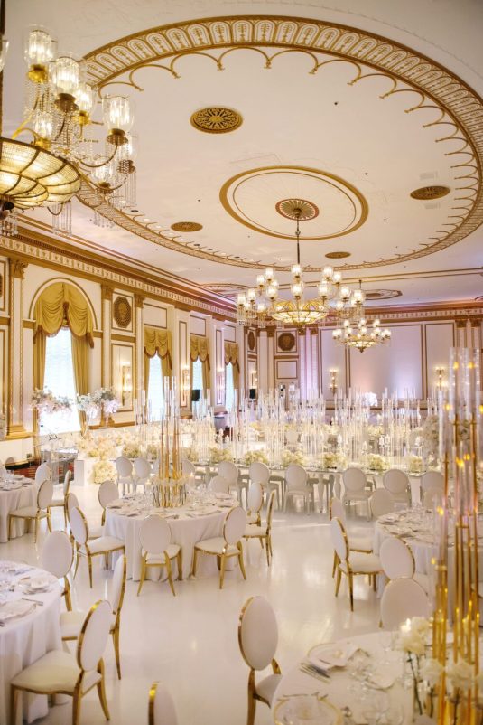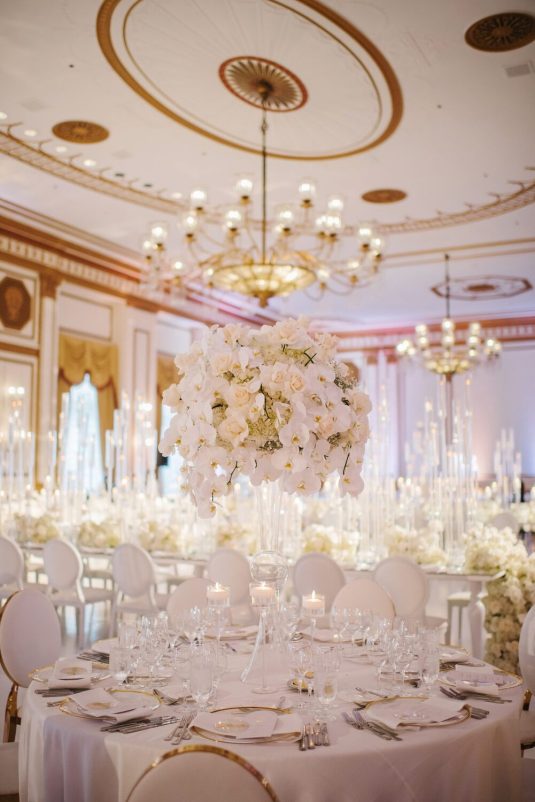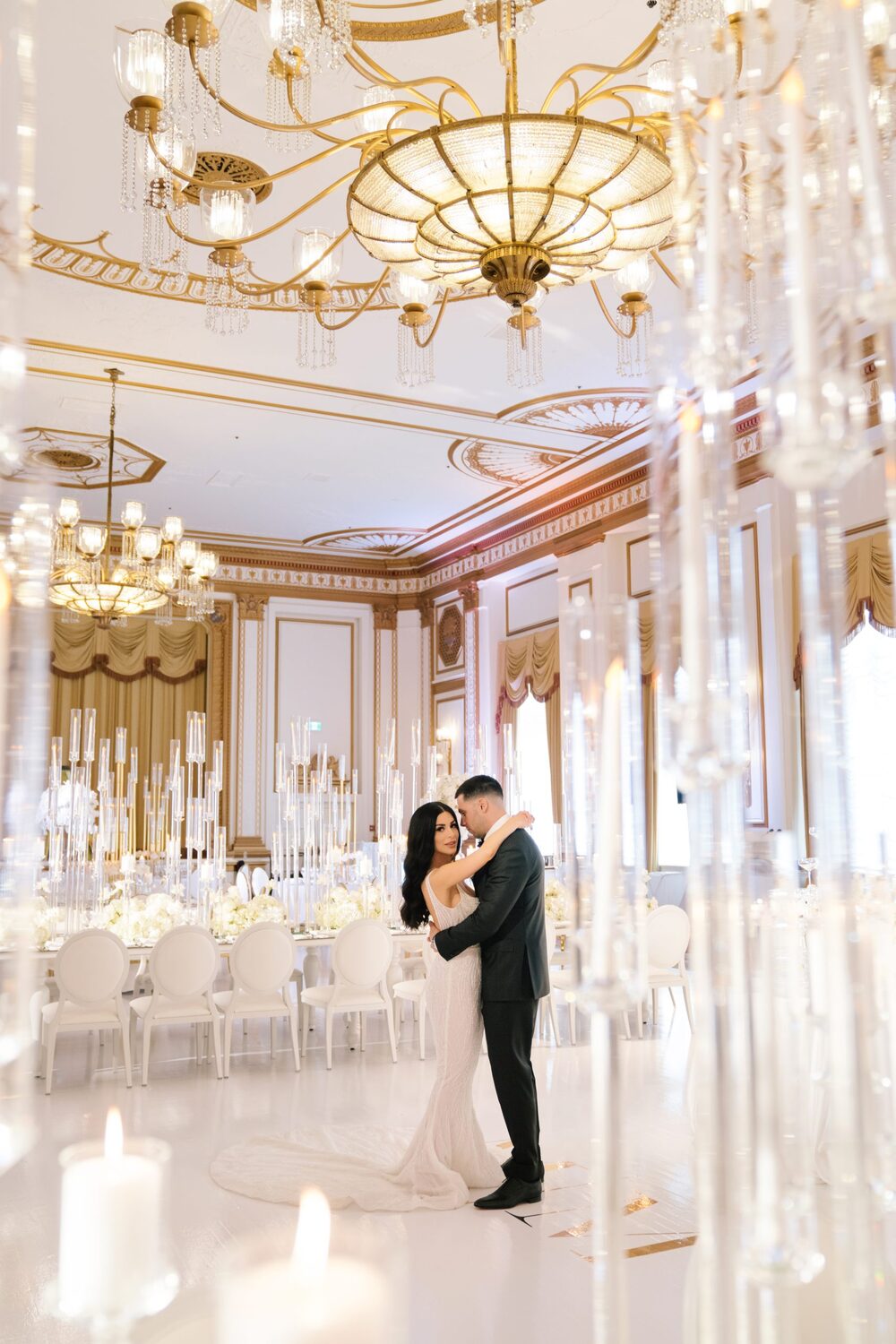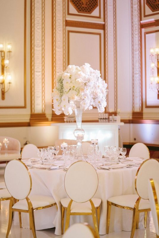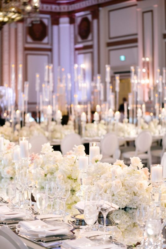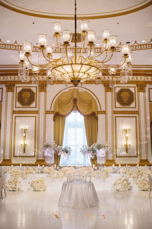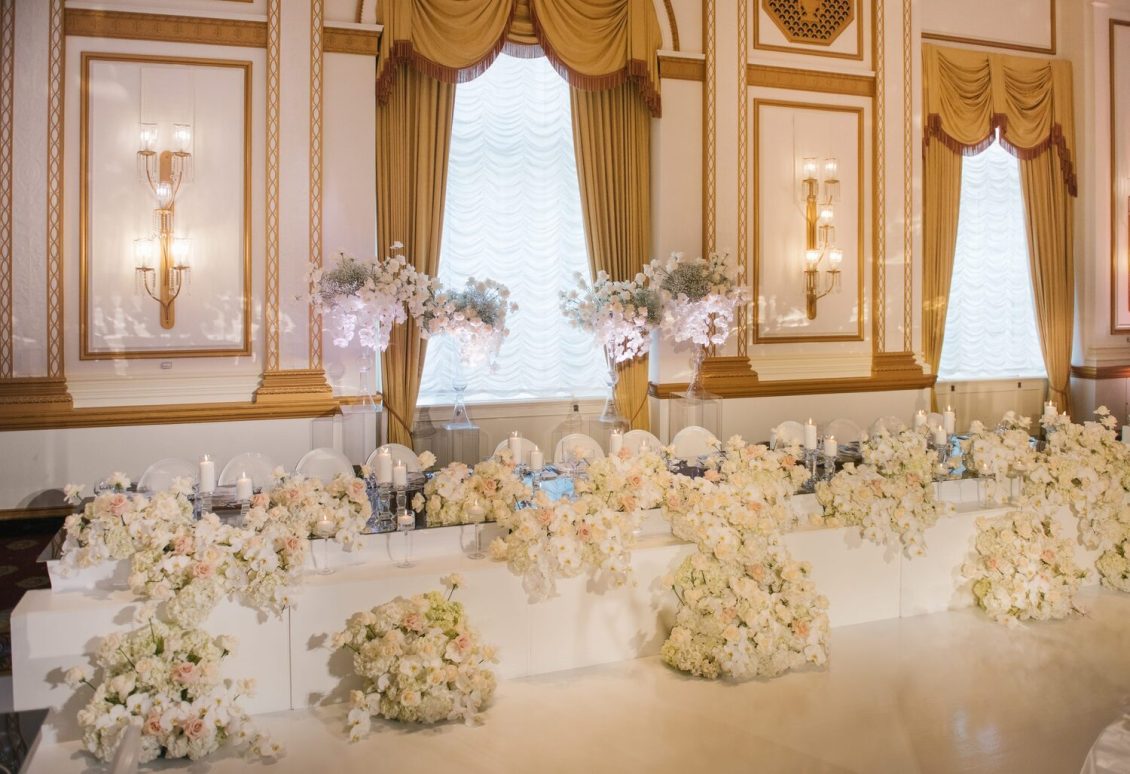 The reception took place at the Fairmont Hotel Vancouver. The Pacific Ballroom absolutely sparkled with a white and gold design that incorporated dreamy florals and hundreds of candles.