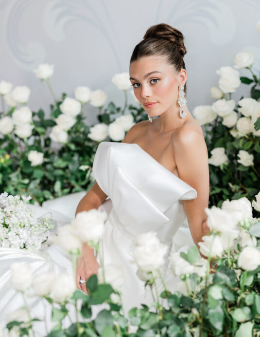 wearing a custom gown by Toronto bridal gown designer Erin Caravaggio of