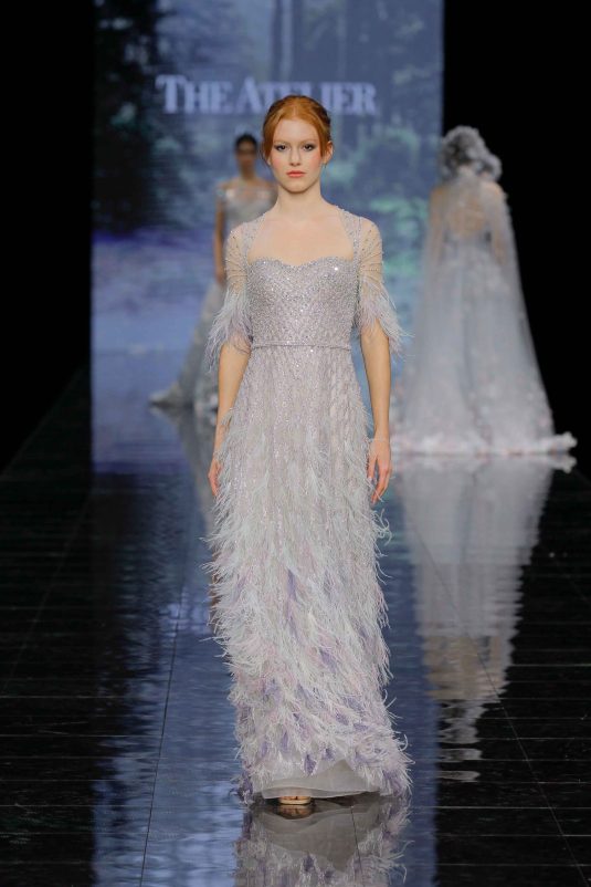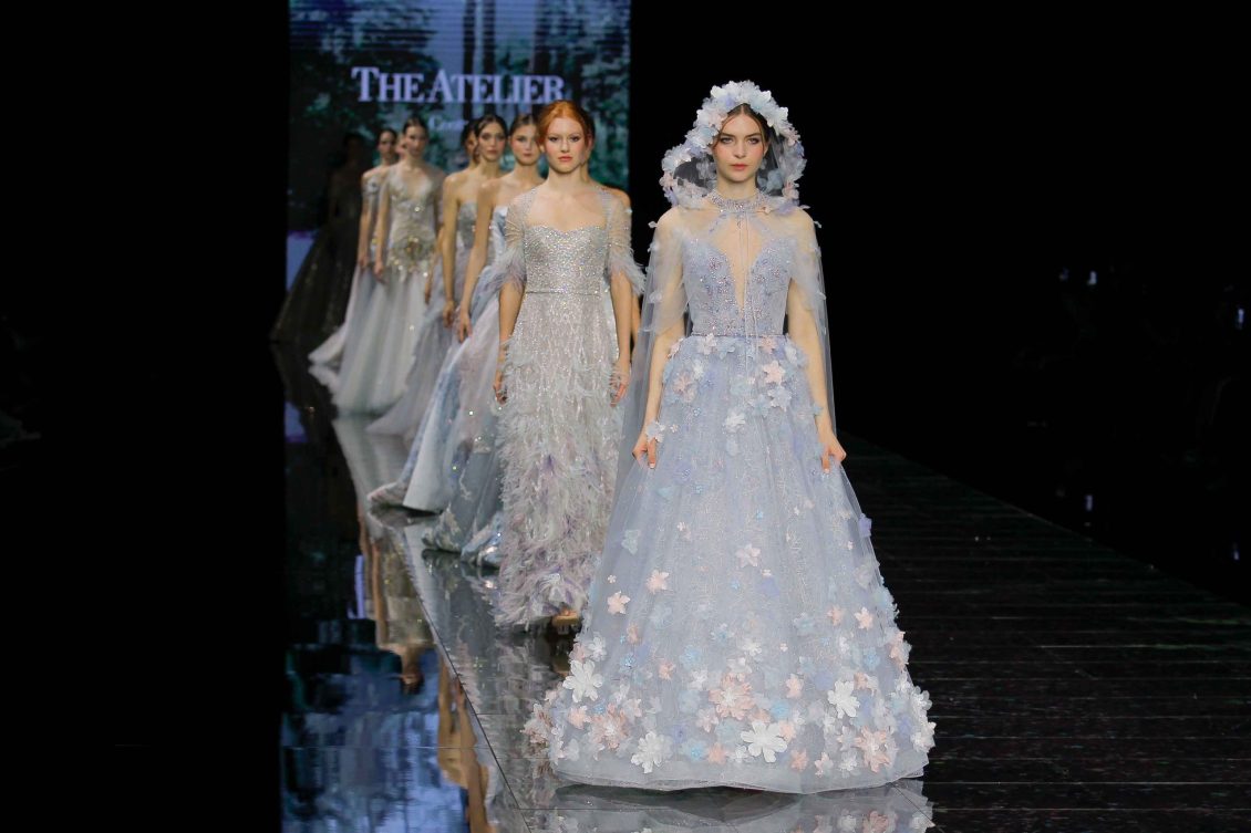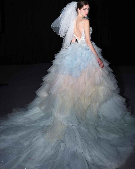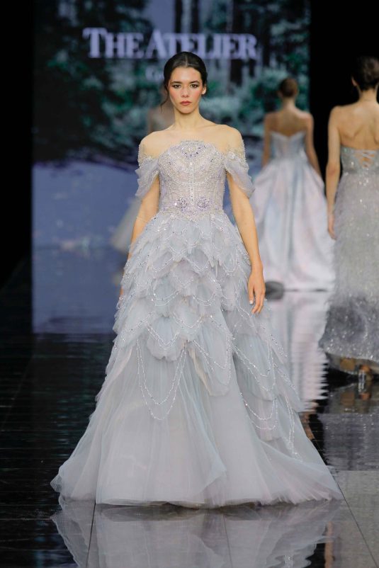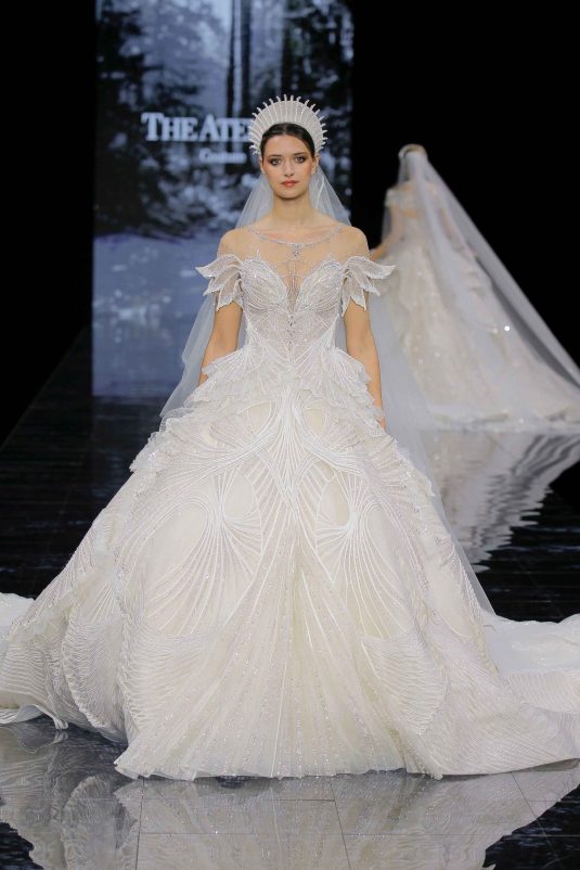 The collection has been inspired by this amazing poet that speaks of love but also refers to the beauties in nature, and so we worked to create a collection where elements of nature, the birds, and the luxurious green could be found. Some gowns resemble paradise bird feathers, and the colors go from light champagne to baby blue, pink, and green. Details of the poem can be found embroidered in the dresses.