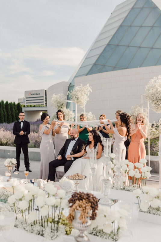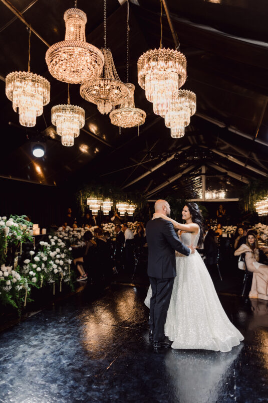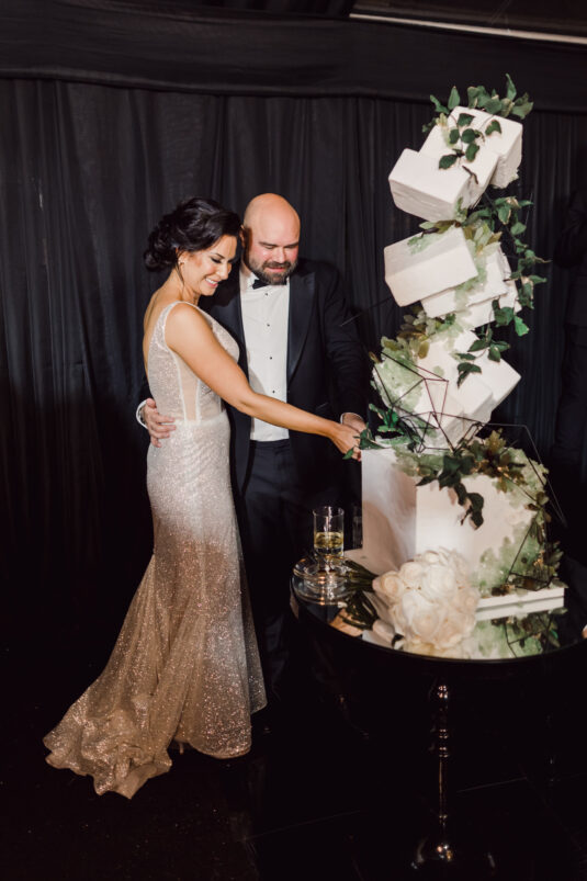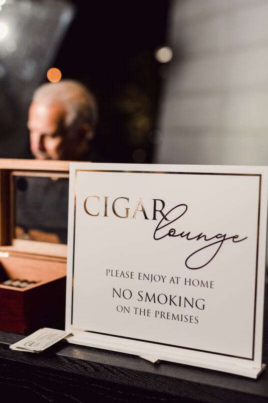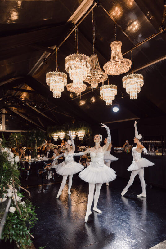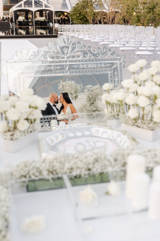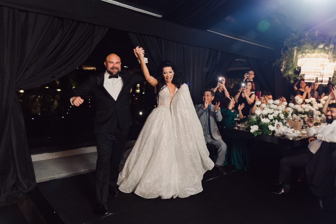 The wedding reception included all of the traditional elements such as the father-daughter dance and bouquet toss, while also showcasing experiential entertainment in the form of ballet dancers and an interactive cigar bar. A DJ and live band played a mix of Persian music with songs requested by the groom.