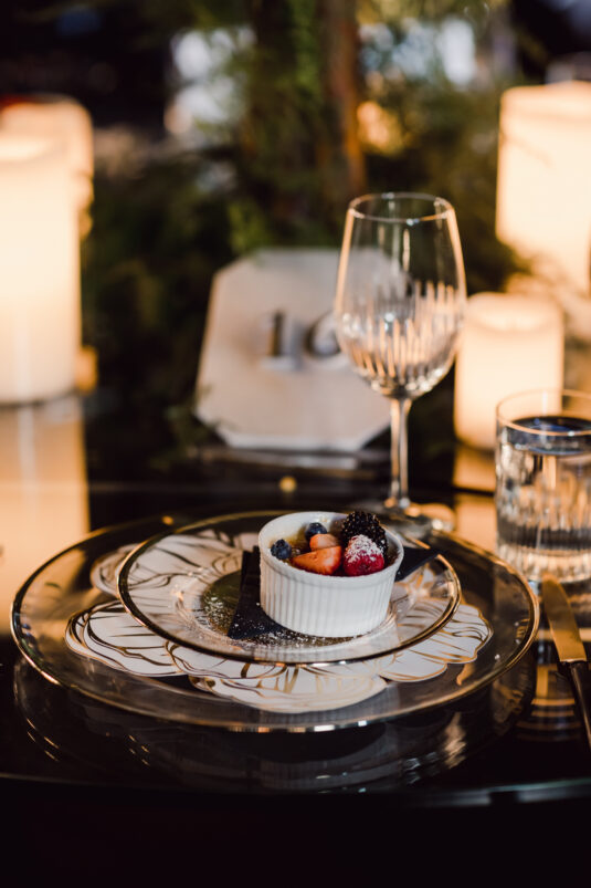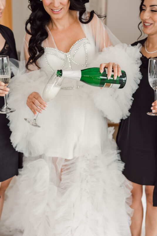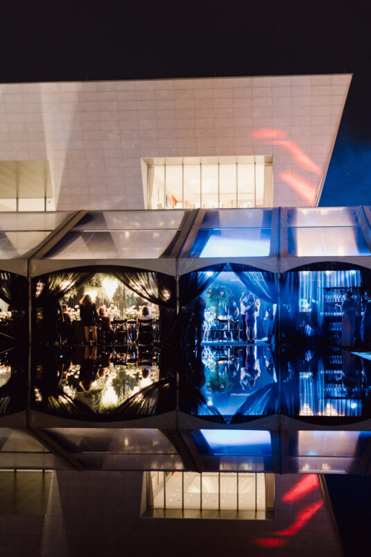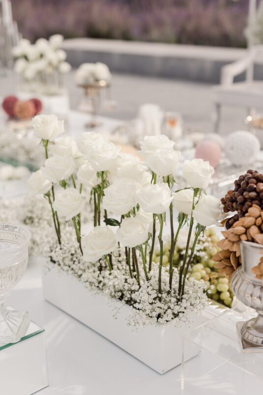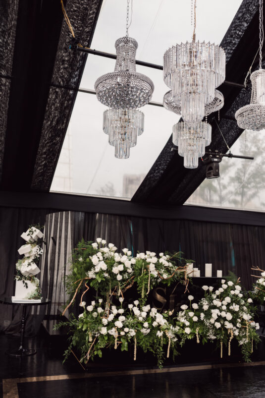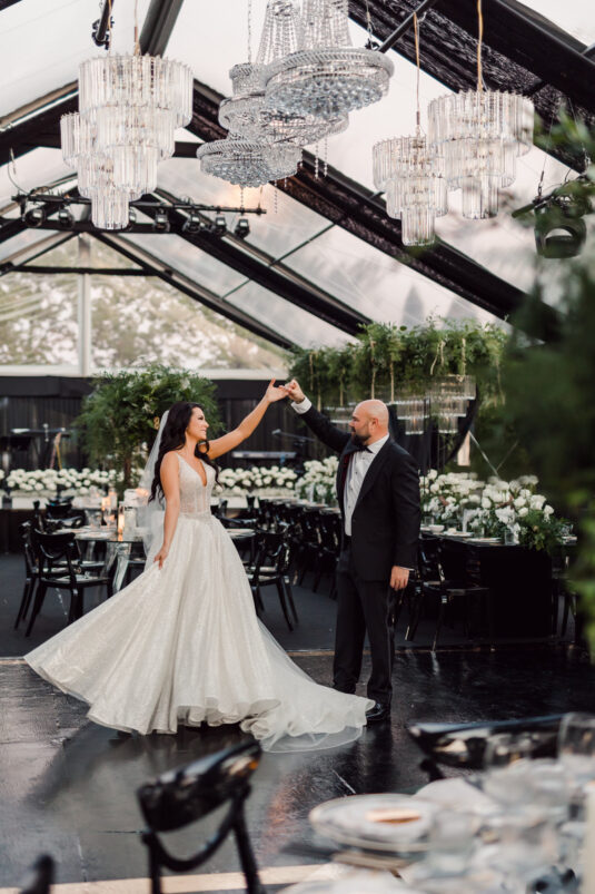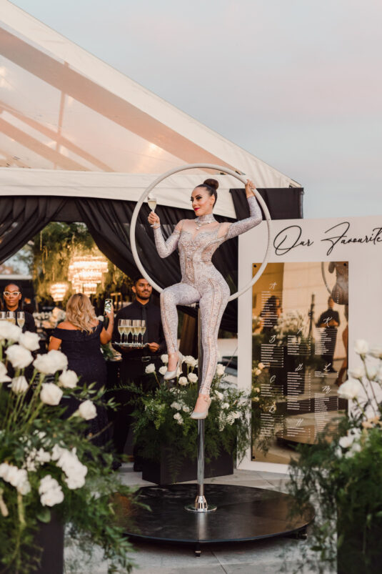 The wedding reception included all of the traditional elements such as the father-daughter dance and bouquet toss, while also showcasing experiential entertainment in the form of ballet dancers and an interactive cigar bar. A DJ and live band played a mix of Persian music with songs requested by the groom.