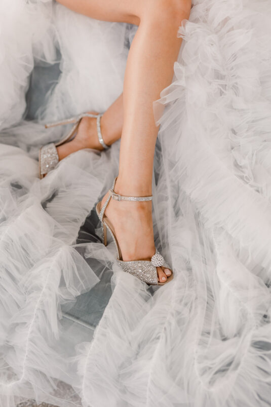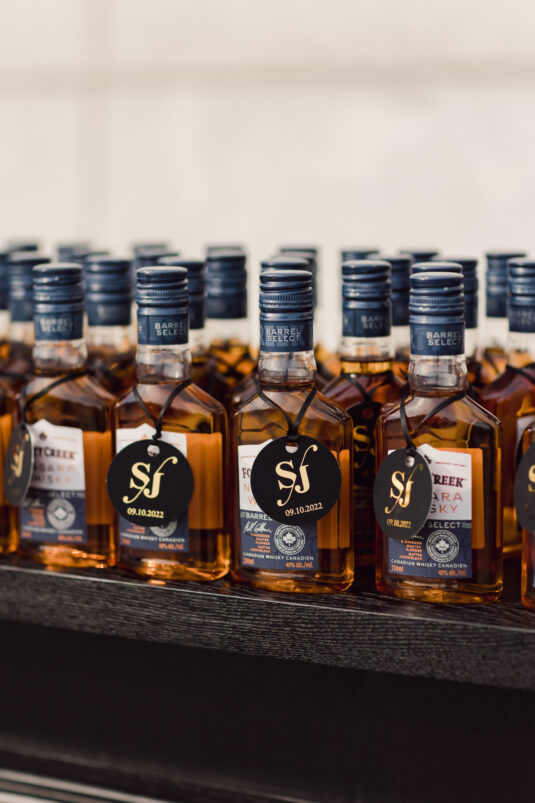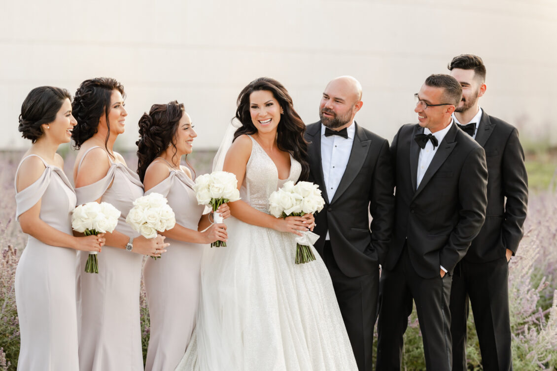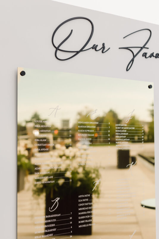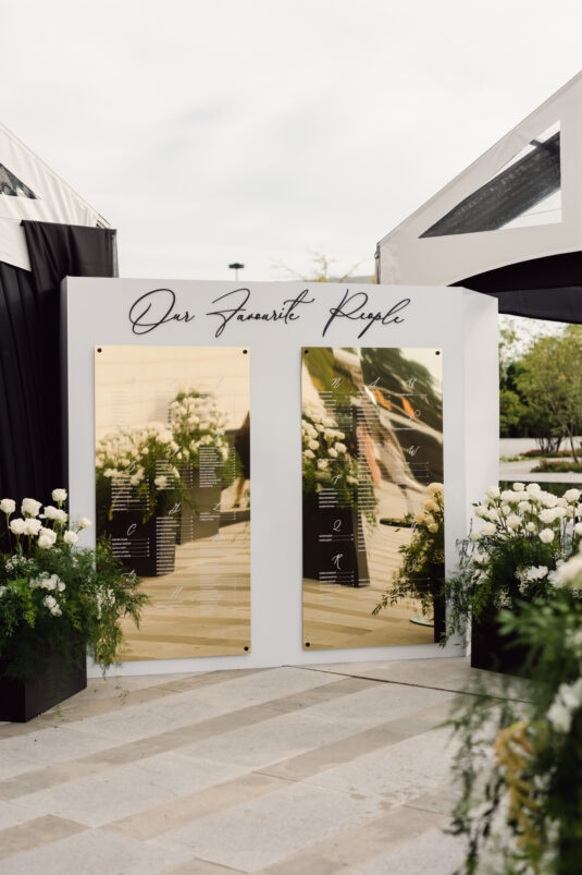 Cocktail hour took place at sunset, which reflected the beautiful evening light around the reflective ponds of the venue. During this time, guests enjoyed passed appetizers and an oyster bar while the bride and groom enjoyed a portrait session with Purple Tree Photography. So Pretty in Print designed the gold mirrored seating chart.