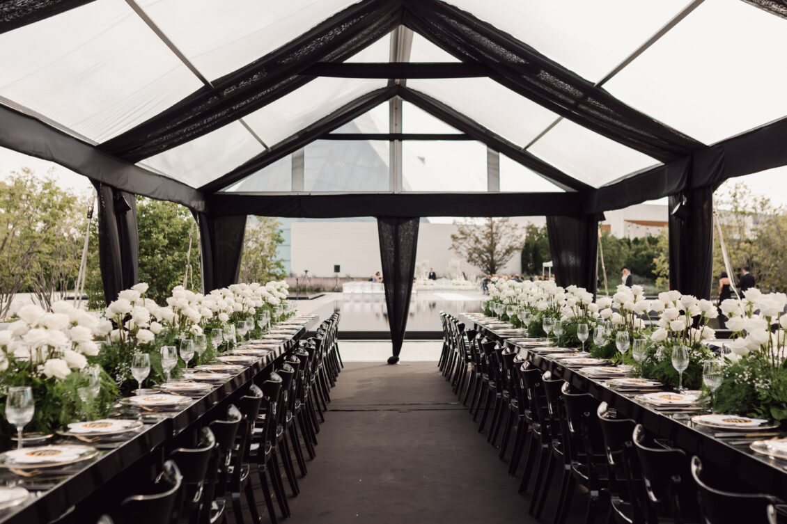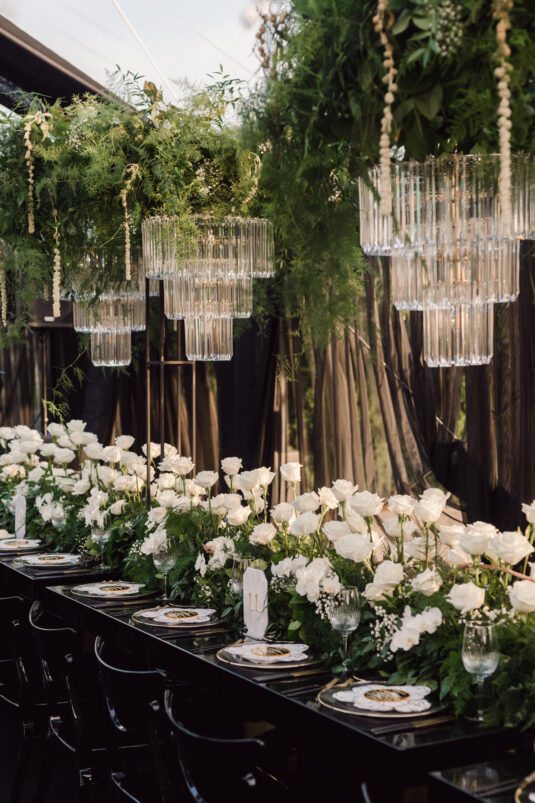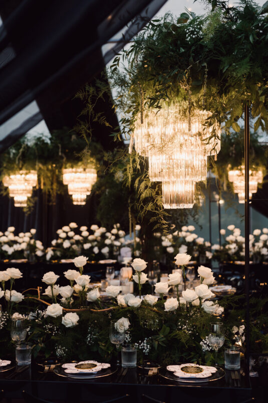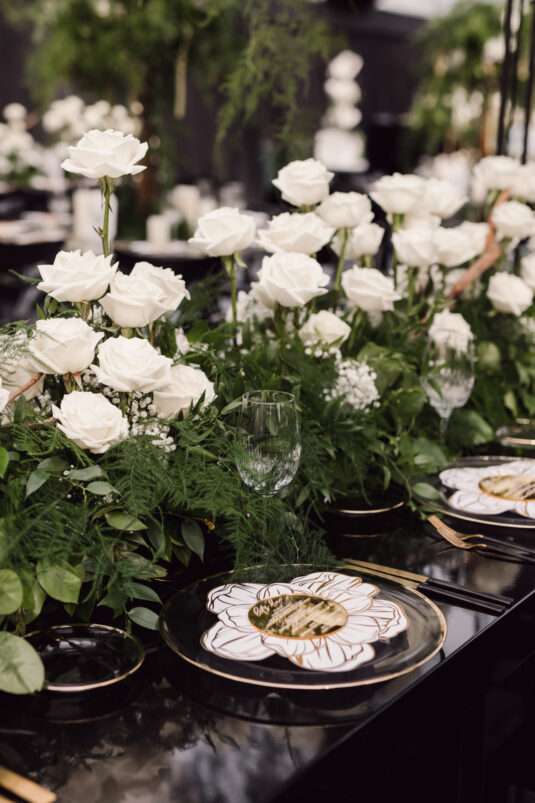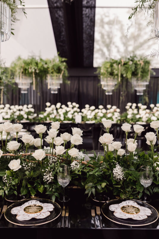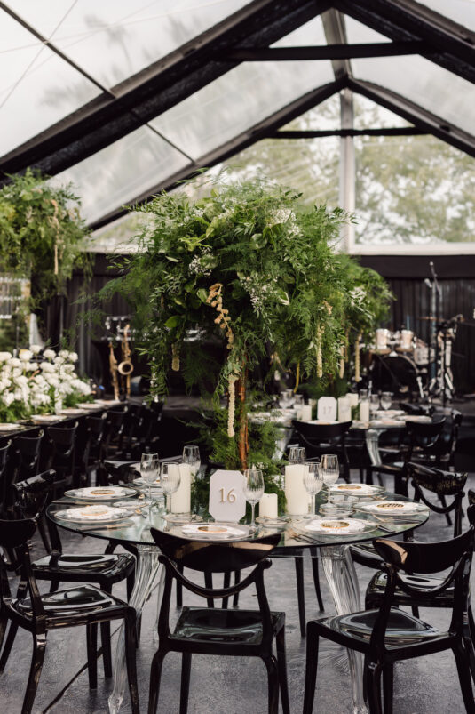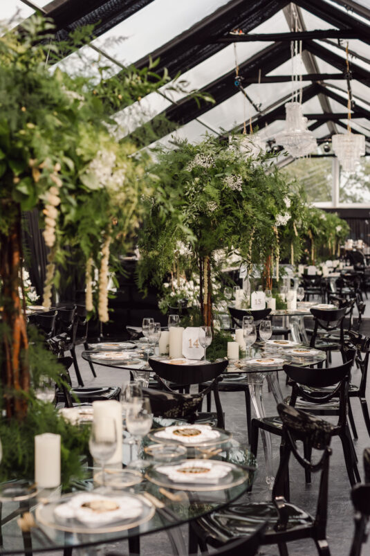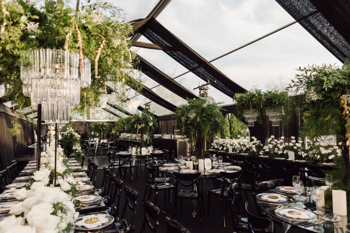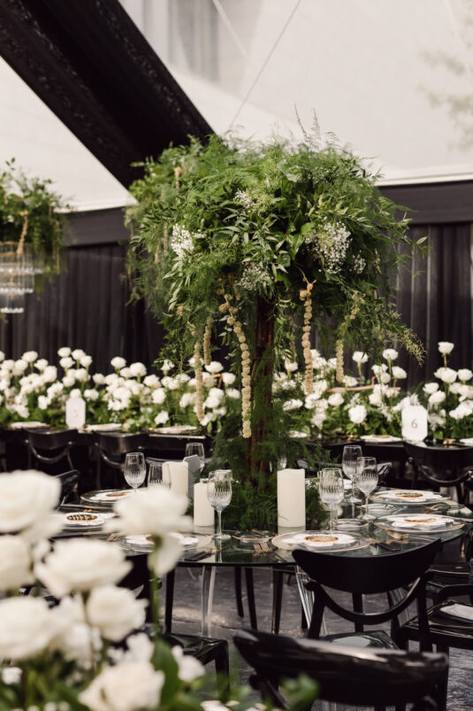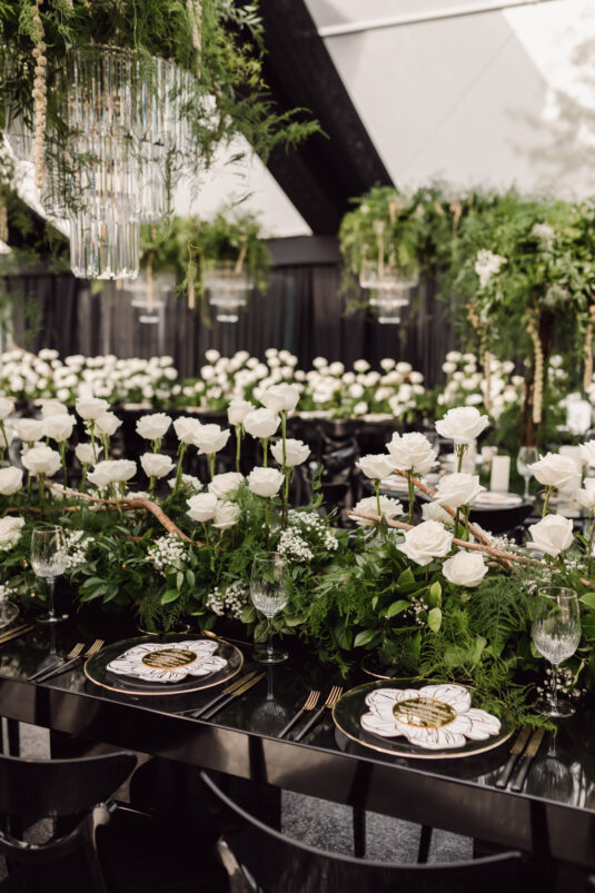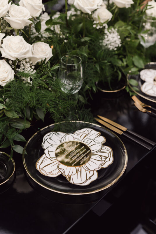 In contrast with the light and airy ceremony, the wedding reception, held in two tents, was designed with an enchanted garden theme using lush greenery and black decor. Henna Florist provided florals for the wedding. Both tents were from Premier Event Tent Rentals. All day-of stationery was designed by So Pretty in Print, including the flower-shaped menu with a gold mirrored center and white and gold petals. The table numbers were created with tactile velvet.
