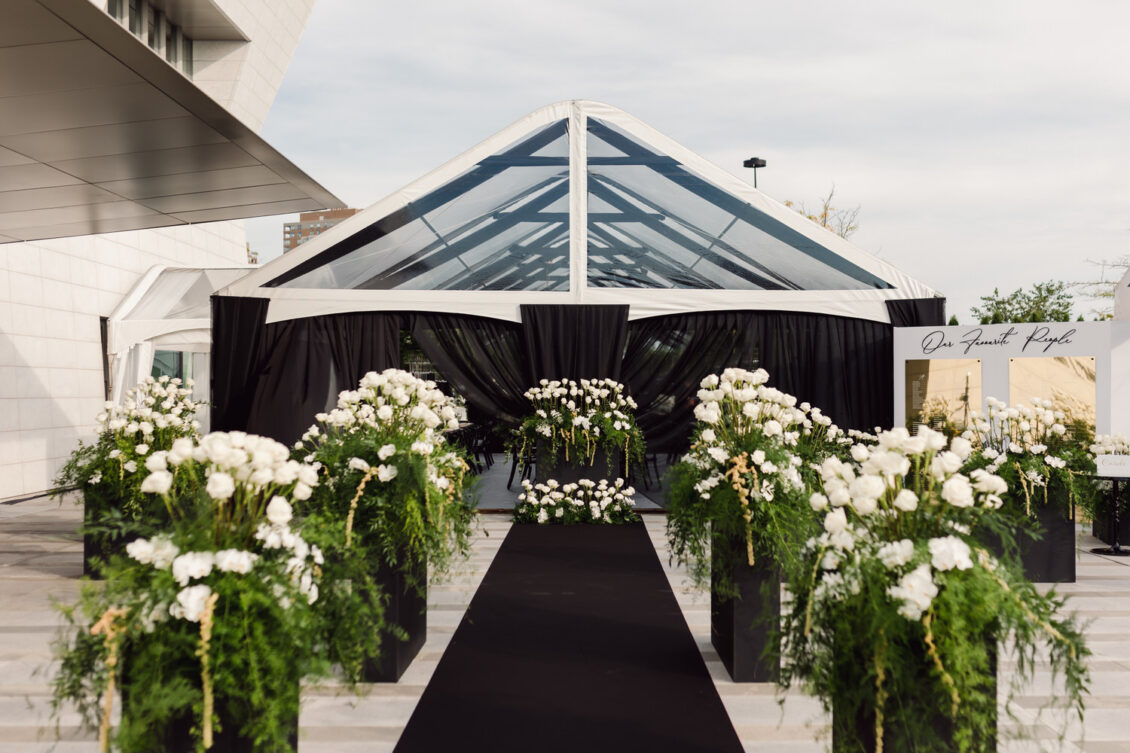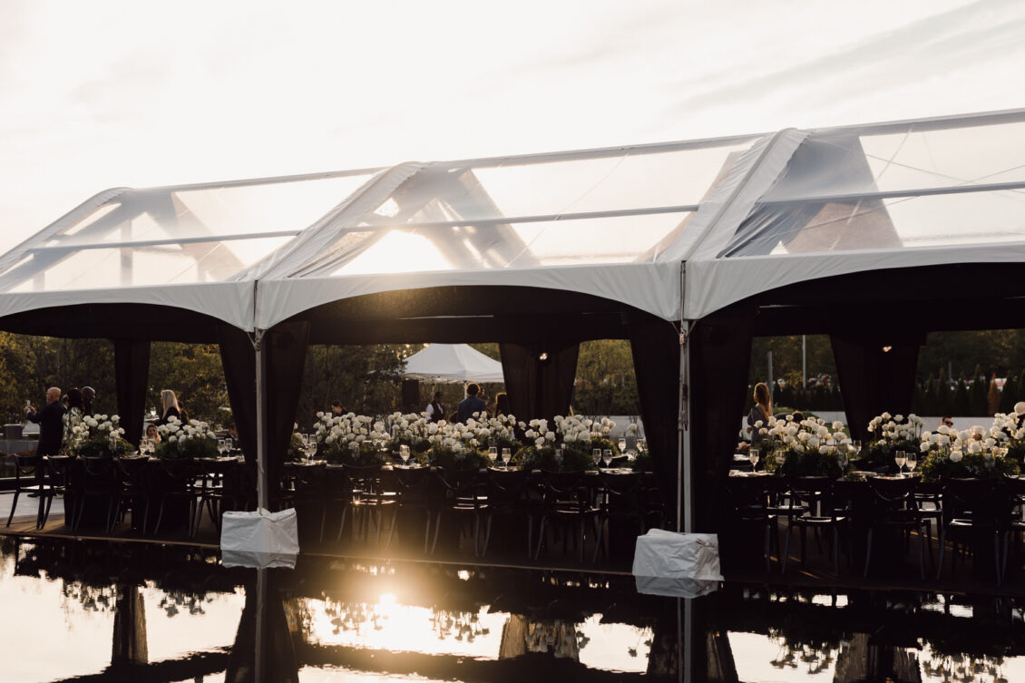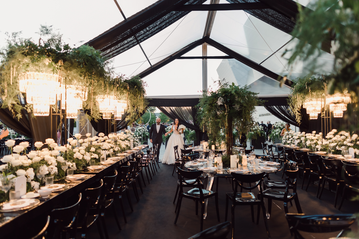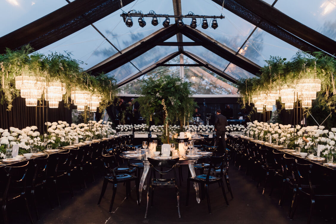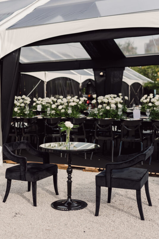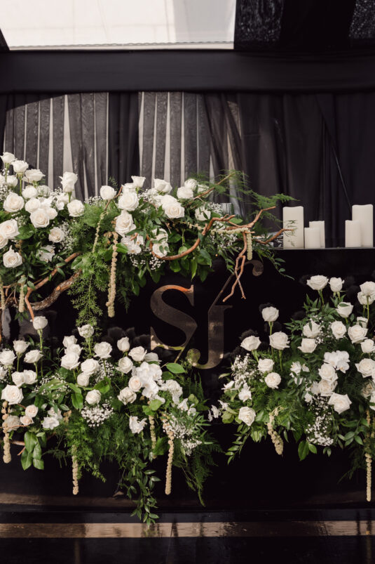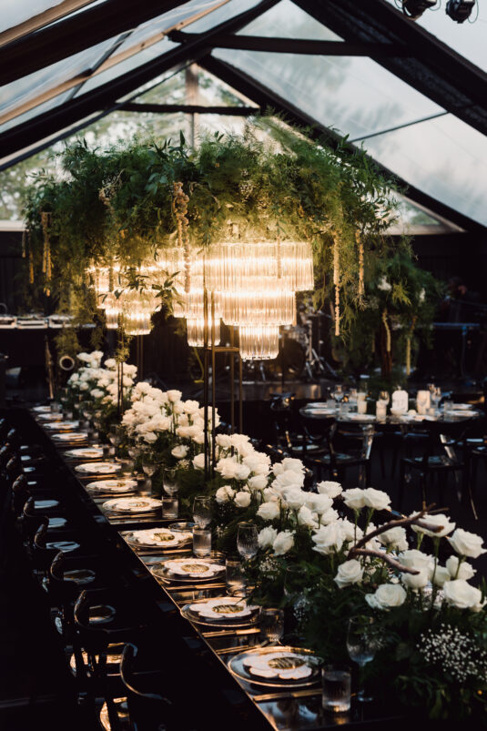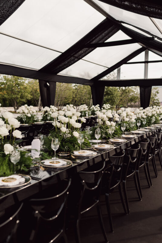 In contrast with the light and airy ceremony, the wedding reception, held in two tents, was designed with an enchanted garden theme using lush greenery and black decor. Henna Florist provided florals for the wedding. Both tents were from Premier Event Tent Rentals. All day-of stationery was designed by So Pretty in Print, including the flower-shaped menu with a gold mirrored center and white and gold petals. The table numbers were created with tactile velvet.