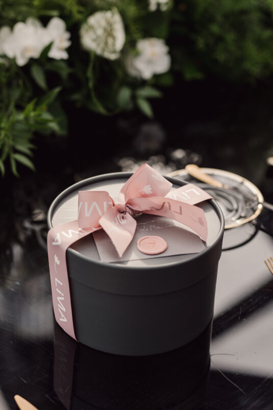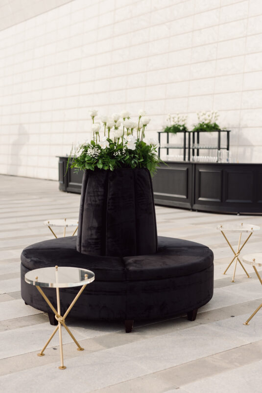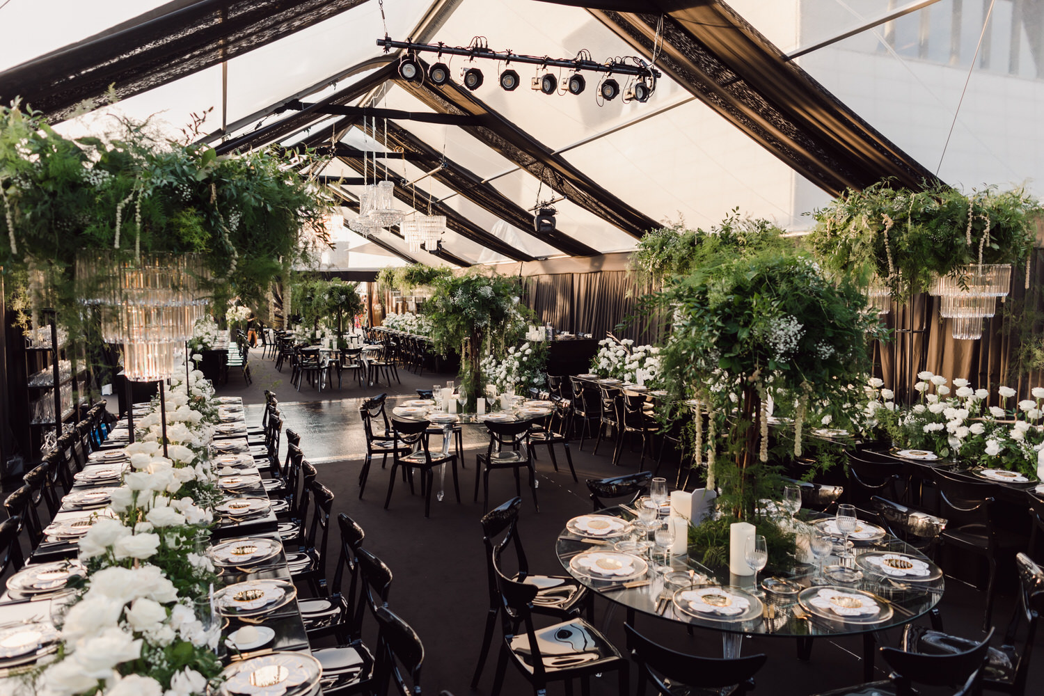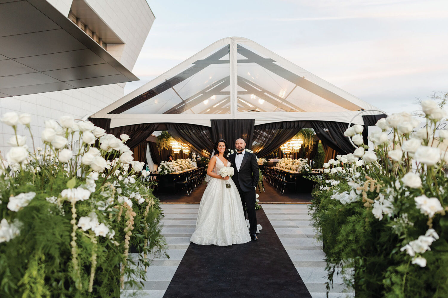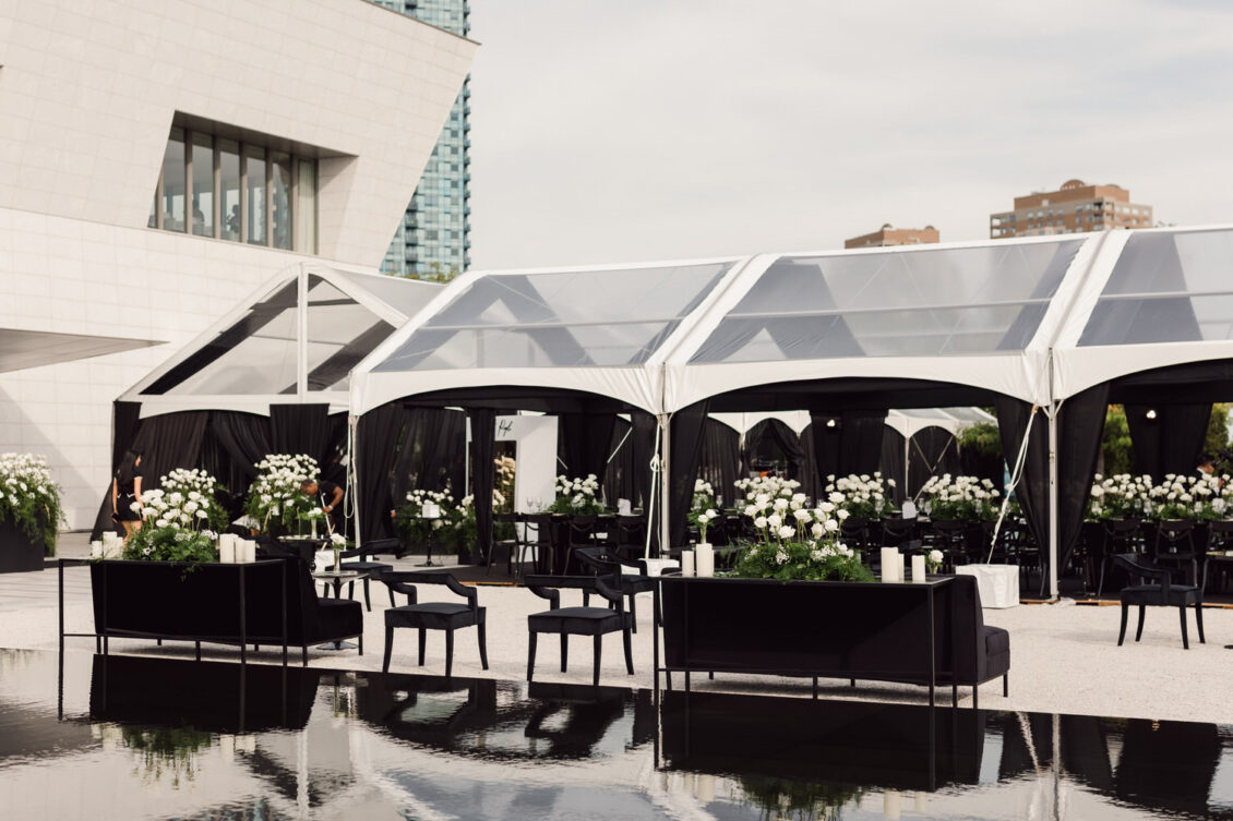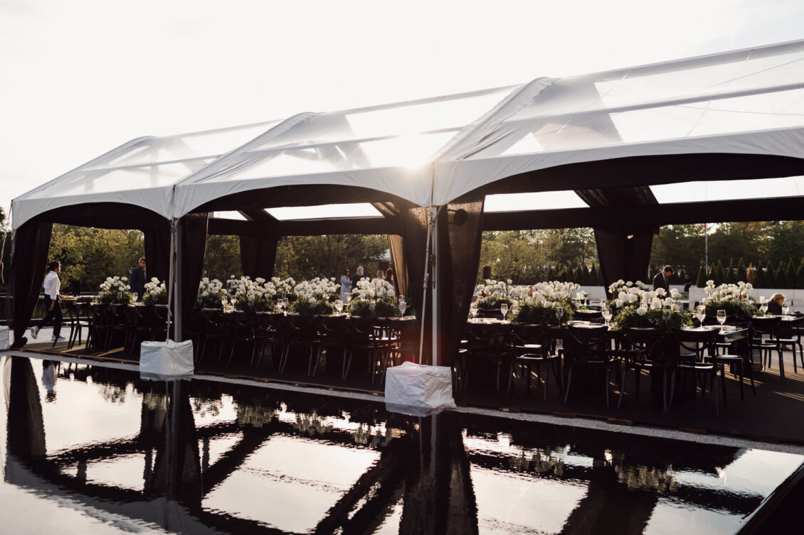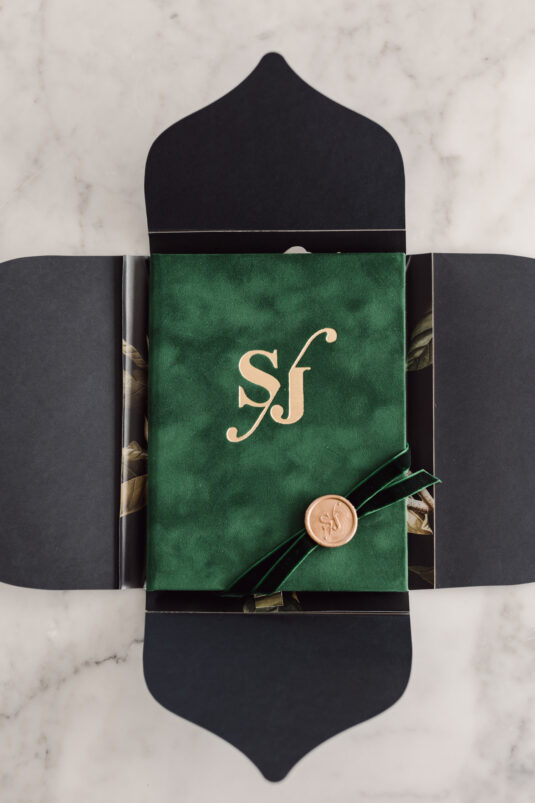 In contrast with the light and airy ceremony, the wedding reception, held in two tents, was designed with an enchanted garden theme using lush greenery and black decor. Henna Florist provided florals for the wedding. Both tents were from Premier Event Tent Rentals. All day-of stationery was designed by So Pretty in Print, including the flower-shaped menu with a gold mirrored center and white and gold petals. The table numbers were created with tactile velvet.