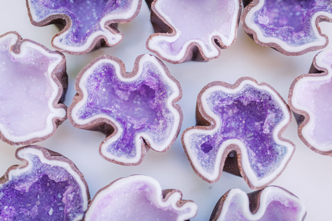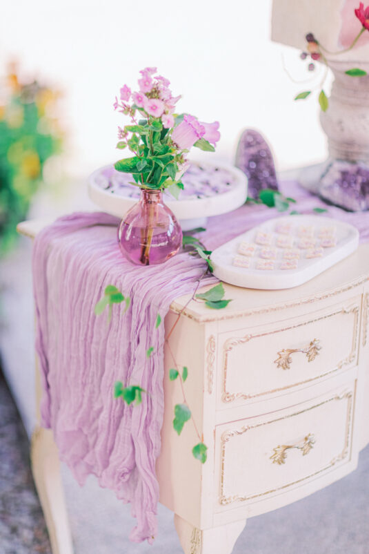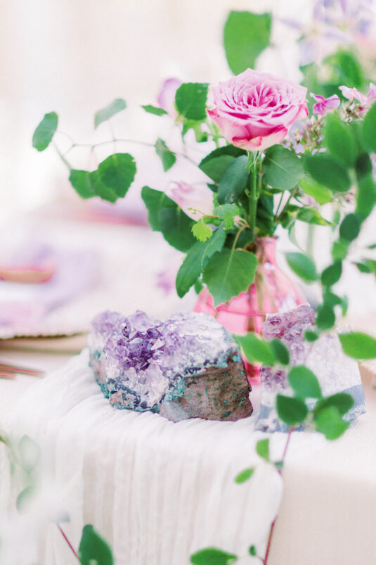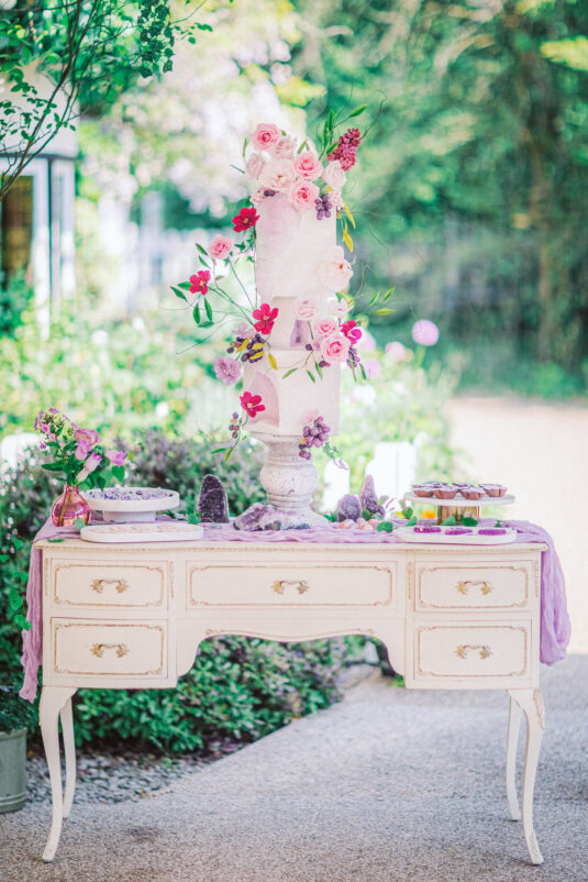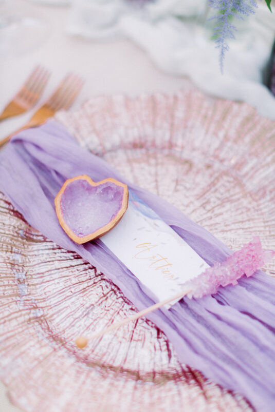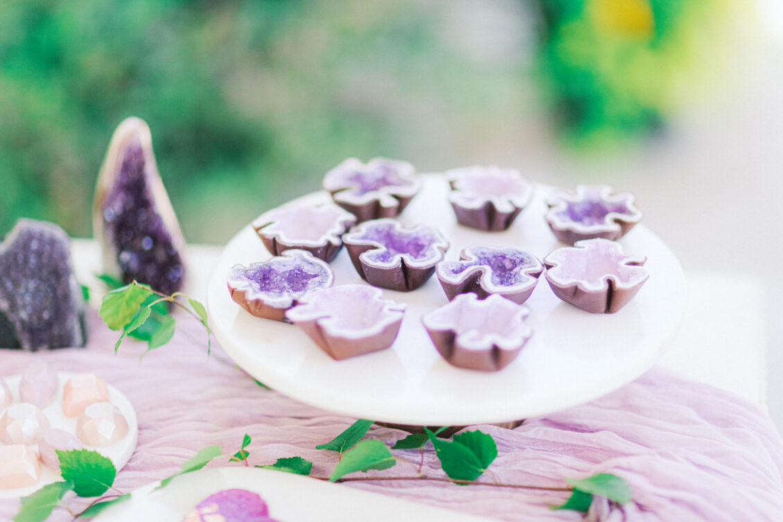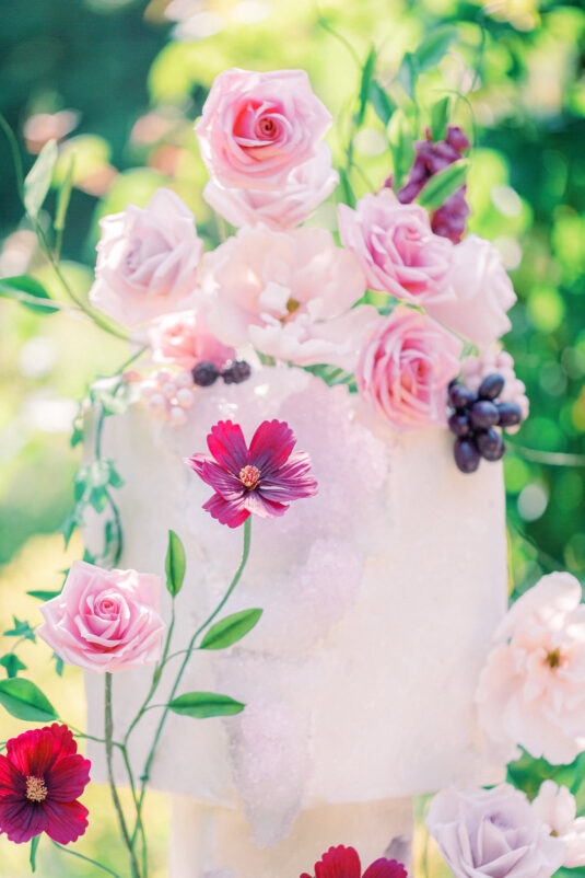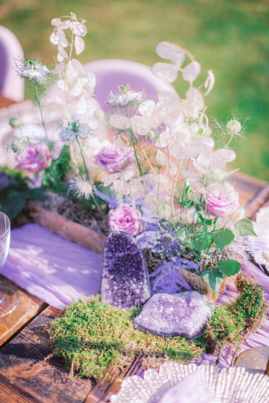 “At the heart of the theme, is a host of Amethyst crystals. This stone of serenity and enlightenment, with its beautiful color and sparkle is the perfect backdrop for a romantic and whimsical wedding,” shares cake designer Jilly Garratt when describing the initial concept that was dreamt up by Garratt, Charlotte Munro (stylist), and photographer San of Sanshine Photography.