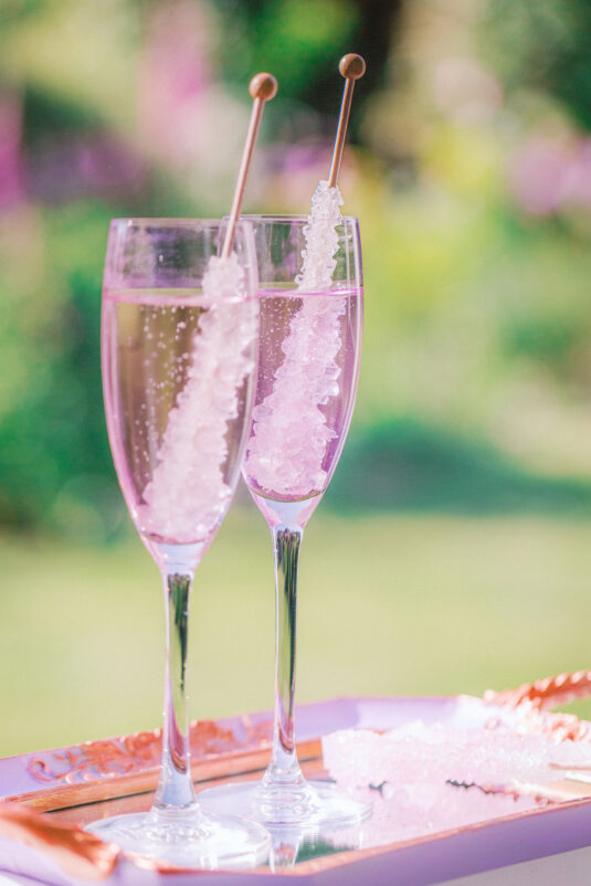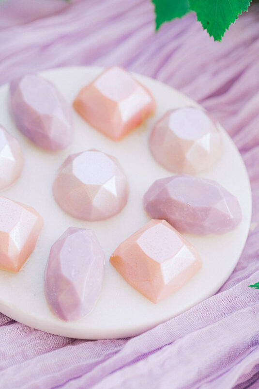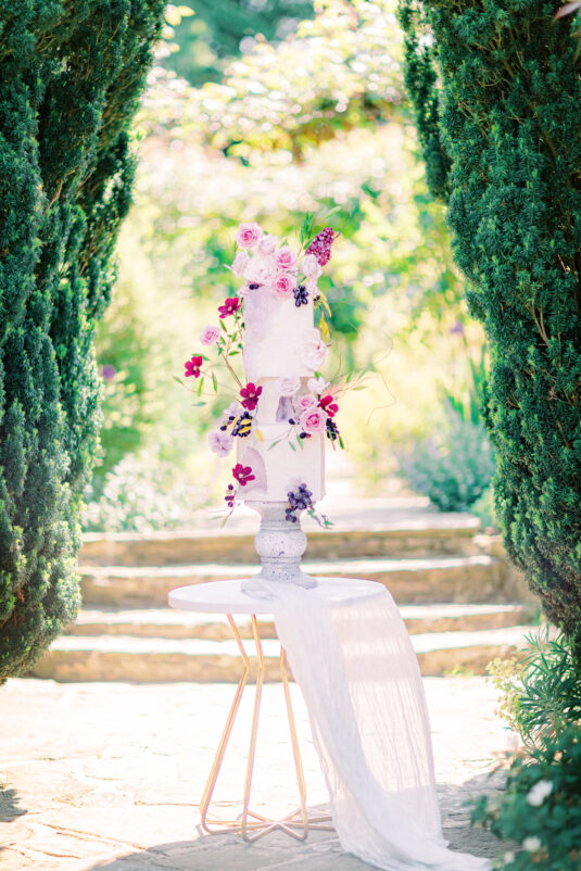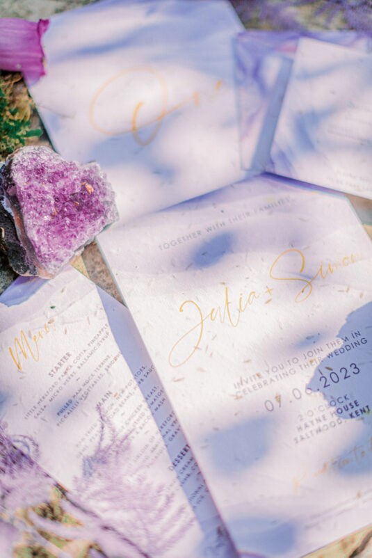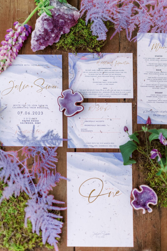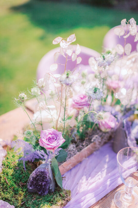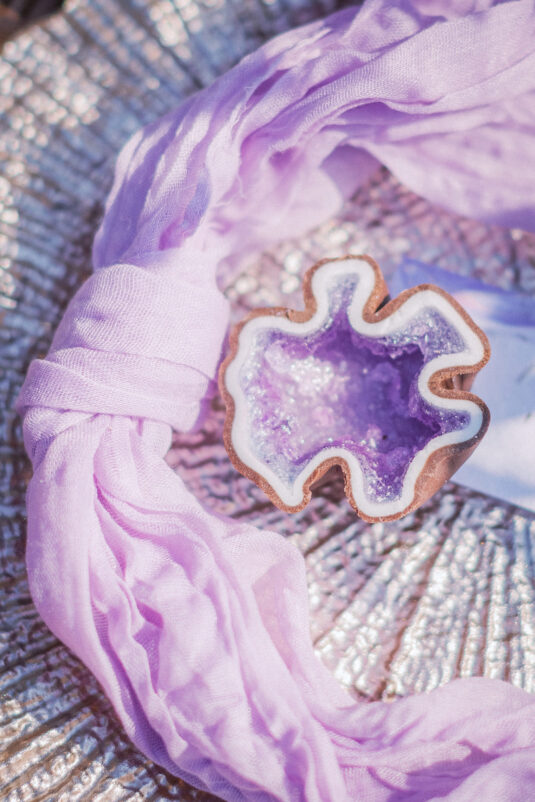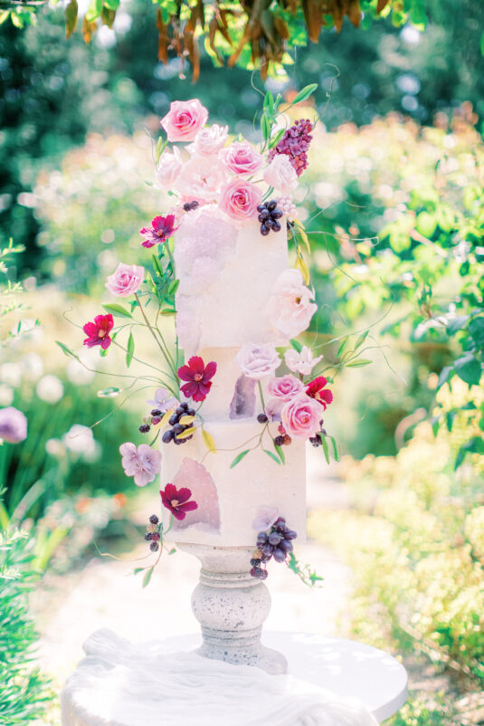 “At the heart of the theme, is a host of Amethyst crystals. This stone of serenity and enlightenment, with its beautiful color and sparkle is the perfect backdrop for a romantic and whimsical wedding,” shares cake designer Jilly Garratt when describing the initial concept that was dreamt up by Garratt, Charlotte Munro (stylist), and photographer San of Sanshine Photography.