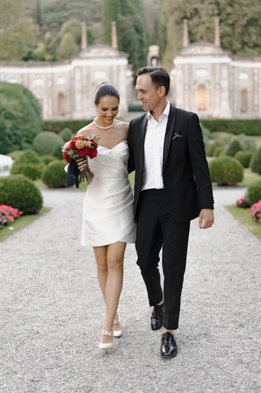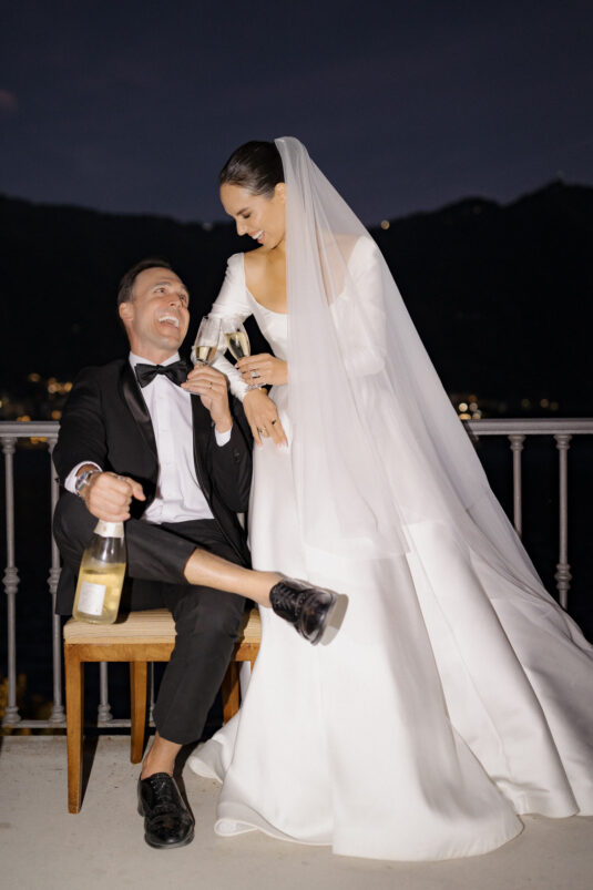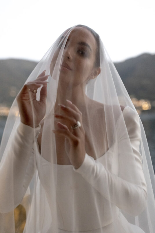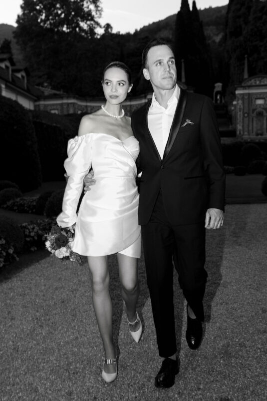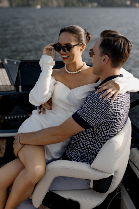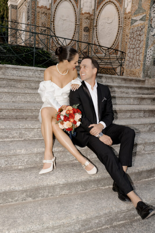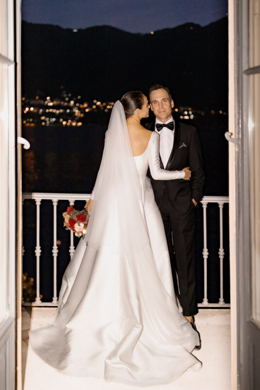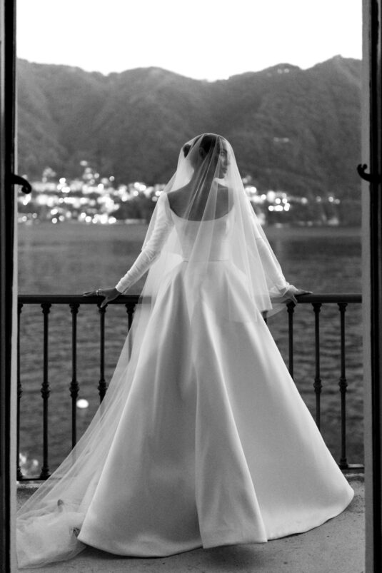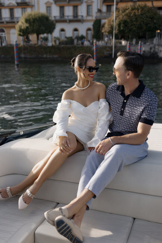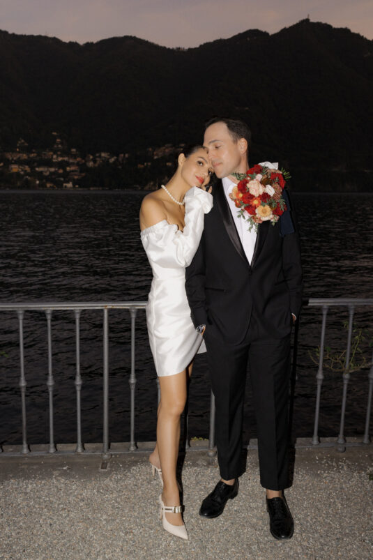 Bianca wore a minimalist Millanova dress for the boat ride moment while Chris pulled out a beautiful casual chic outfit. The couple looked like they were in a movie scene while riding the boat in the scenery of Lake Como at sunset. Bianca then changed into her perfectly tailored Reem Acra wedding dress that felt like a royal moment with the architecture and Fresca of the iconic Villa D‘Este.