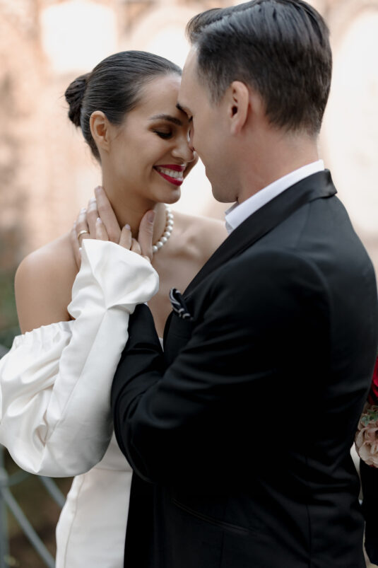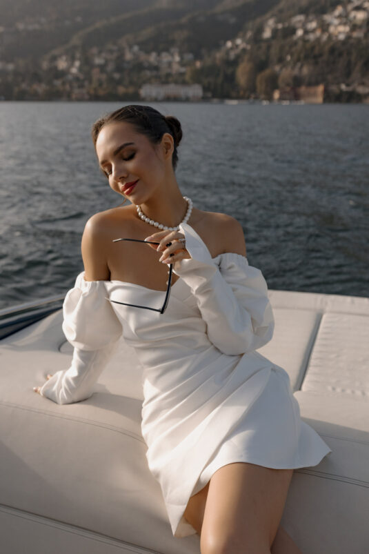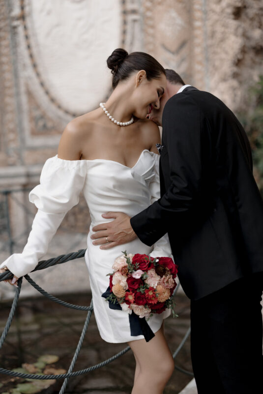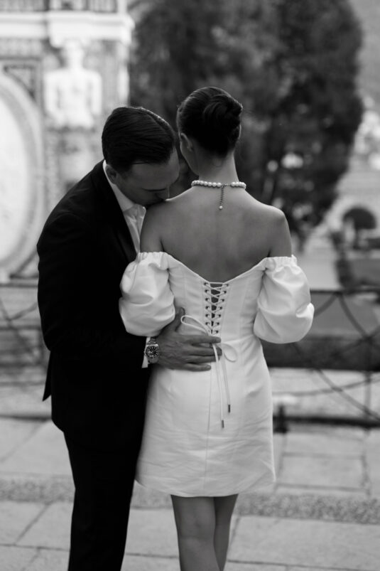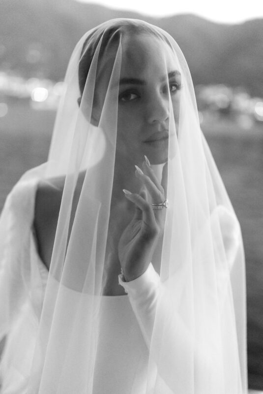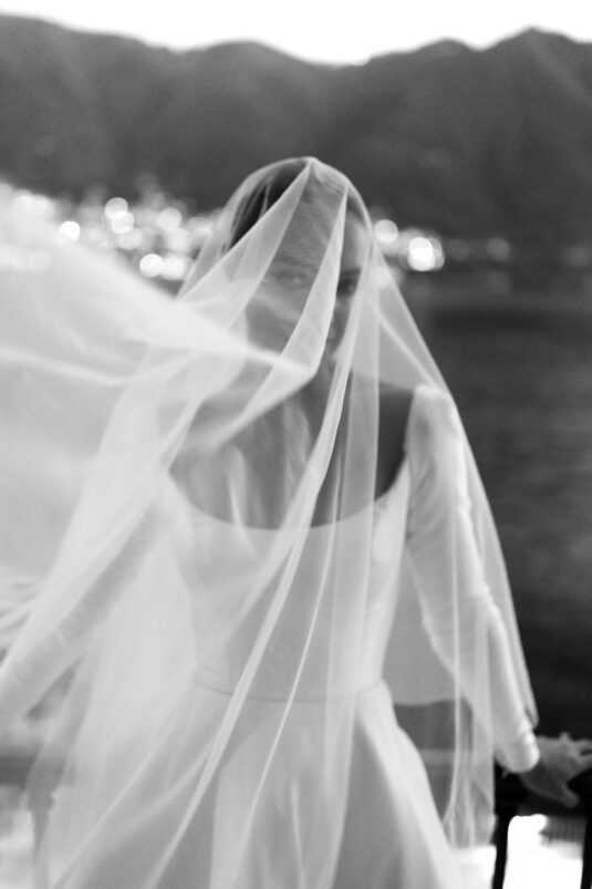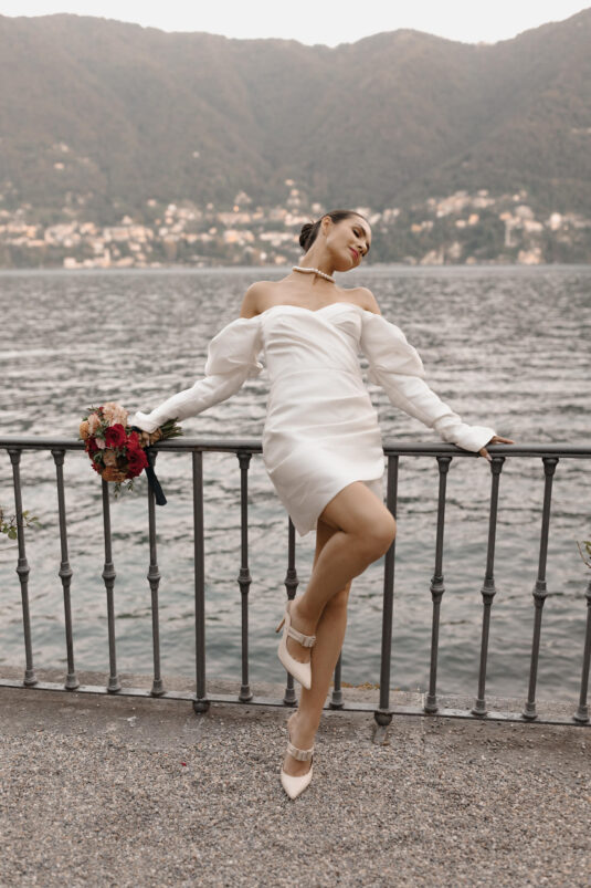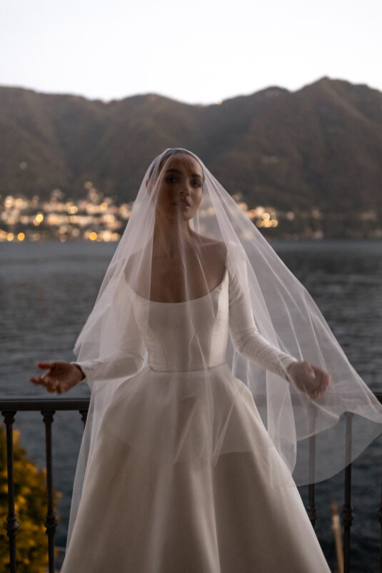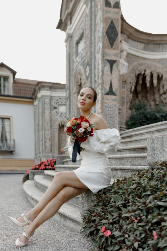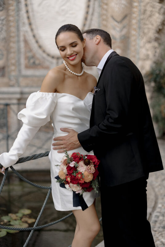Bianca wore a minimalist Millanova dress for the boat ride moment while Chris pulled out a beautiful casual chic outfit. The couple looked like they were in a movie scene while riding the boat in the scenery of Lake Como at sunset. Bianca then changed into her perfectly tailored Reem Acra wedding dress that felt like a royal moment with the architecture and Fresca of the iconic Villa D‘Este.