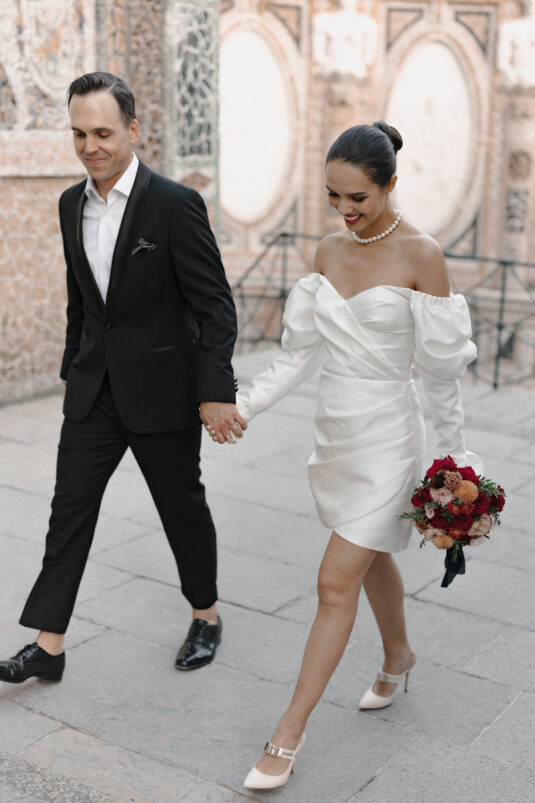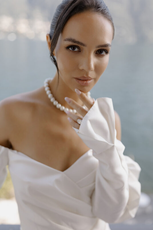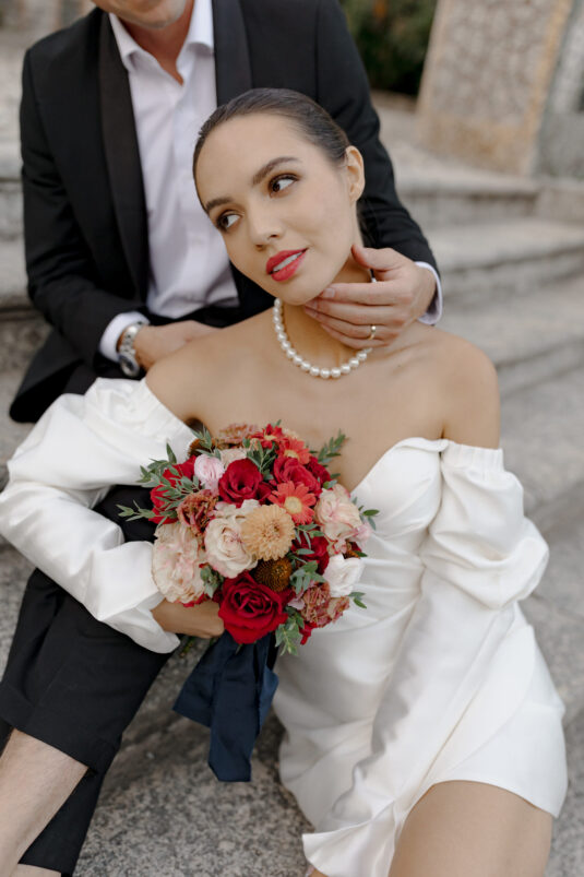 “They dreamed of eloping in the exclusive Lake Como at the iconic Villa D‘Este where they stayed seven years ago when they first met, so we created a beautiful concept combining their impeccable fashion style with the Italian Dolce Vita vibe,” says Andreea Musat of Azalea Events. “The aesthetic of the wedding day was a mix of relaxed luxury style mixed with soft details of Italian style in Bianca’s makeup, accessories, and Chris‘s tux.”