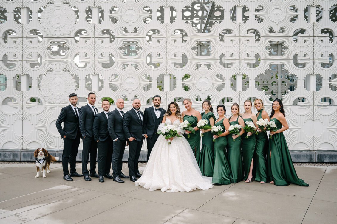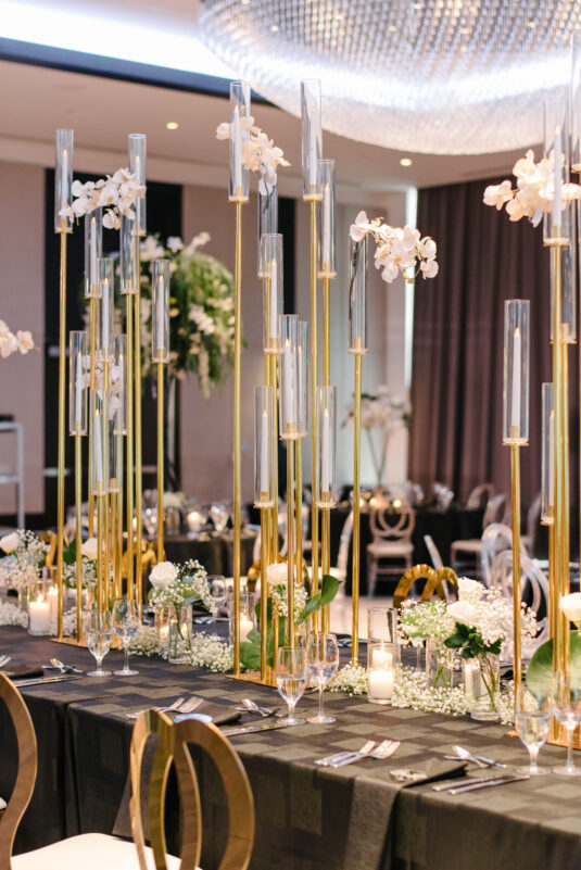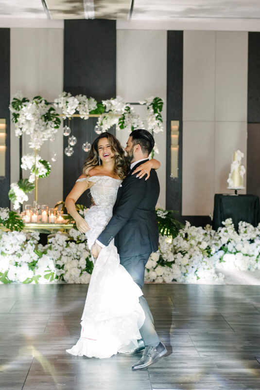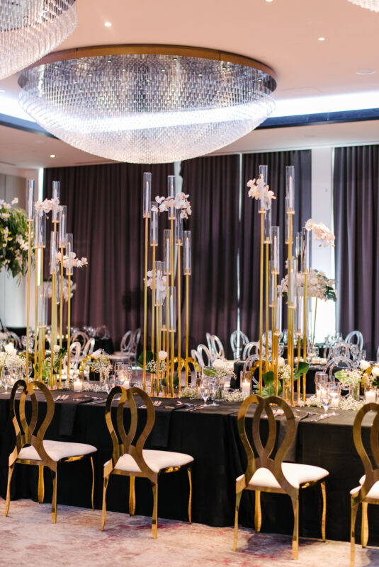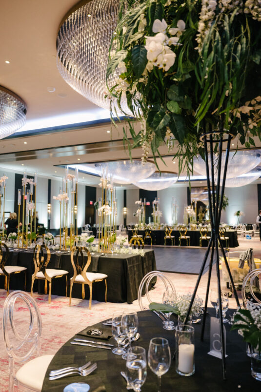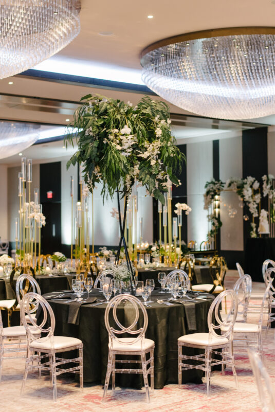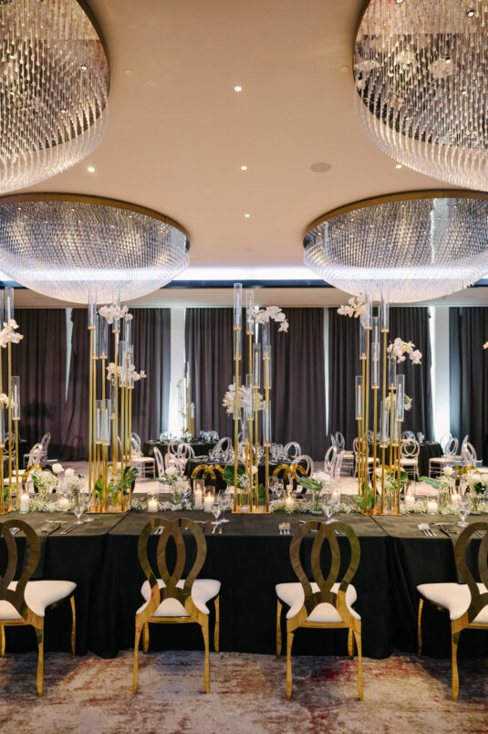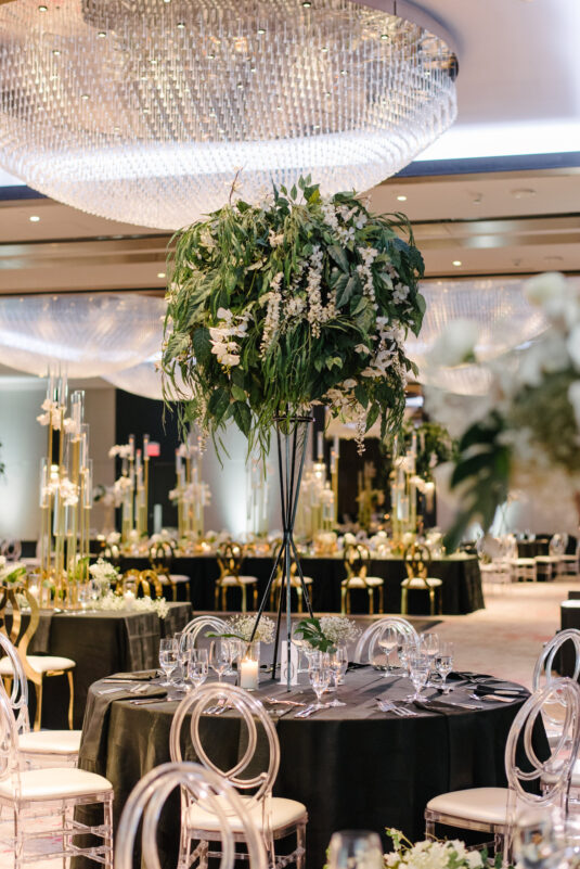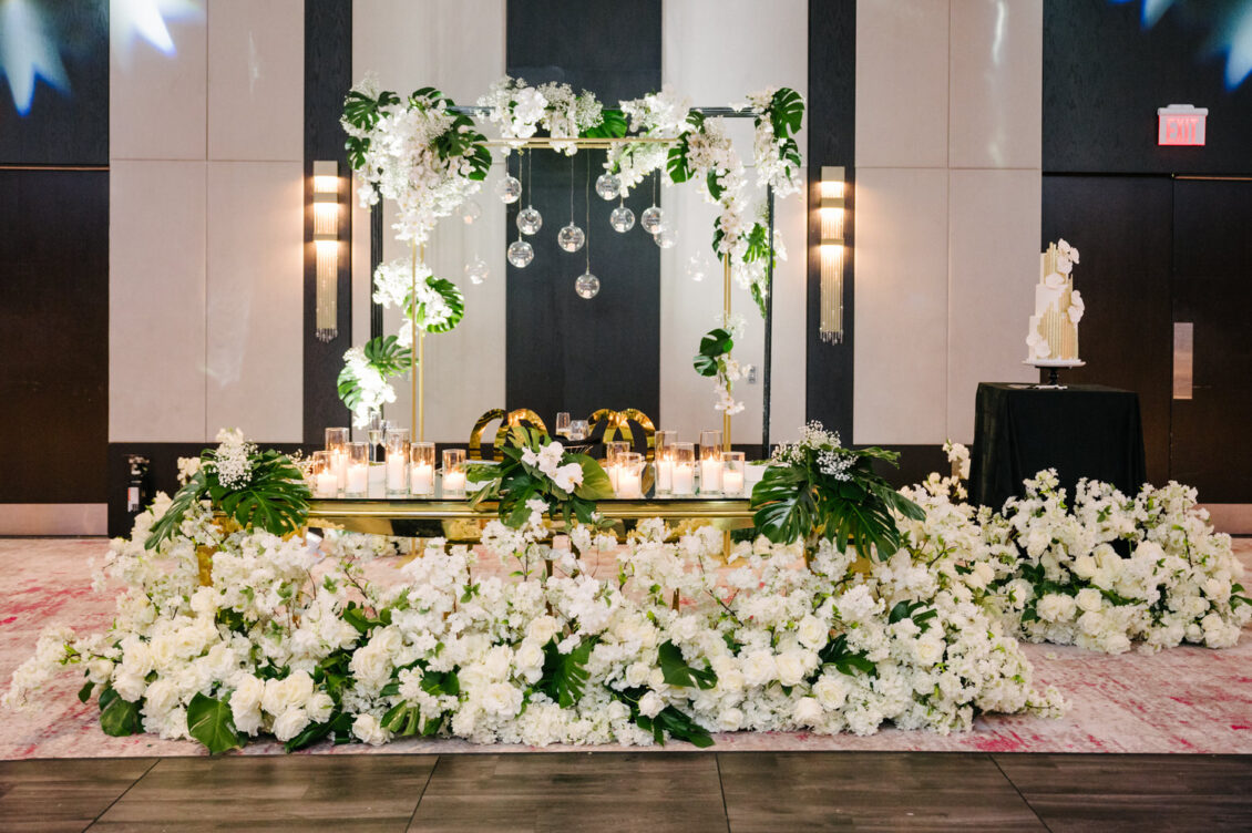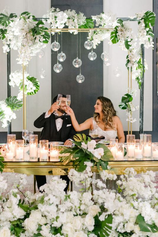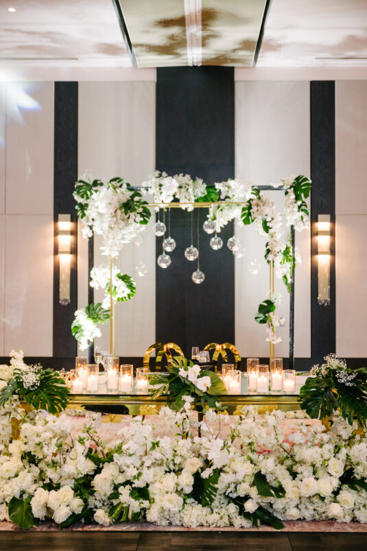 The couple were married in Toronto, Canada. Their wedding was inspired by Art Deco vibes, echoing both The Great Gatsby and Miami in its Art Deco heyday. Wild Theory Floral & Event Design achieved this look with warm, tropical floral elements. The ceremony space was adorned with tropical Monstera leaves, forming a floor arch encircling the couple at the altar while the reception’s head table featured a large geometric backdrop with hanging globe tea lights, surrounded by floral swags on and around the glass table.