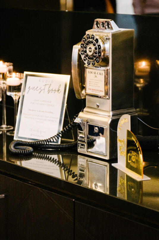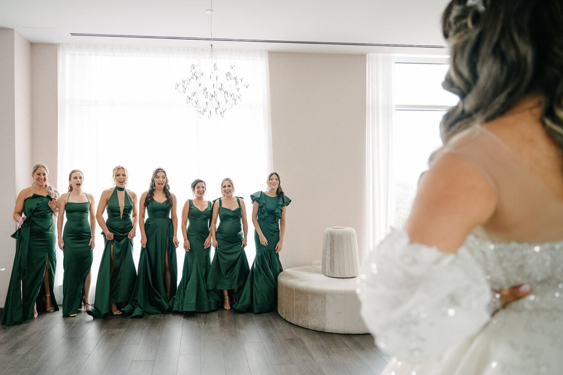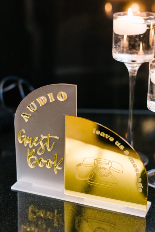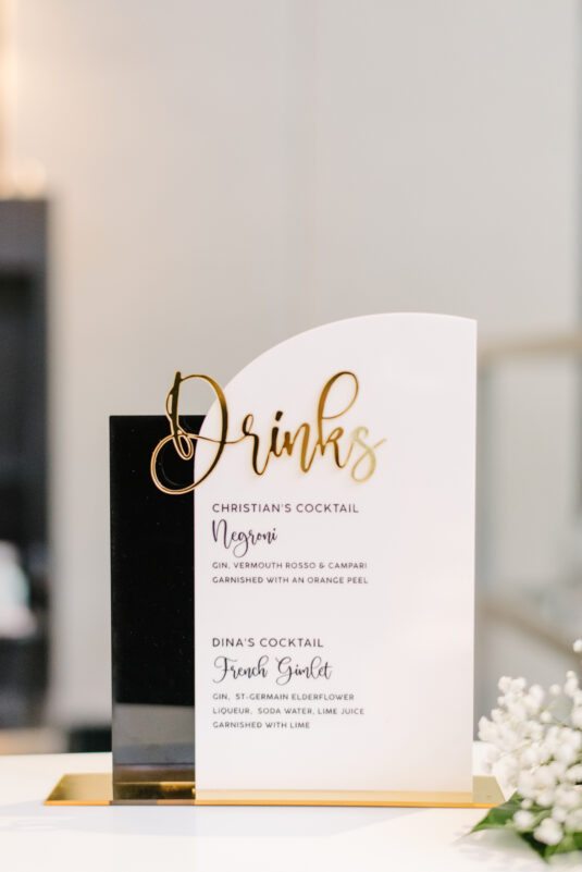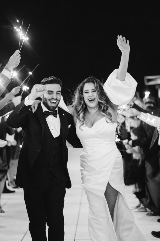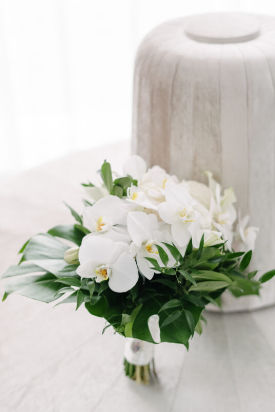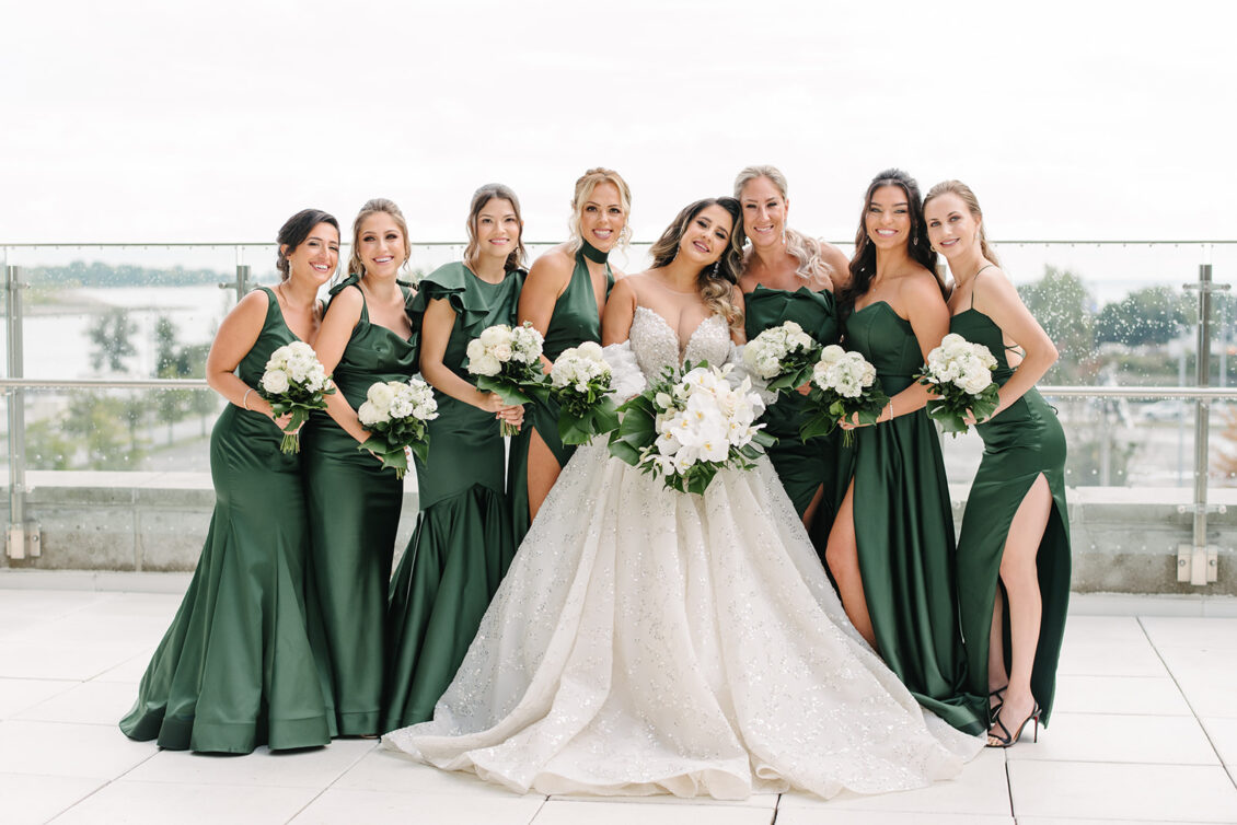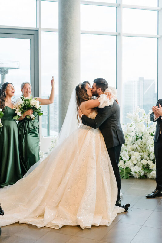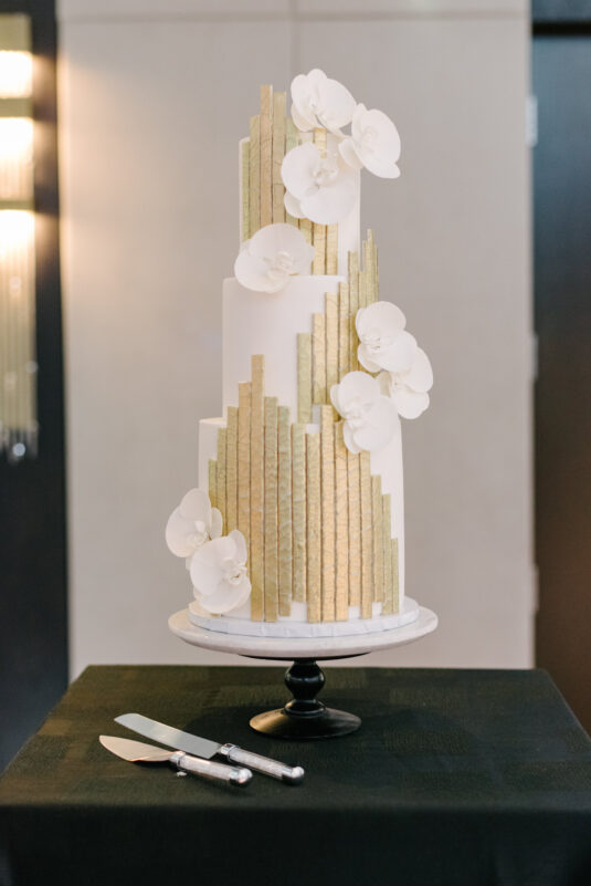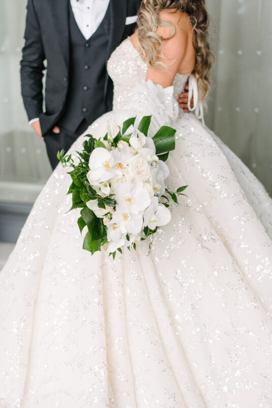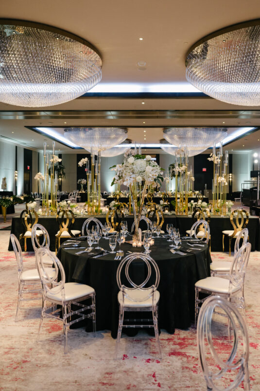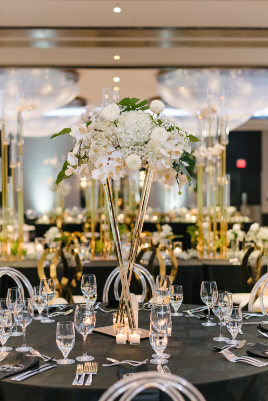 The couple were married in Toronto, Canada. Their wedding was inspired by Art Deco vibes, echoing both The Great Gatsby and Miami in its Art Deco heyday. Wild Theory Floral & Event Design achieved this look with warm, tropical floral elements. The ceremony space was adorned with tropical Monstera leaves, forming a floor arch encircling the couple at the altar while the reception’s head table featured a large geometric backdrop with hanging globe tea lights, surrounded by floral swags on and around the glass table.