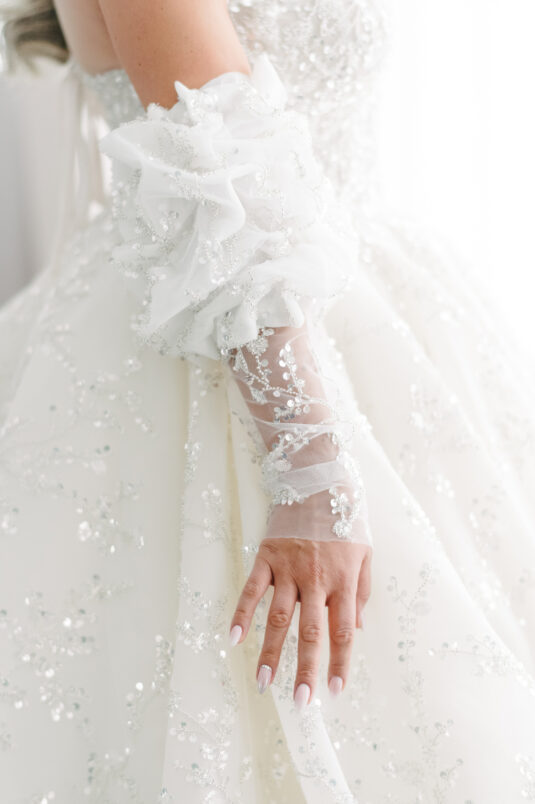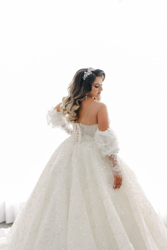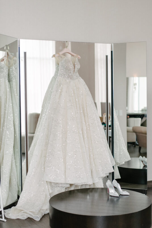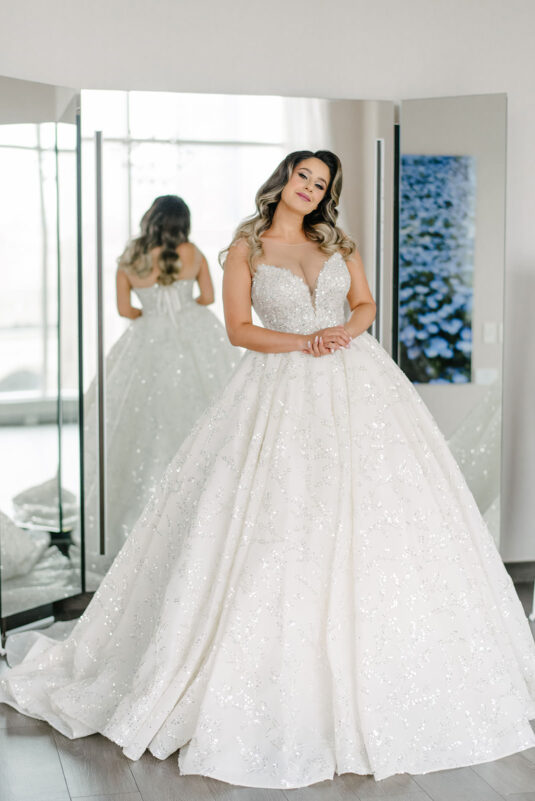 As the owner of a bridal gown boutique, Dina naturally chose to wear three different gowns for her wedding, all from her own store.