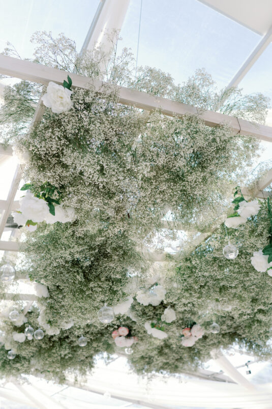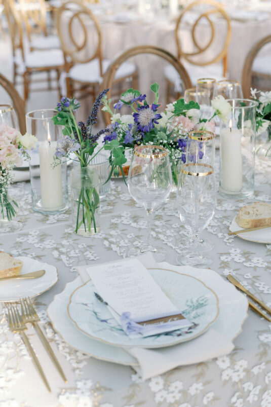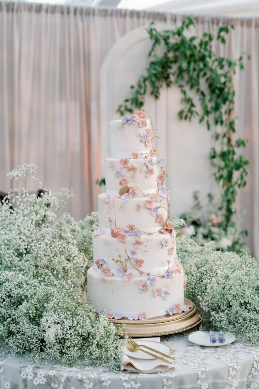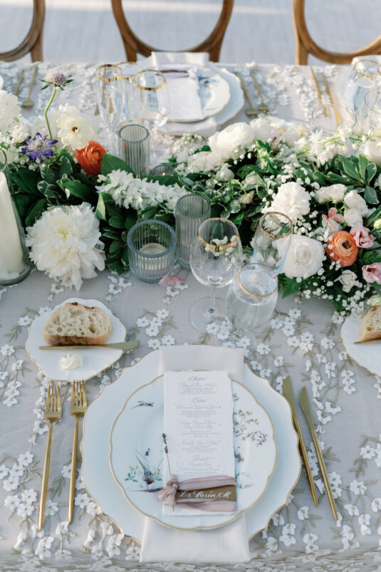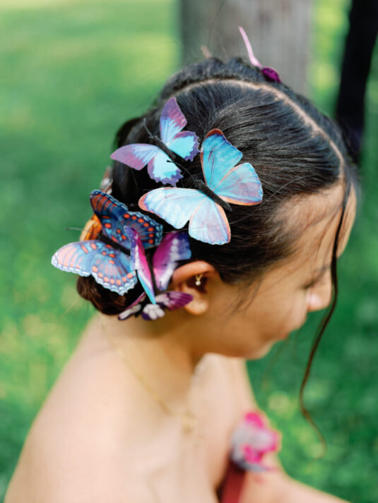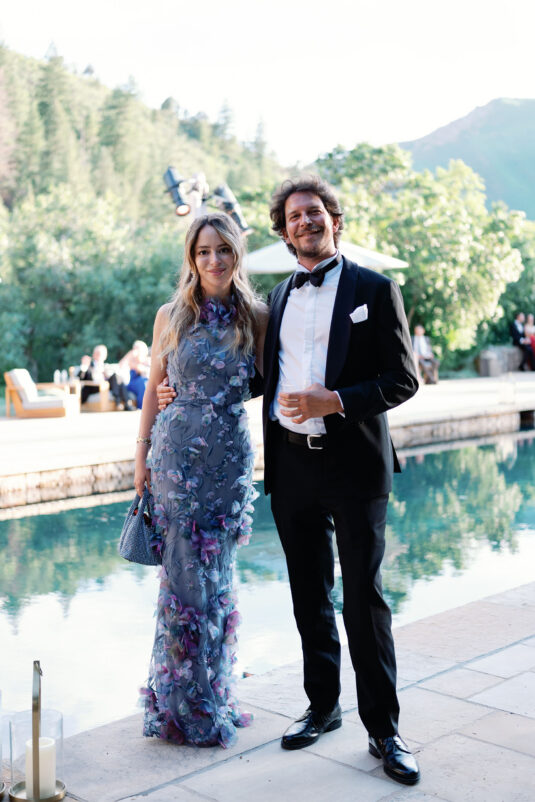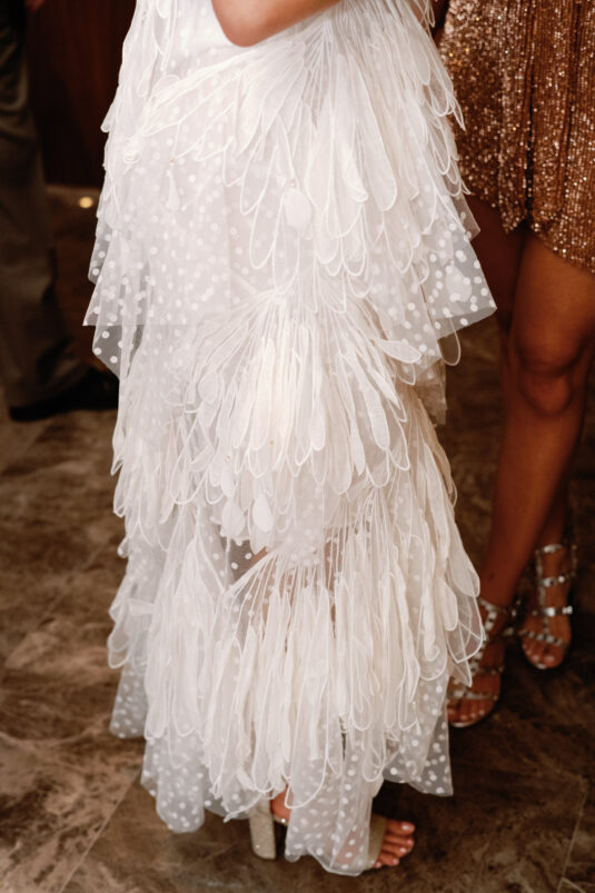 Thea’s Clio Peppiatt dress had motifs from her wedding venue including the bridge and stream. She also wore a dragonfly necklace and butterfly heels from Sophia Webster, which related to the images from the couple’s wedding invitations.