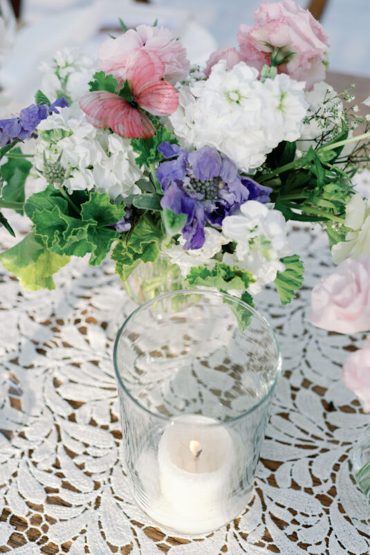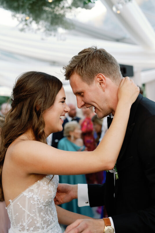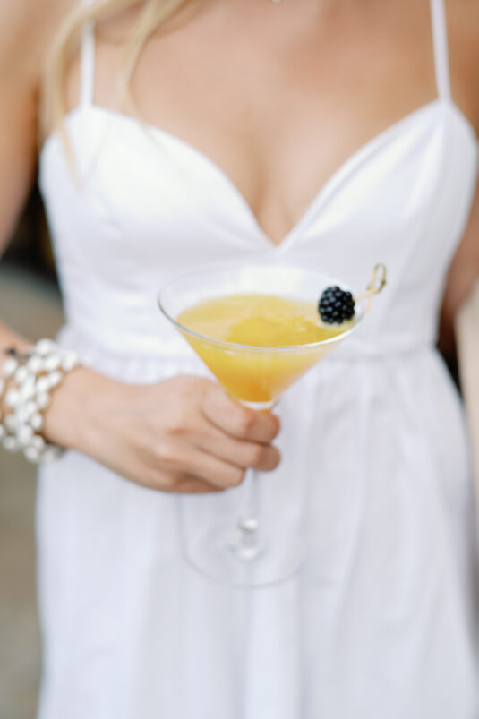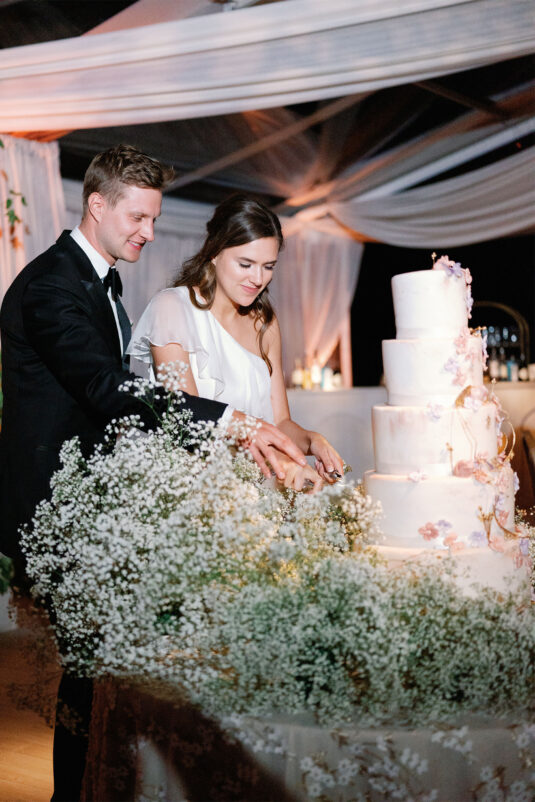 The couple flipped the script for the welcome party and invited their guests to wear all white while they wore “something blue.”