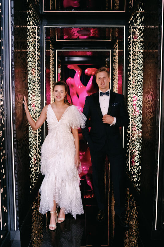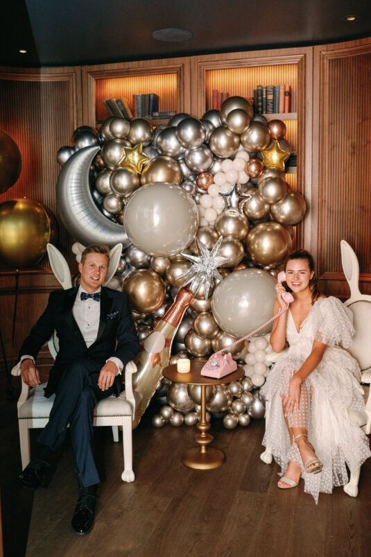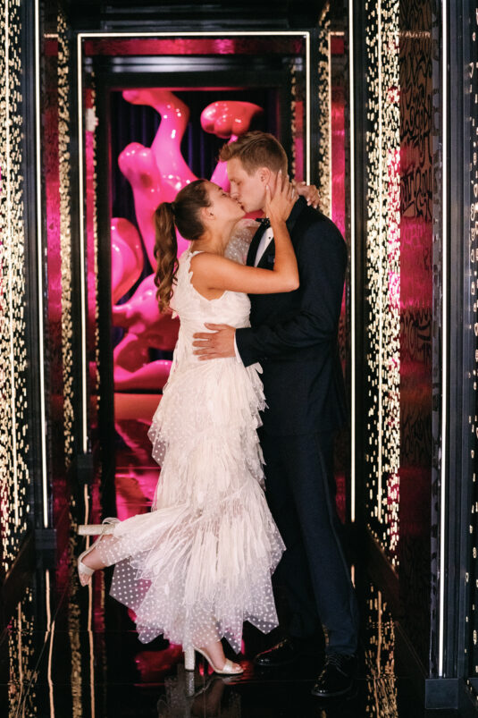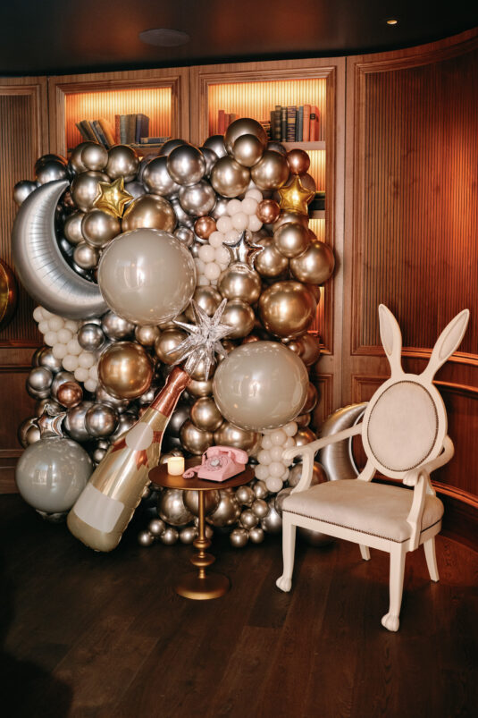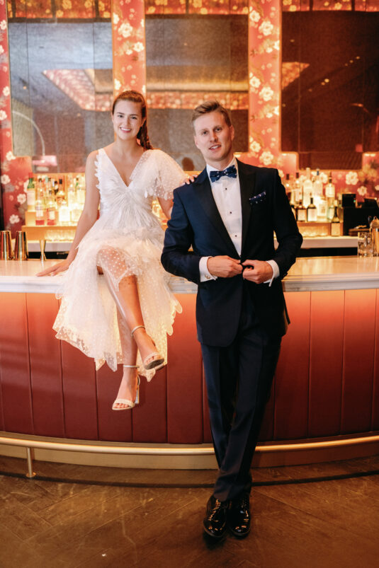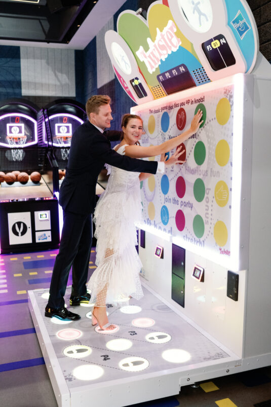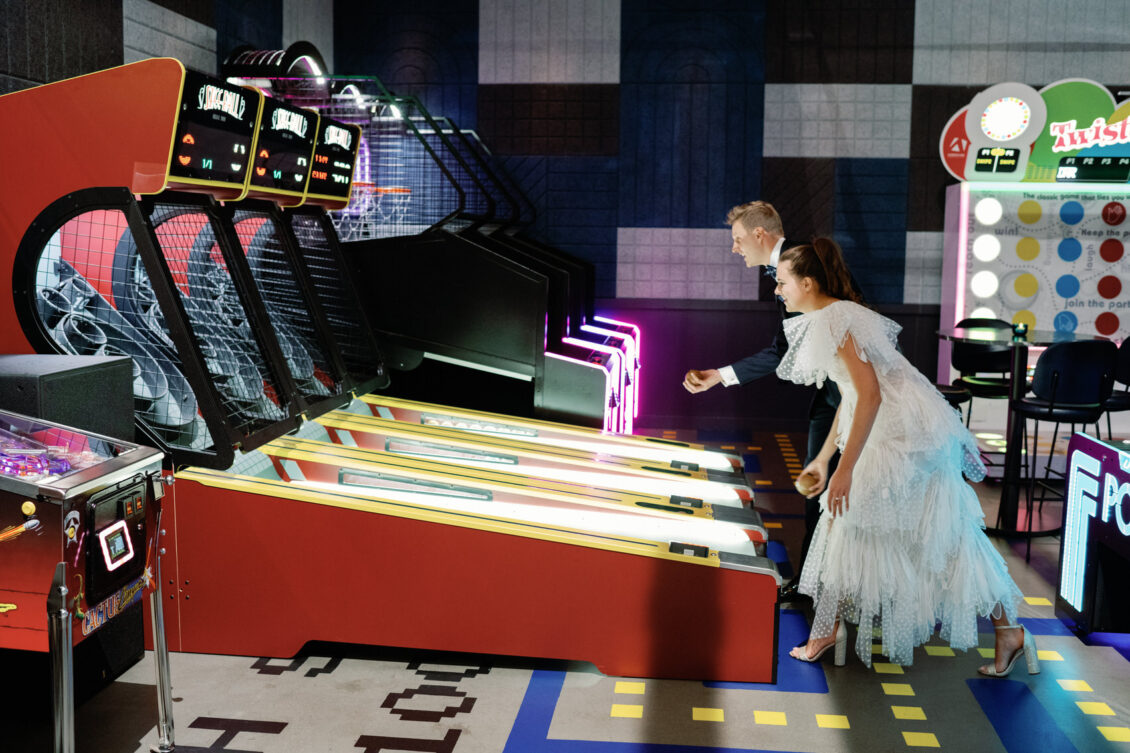 The whimsical rehearsal party was held at Chasing Rabbits in Vail, Colorado where the couple are part of the founding team. The venue consists of a restaurant, a library lounge, an arcade, and a speakeasy, making it a one-of-a-kind entertainment experience. The evening began with dinner before becoming a full-blown party with a magician, DJ, arcade games, and dancing.
