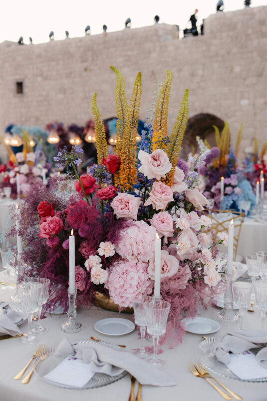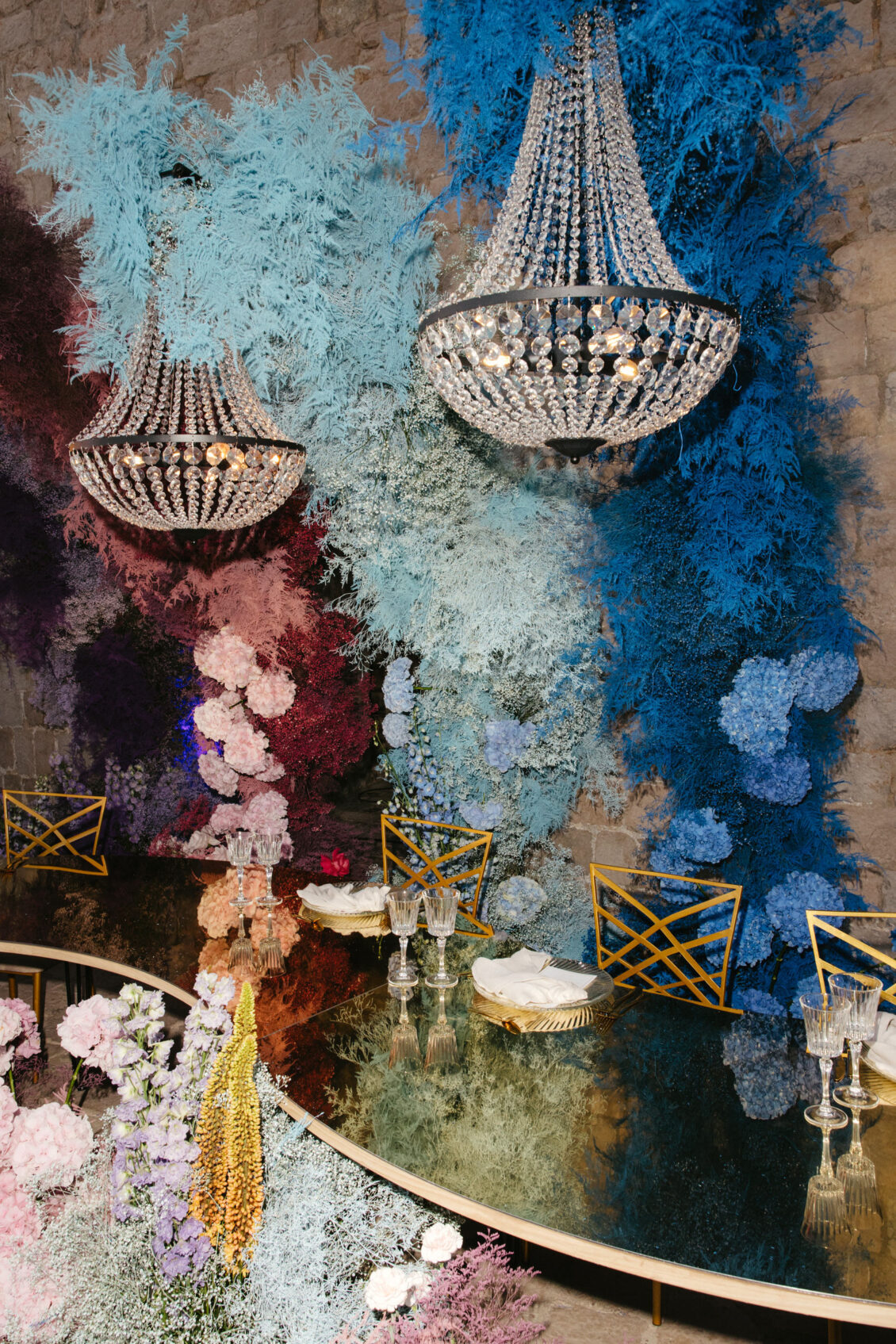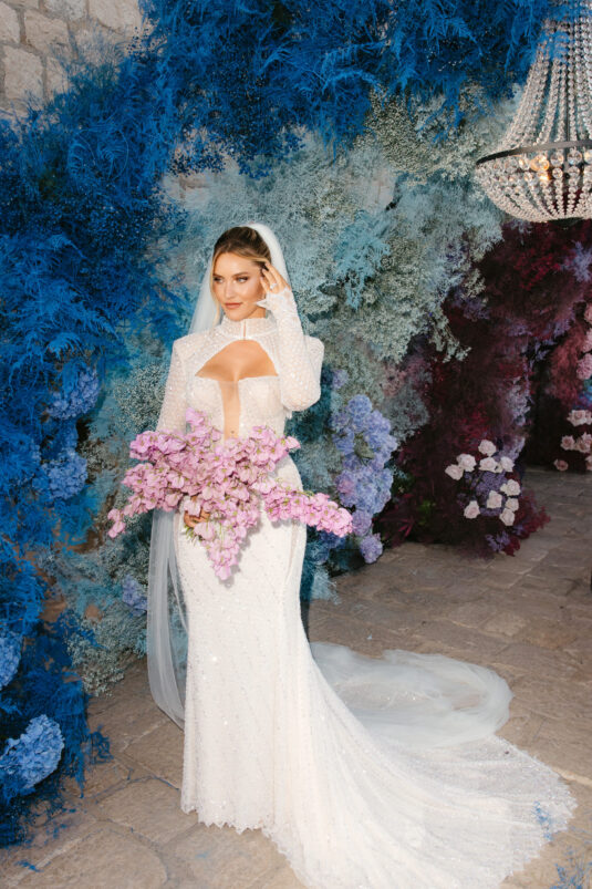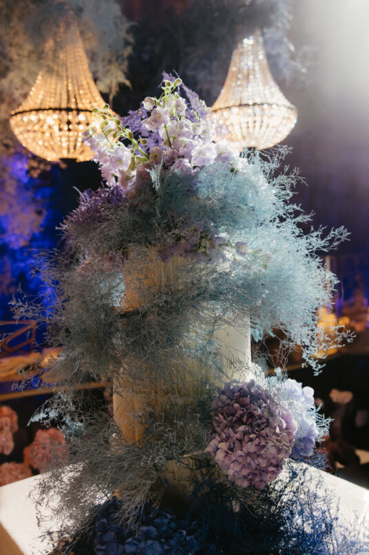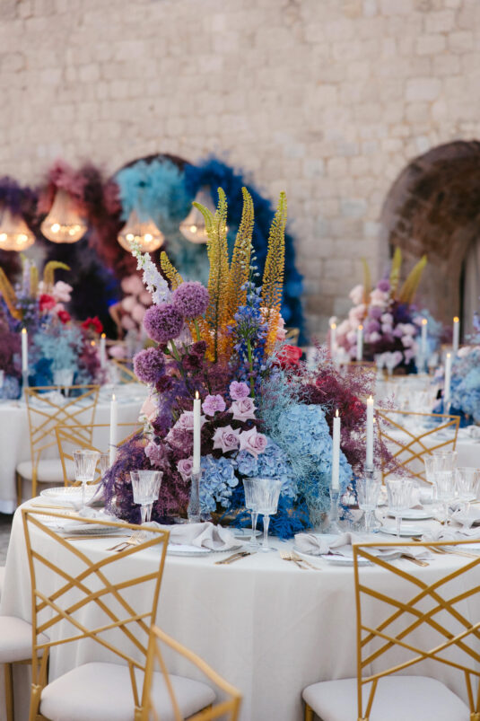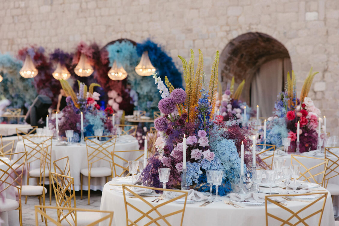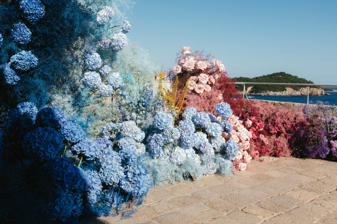Starting at 5 a.m. on the morning of the wedding, more than 300 people worked on getting the venue ready for the wedding, which not one, but two wedding planning agencies coordinated. With colorful pink and blue ombré flowers, this wedding mixes historical elegance with modern beauty and creates a dream-like event.