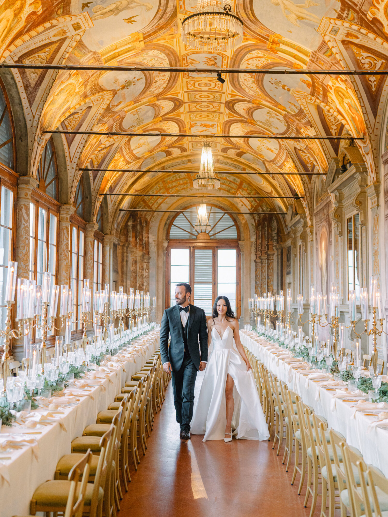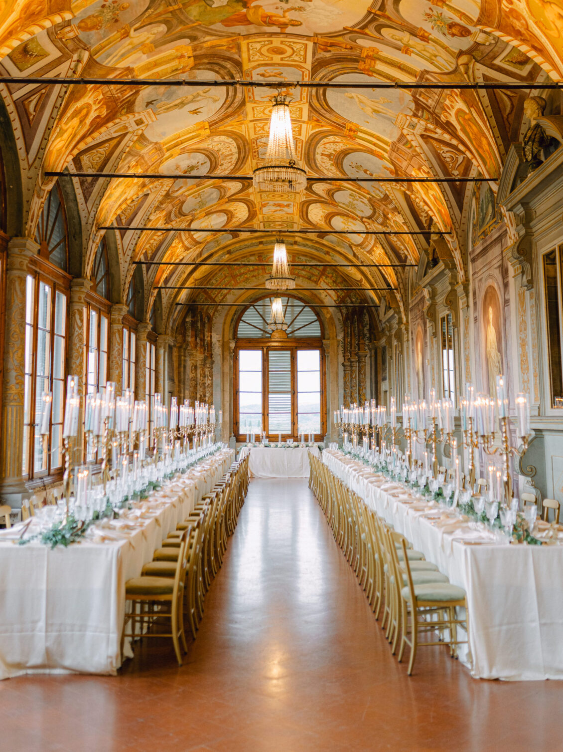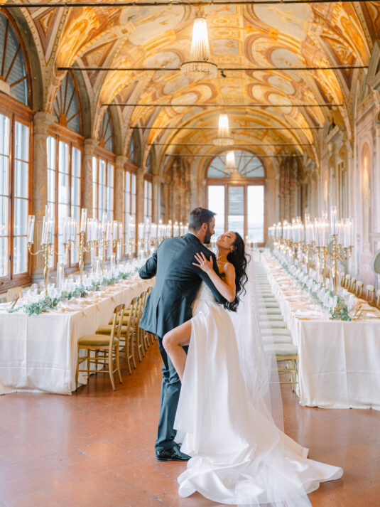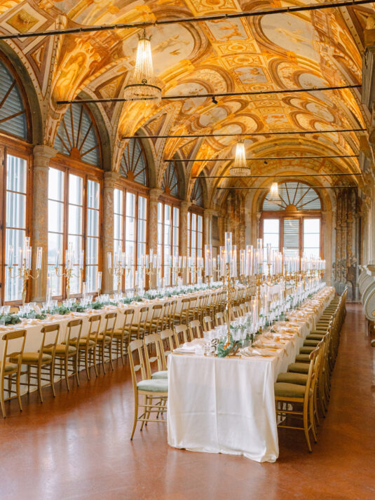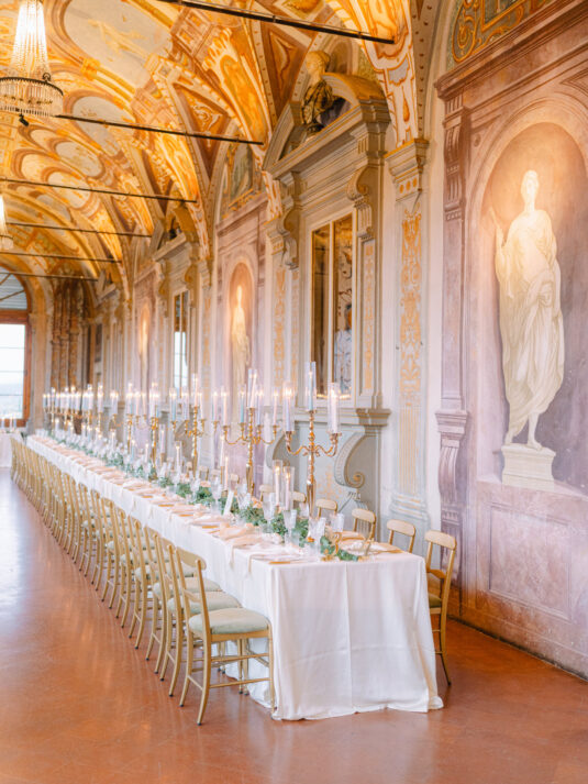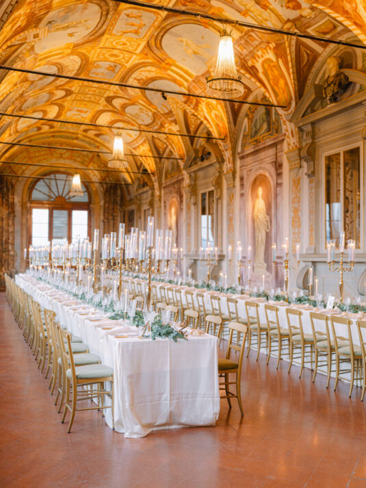 Giselle and Paolo’s wedding was held in the stunning garden of Villa Corsini. From the garden to the golden reception, this wedding looks straight out of a fairytale. Dinner was held in the Galleria del Pandolfo Sacchi, one of Tuscany’s most remarkable privately frescoed halls. Adorned in gold and art, you will get major wanderlust just by looking at it!