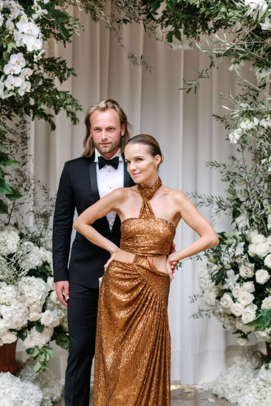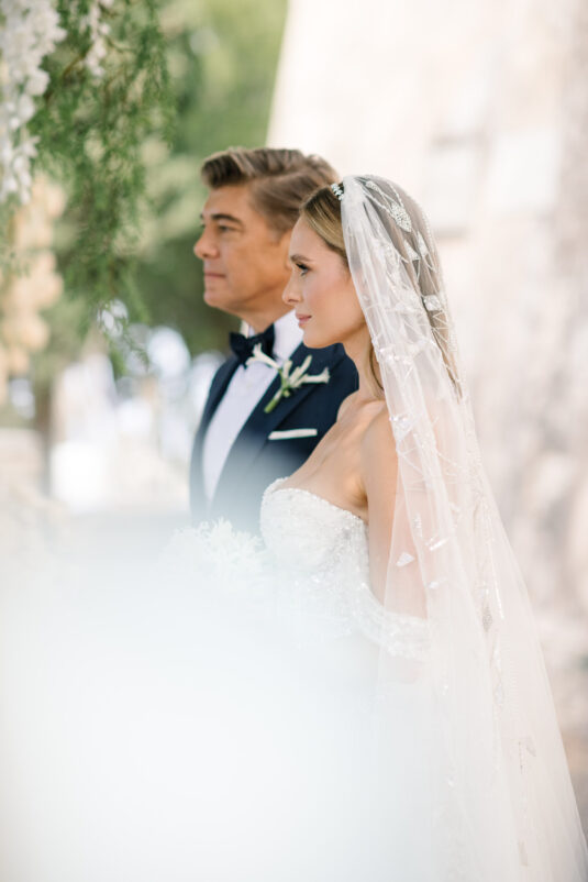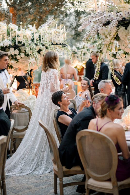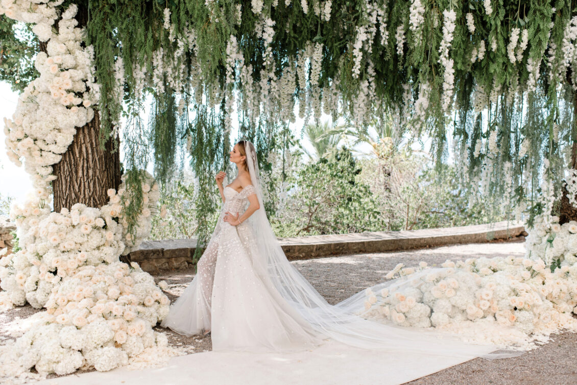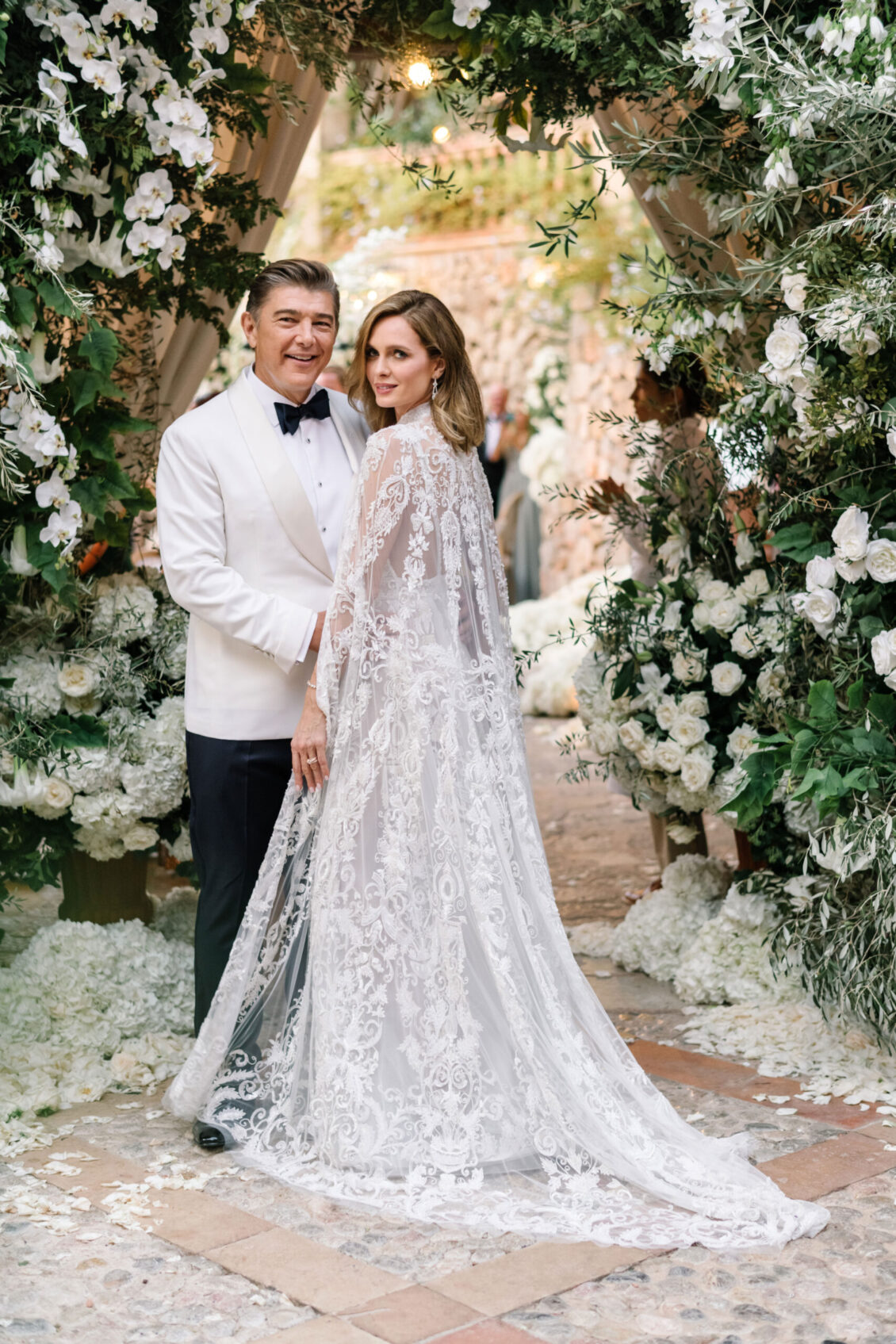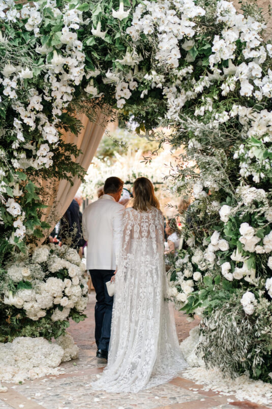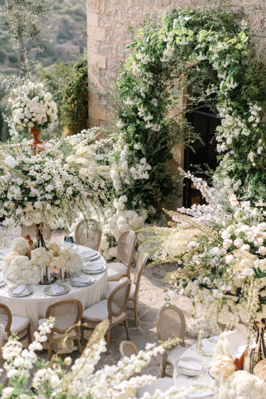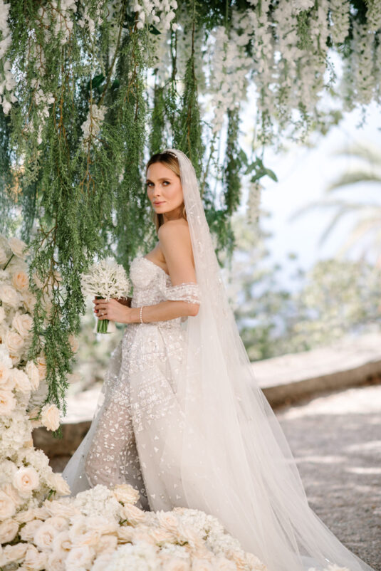 Asta looked breathtaking in not one, but TWO Zuhair Murad gowns. The wedding was elegant, sophisticated and enchanting! The ceremony was held outside an old monastery under a tree with cascading white flowers and overlooking the sea. A huge arch of white orchids led guests to dinner on the terrace of the hotel’s restaurant, El Olivo. The couple’s intimate guest list included photography legend David Montgomery and Lithuanian supermodel Edita Vilkevičiūtė.
