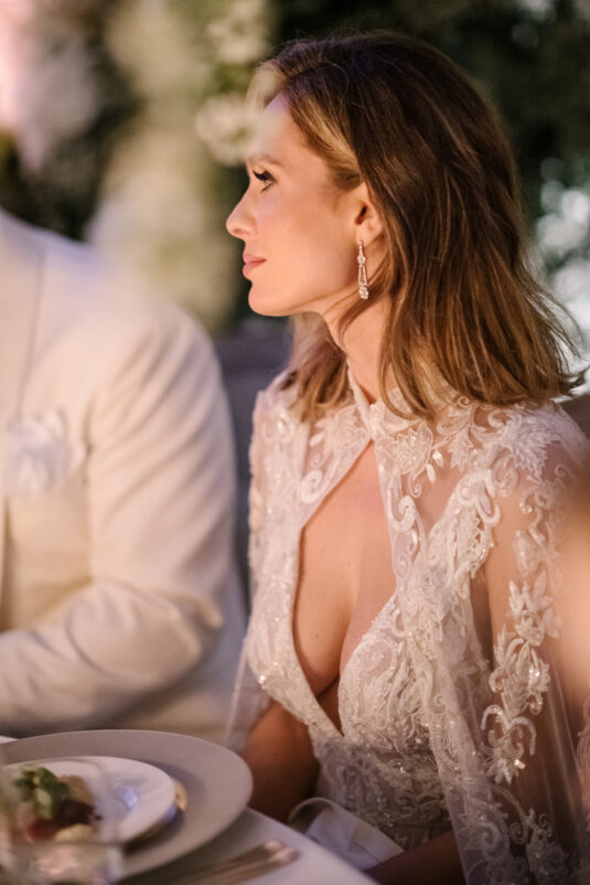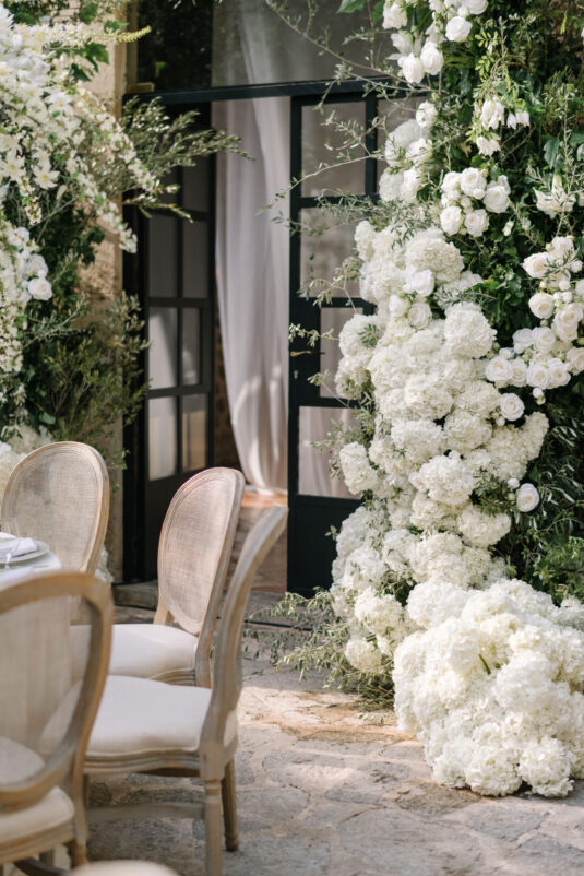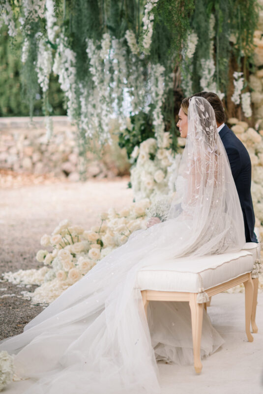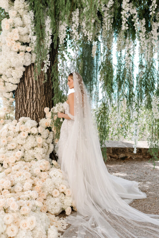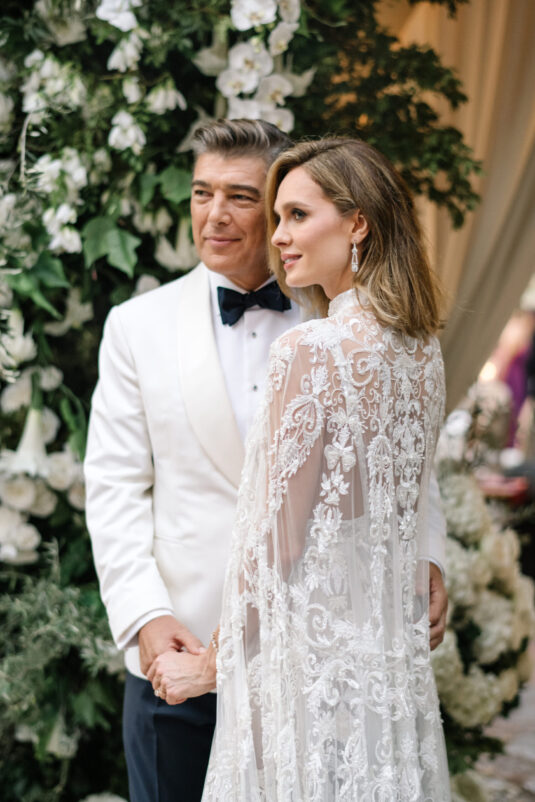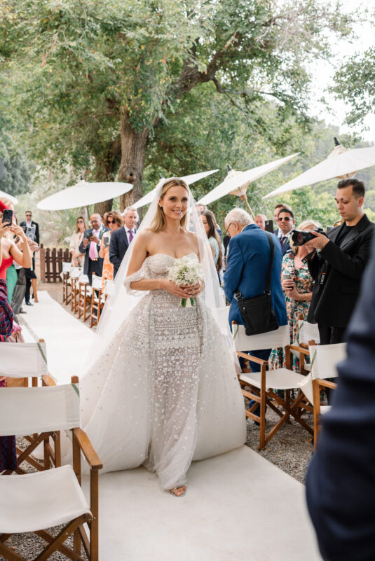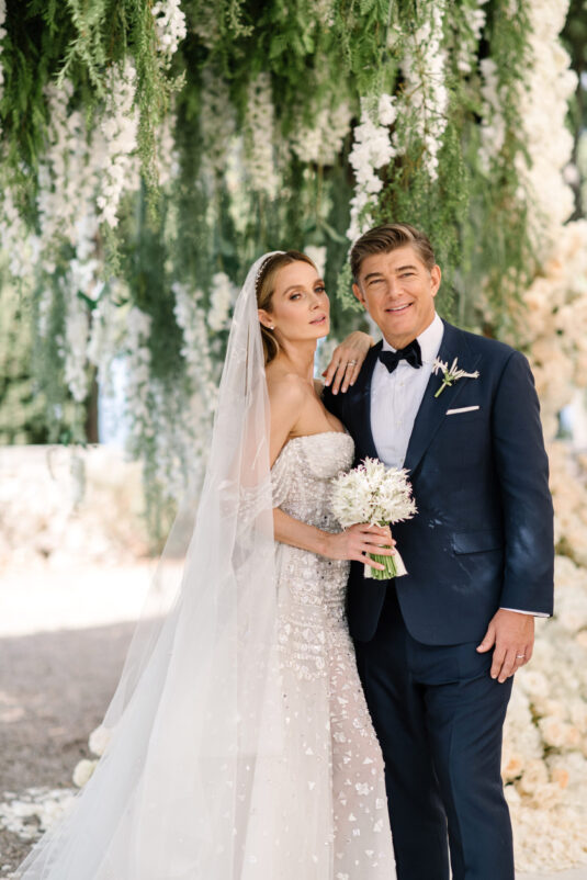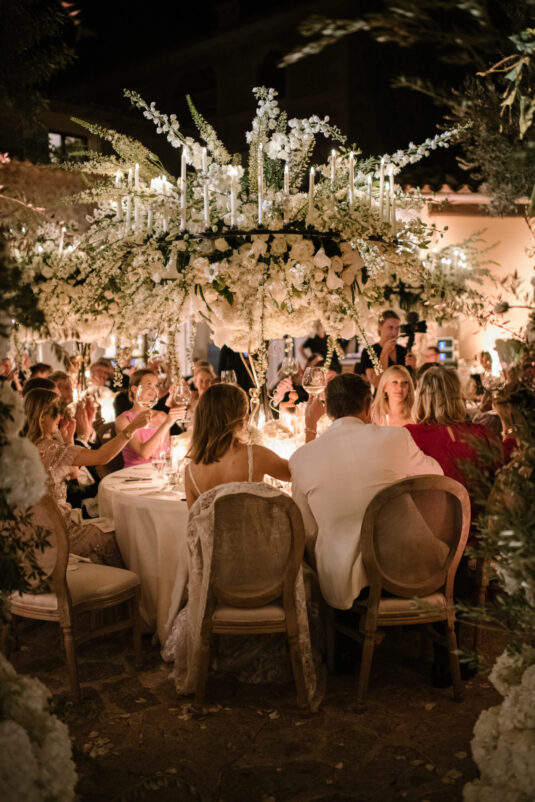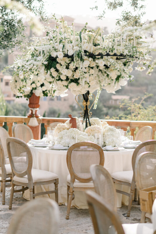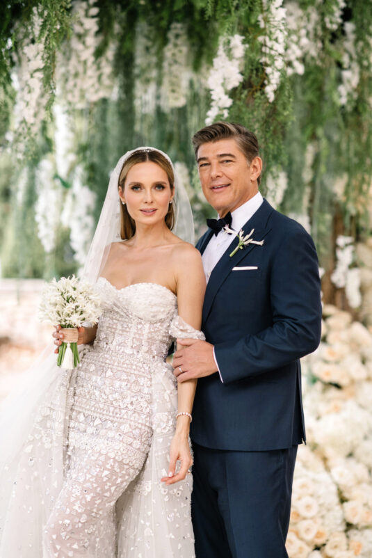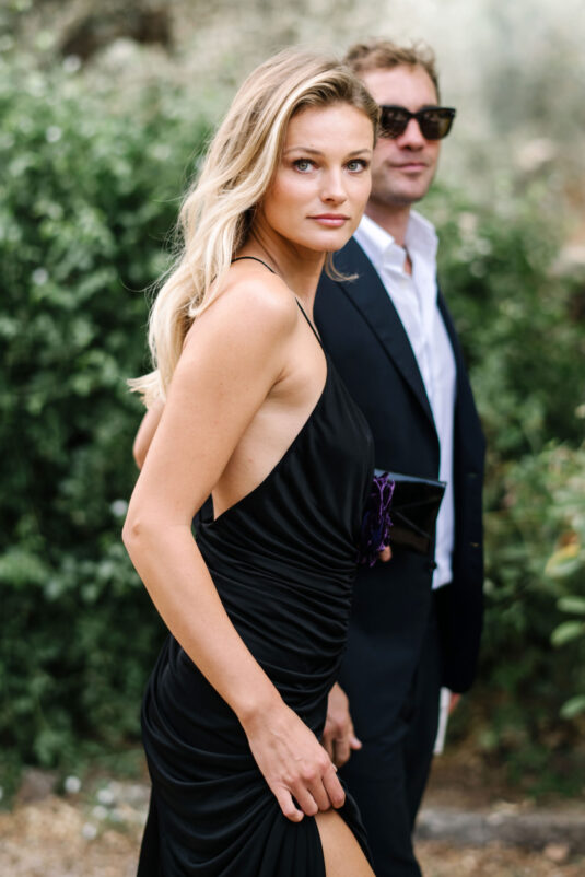 Asta looked breathtaking in not one, but TWO Zuhair Murad gowns. The wedding was elegant, sophisticated and enchanting! The ceremony was held outside an old monastery under a tree with cascading white flowers and overlooking the sea. A huge arch of white orchids led guests to dinner on the terrace of the hotel’s restaurant, El Olivo. The couple’s intimate guest list included photography legend David Montgomery and Lithuanian supermodel Edita Vilkevičiūtė.