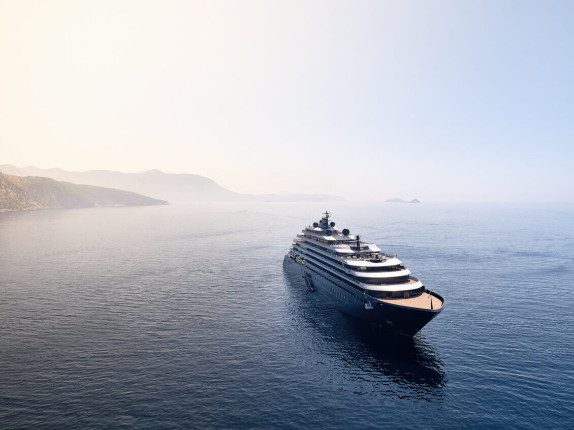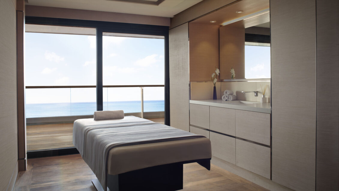 The newest super yacht holds the highest ratio of space per guest at sea, with plenty of areas for it’s 448 guests to enjoy. It mirrors the Evrima in design with airy suites (each complete with a private terrace), a Ritz-Calton Spa, water sports, incredible culinary options, AND a wine vault. luxury yacht wedding