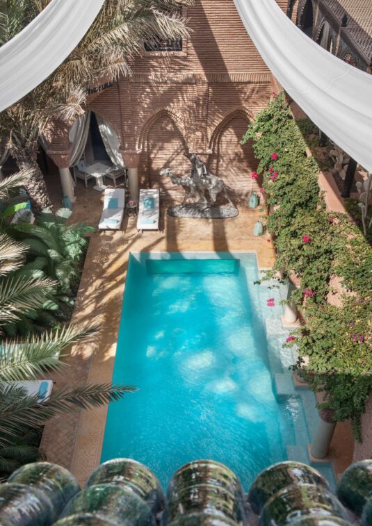 La Sultana Marrakech offers a boutique experience with 28 individually designed rooms and suites spread across five adjoining riads, each with its own character and private courtyard. This setup ensures you rarely encounter other guests, making it feel like you’re staying in an exclusive community, all connected by a central courtyard where the main restaurant and heated swimming pool are located.