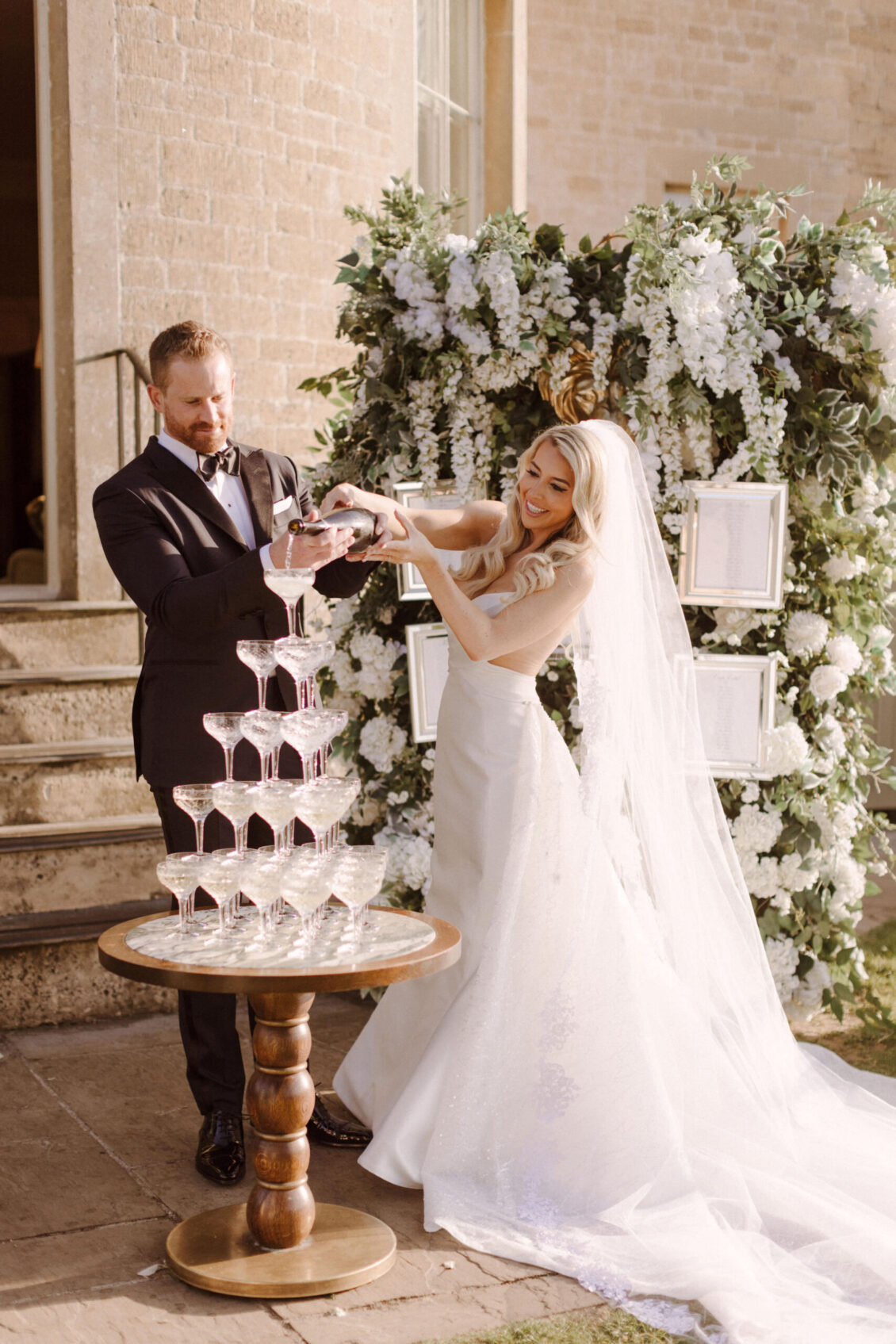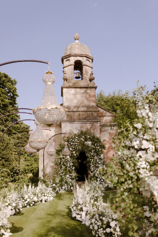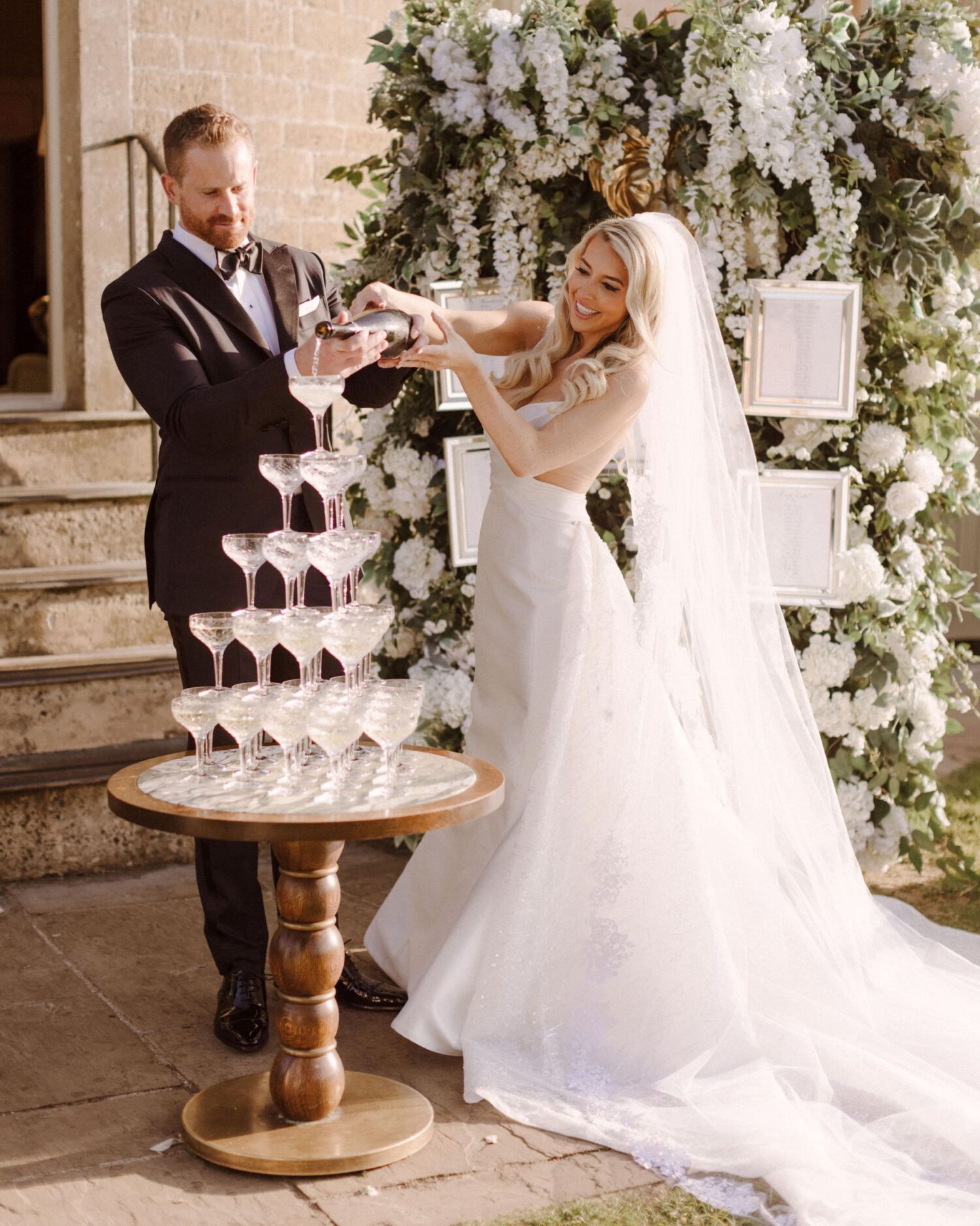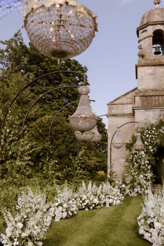 USA-based couple Alexandra and Jordan pulled out all the stops for an unforgettable three-day celebration at Babington House, a Grade II-listed manor dating back to 1705, located in the heart of Somerset, England. They created a magical experience for their friends and family from around the globe, kicking off with a secret garden party under the stars, complete with dining, music, and chandeliers, all set against a breathtaking sunset. The wedding ceremony dazzled in the ancient onsite chapel adorned with trailing florals, a chandelier-lined aisle, and regal lion statues. Guests sipped champagne from a tower before heading to the candlelit orangery for a dreamy wedding breakfast. The night was capped off with a giant millefoglie cake and dancing on the bar, continuing into the next day with a group honeymoon in Ibiza – the perfect start to their married life. Scroll down to take a peek inside this romantic wedding!