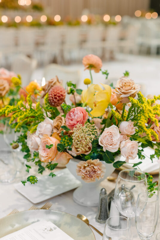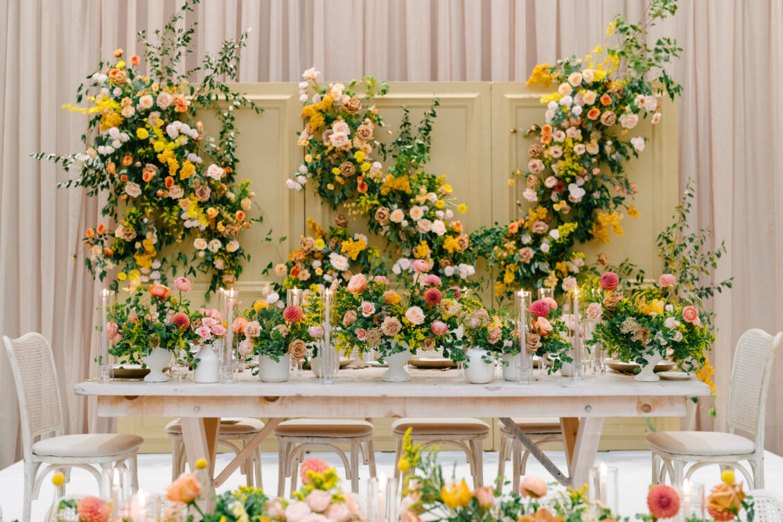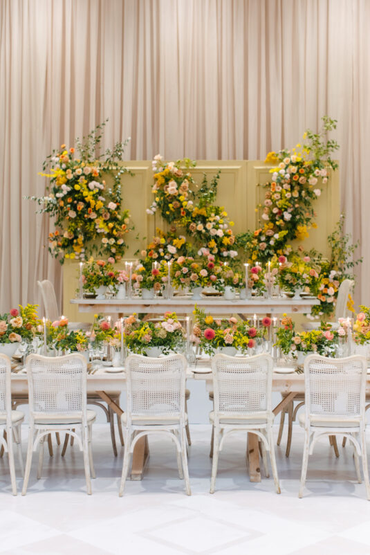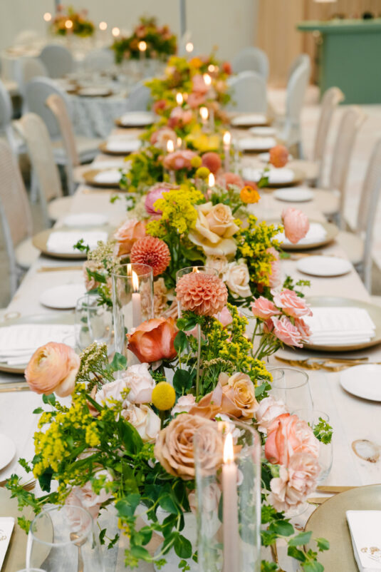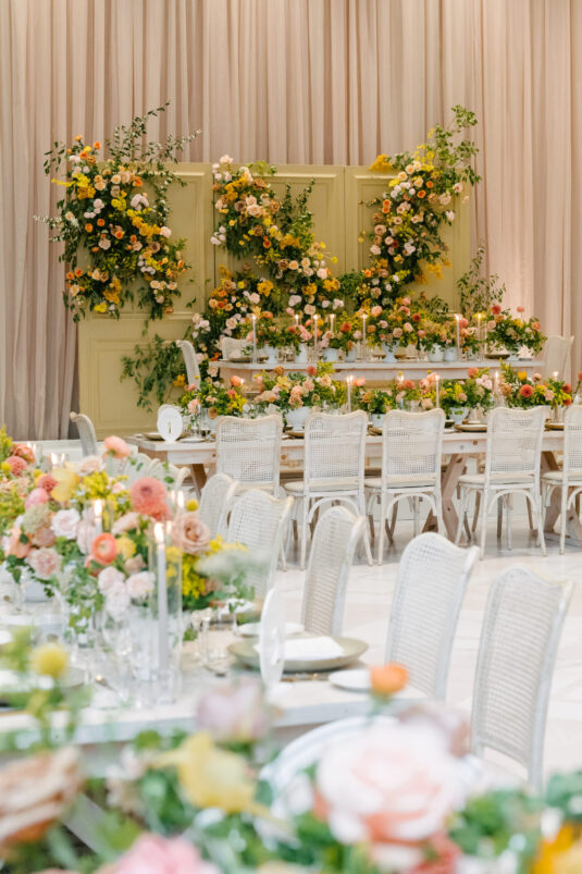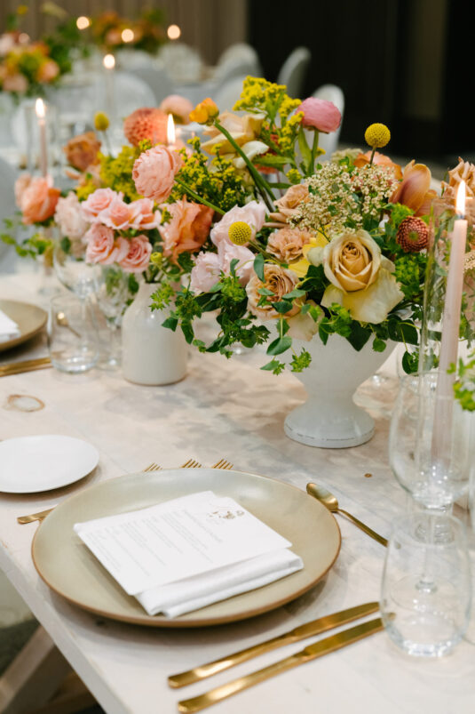 The celebration continued with a stunning reception. Vibrant floral arrangements in pink, yellow, and green adorned the tables. The carefully planned decor created a warm, inviting ambiance that perfectly complemented the couple’s personalities.