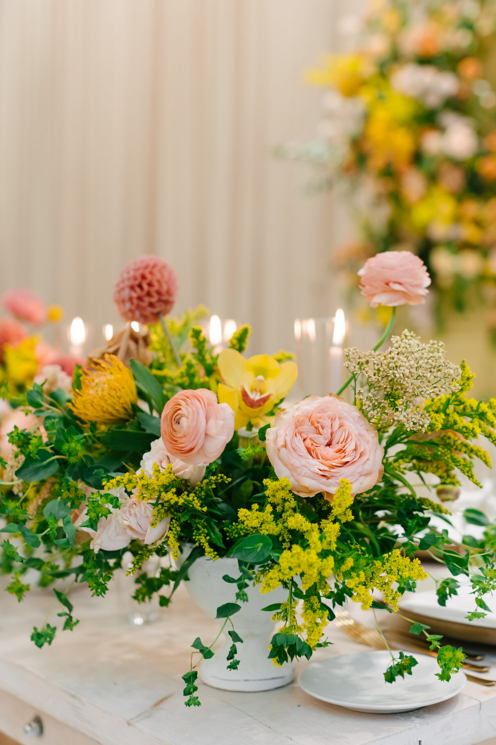 A vibrant floral centerpiece featuring a variety of pink and yellow flowers, including roses and daisies, surrounded by lush green foliage. The arrangement sits on a light-colored table with softly lit candles in the background, creating a warm and inviting ambiance perfect for Michelle and Daniel’s celebration.
