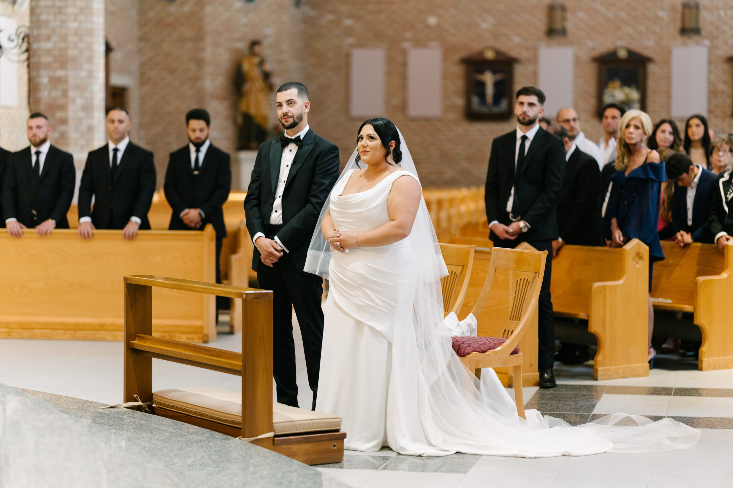 A couple, Michelle and Daniel, stands at the altar during their wedding ceremony in a church. Daniel is in a black tuxedo with a bow tie, while Michelle is in a white dress with a veil. Several guests, dressed formally, are seated in the pews, attentively watching the couple.