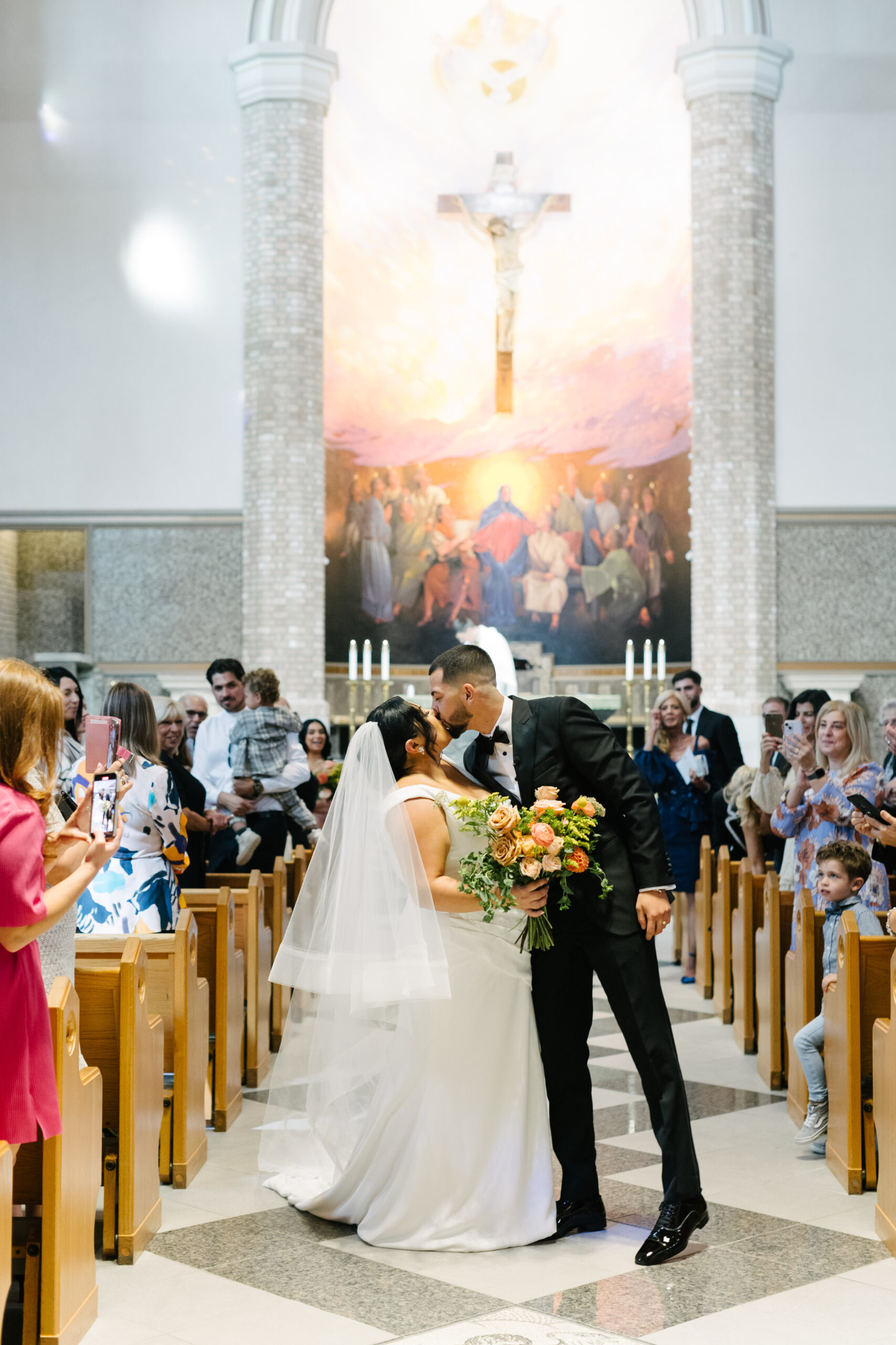 Daniel and Michelle, a newlywed couple, share a kiss at the altar in a church, surrounded by guests taking photos and celebrating. The bride holds a colorful bouquet, and the groom is dressed in a black suit. The church features tall columns and a large painting of a religious scene.