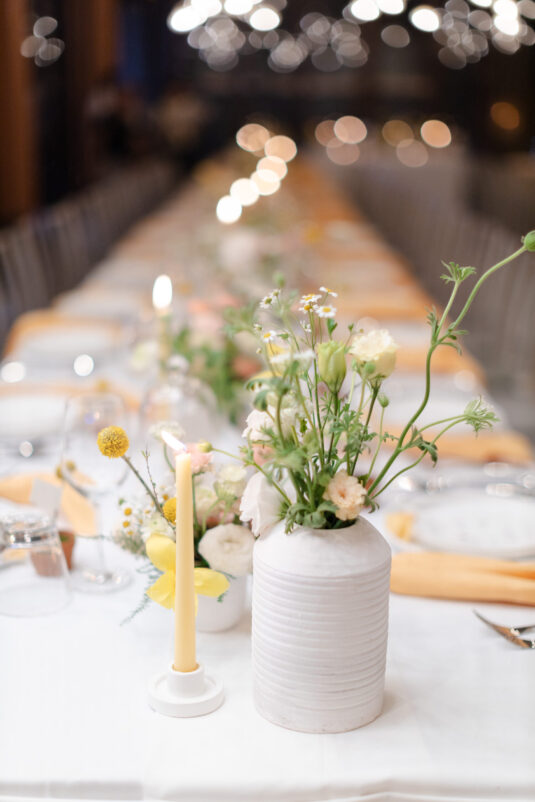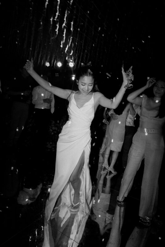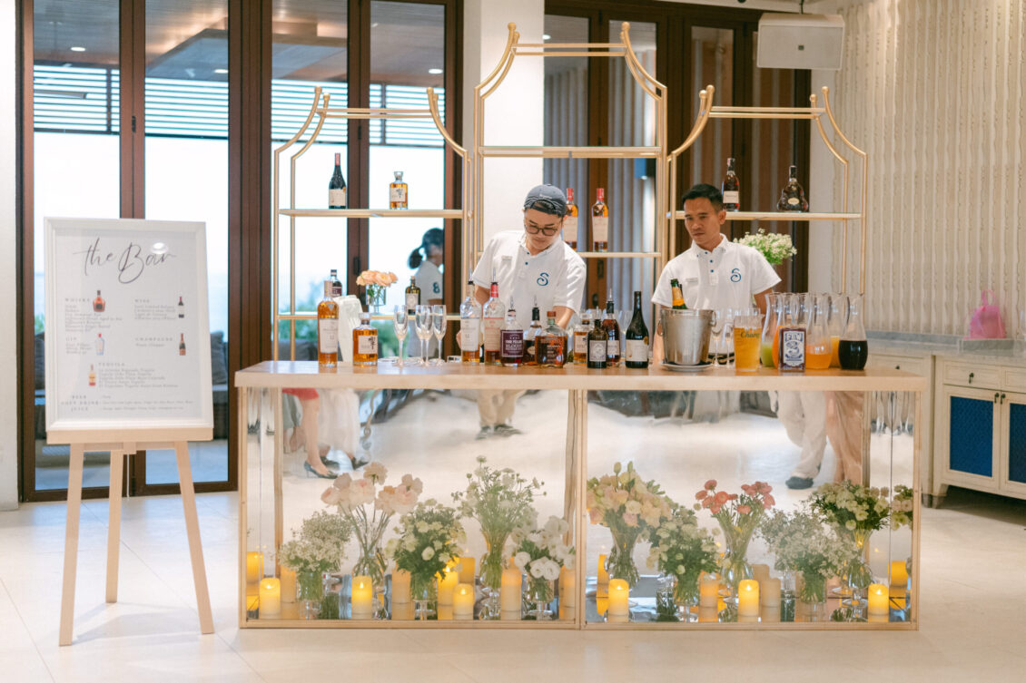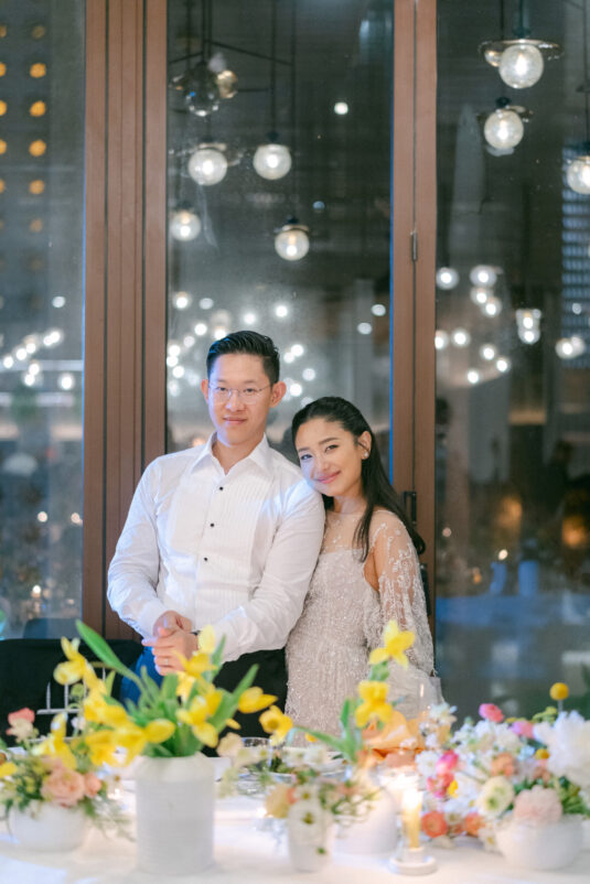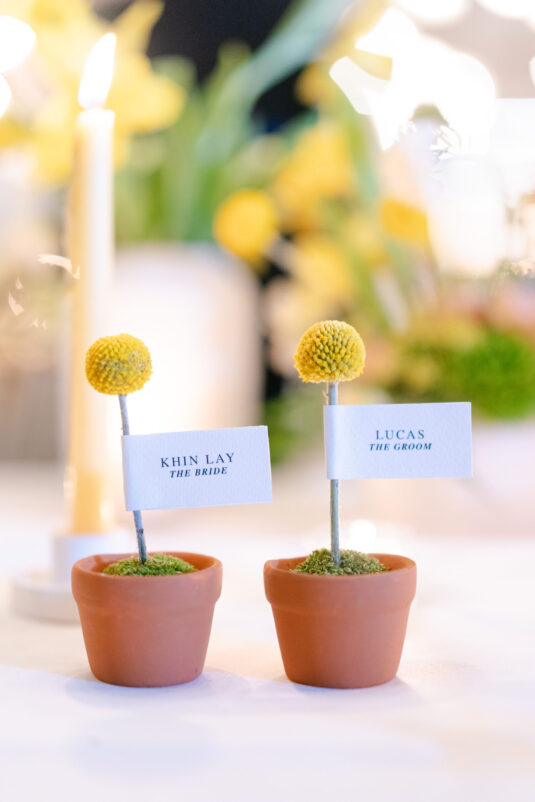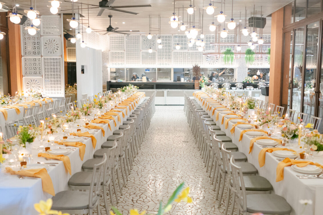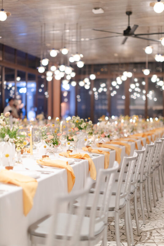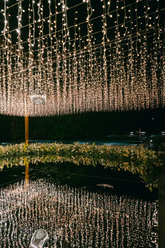 , the couple reflected their personalities with a theme of pastel yellow hues. Instead of a traditional flower arch, they opted for low-lying branches and a mirror walkway to enhance the serene scenery. Their celebration was truly magical, highlighted by a rainbow during their vows and surprise details like Craspedia Escort Cards and a custom-designed menu by the groom. The night was filled with laughter, joy, and unforgettable memories, featuring a mirrored bar stocked with over 300 bottles. It was a truly epic celebration of love!