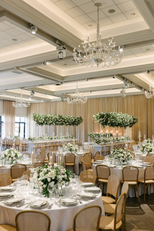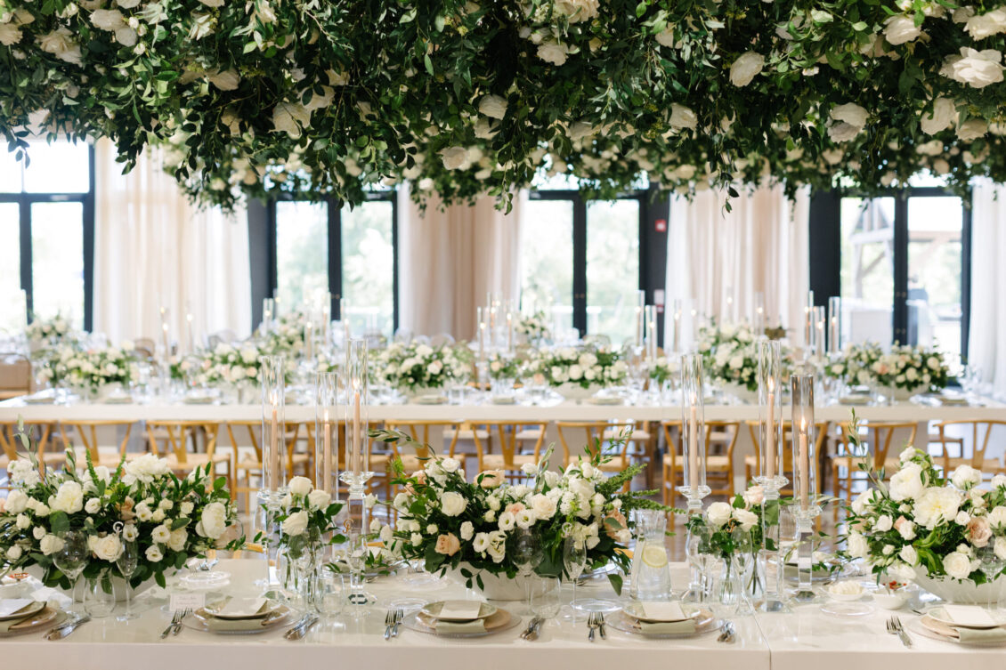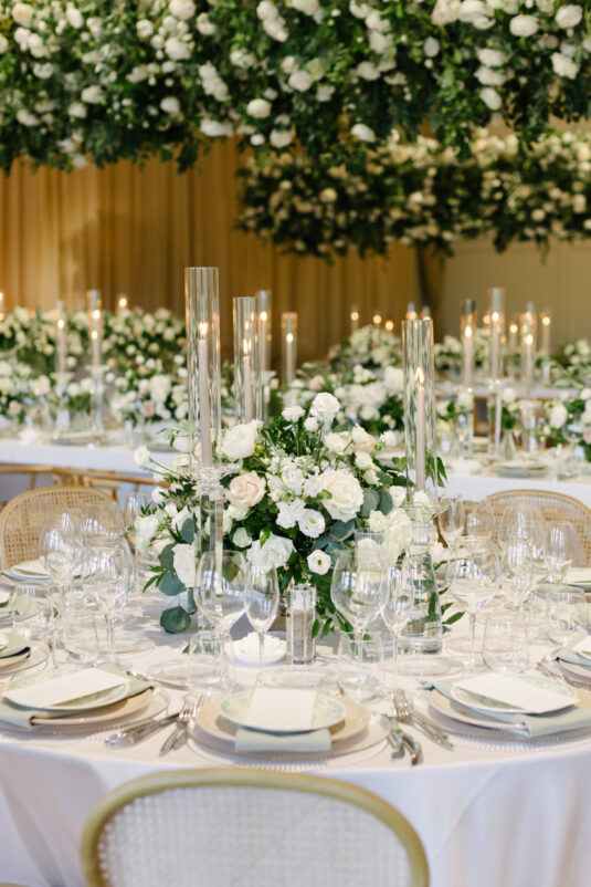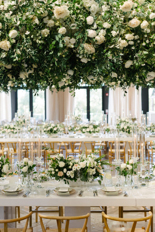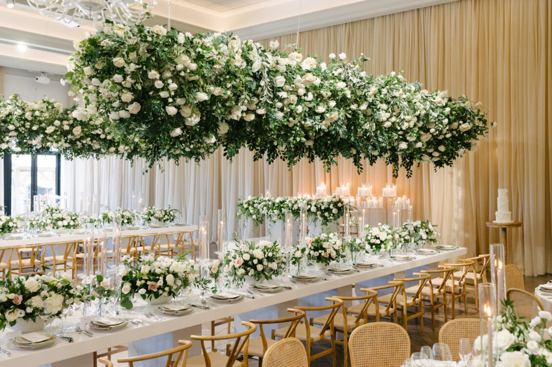 transformed the venue into a lush dream, punctuated with two oversized hanging floral installations that guests could dine underneath. The colour palette was soft and understated to complement the natural beauty of the greenery and outdoor scenery, while textures like wood, stone and linen helped to create the feeling of bringing the outdoors in.