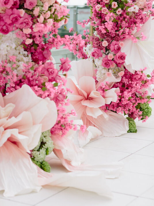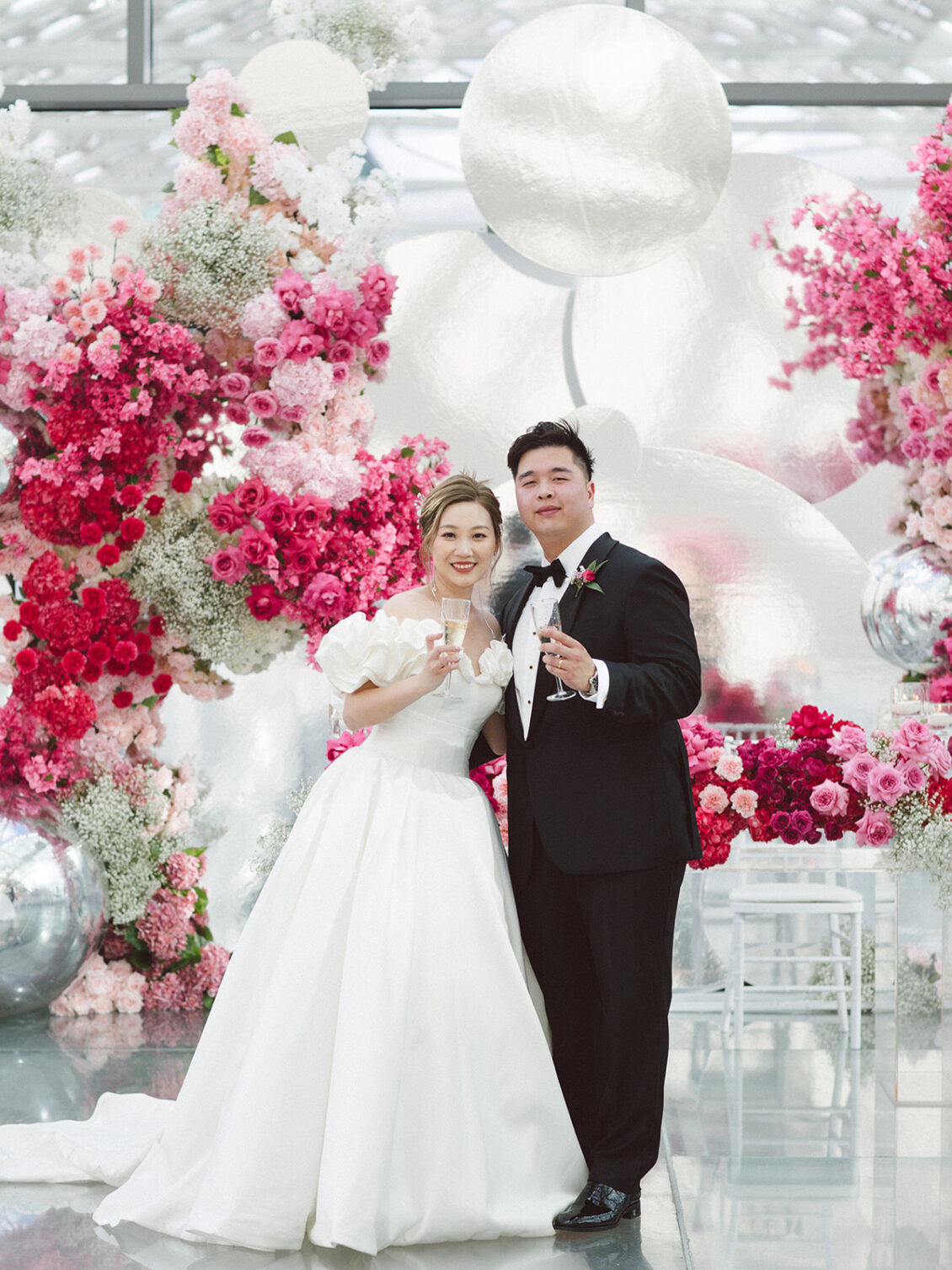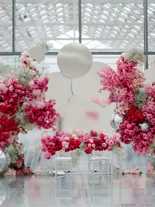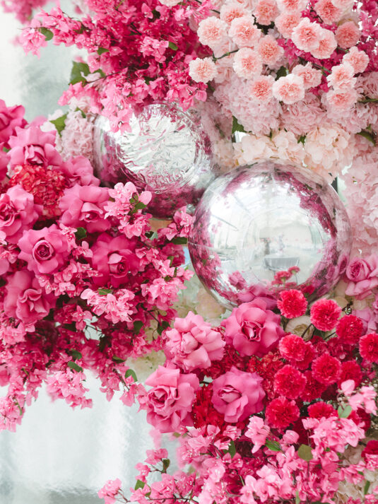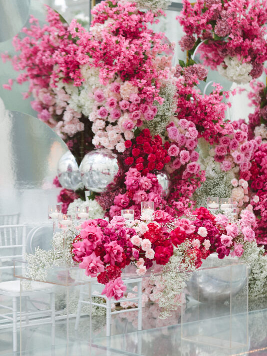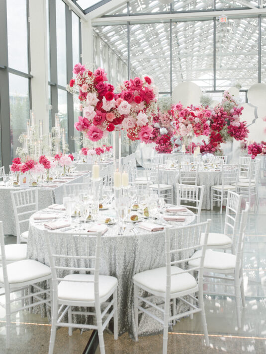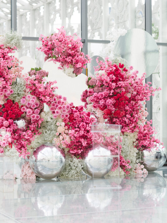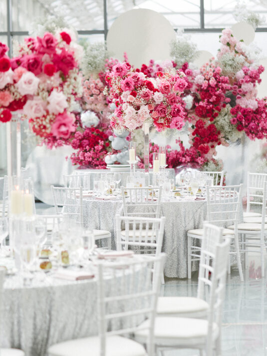 nailed the vibe, creating a dreamy, trendy space where every detail popped. From the giant paper flowers leading to a show-stopping floral arch to the shiny silver backdrop and floating balls in the reception room, this wedding was pure pink perfection. The different shades of fresh pink flowers against silver linens made the whole event a creative masterpiece.