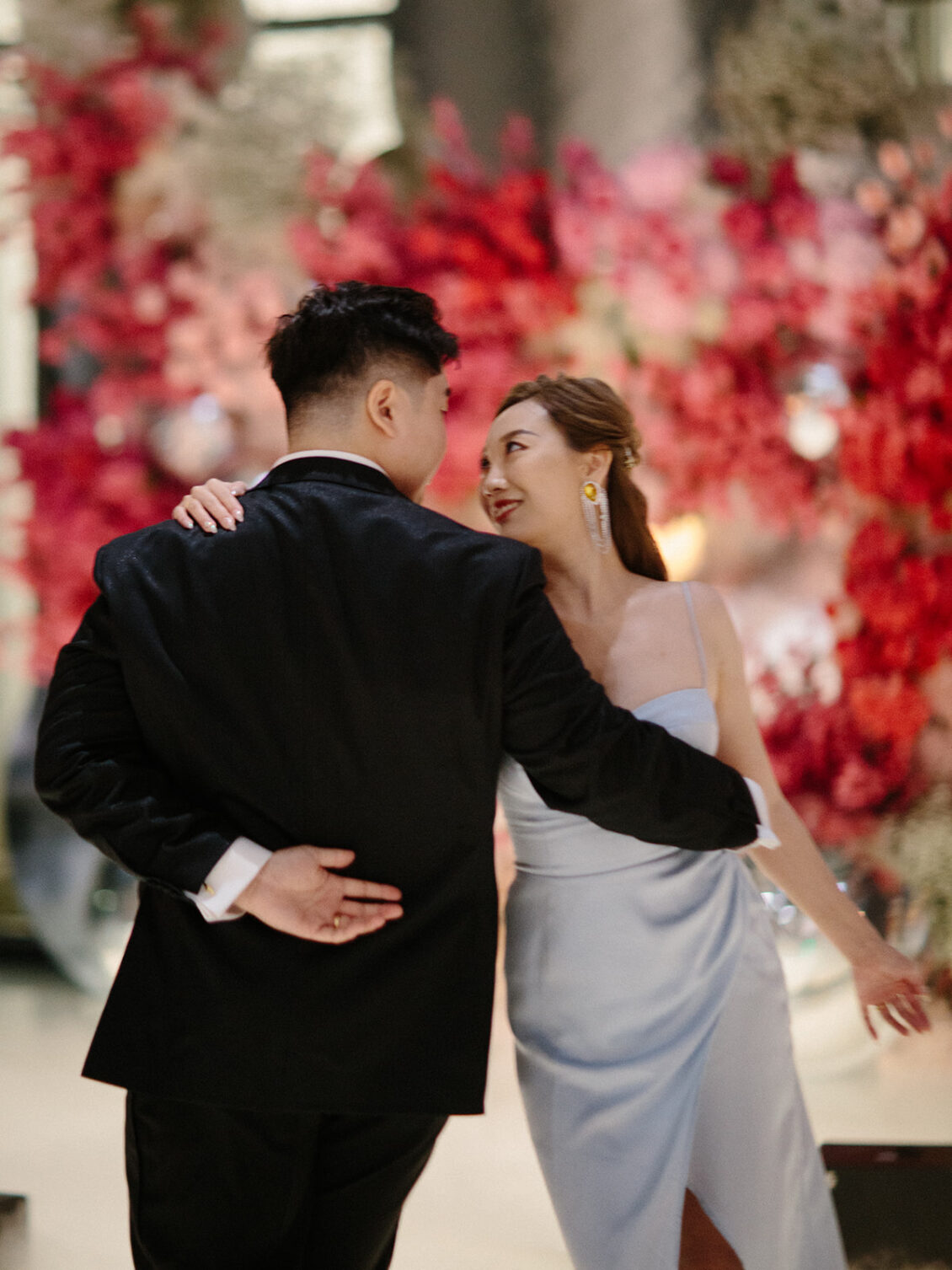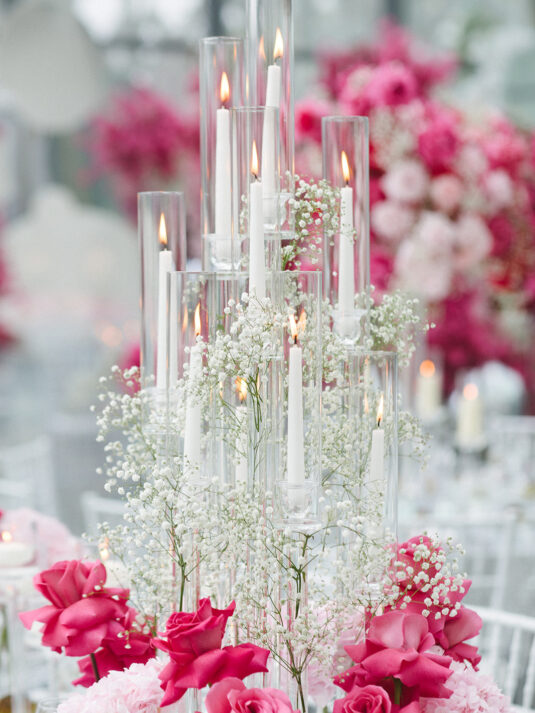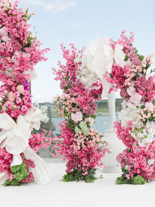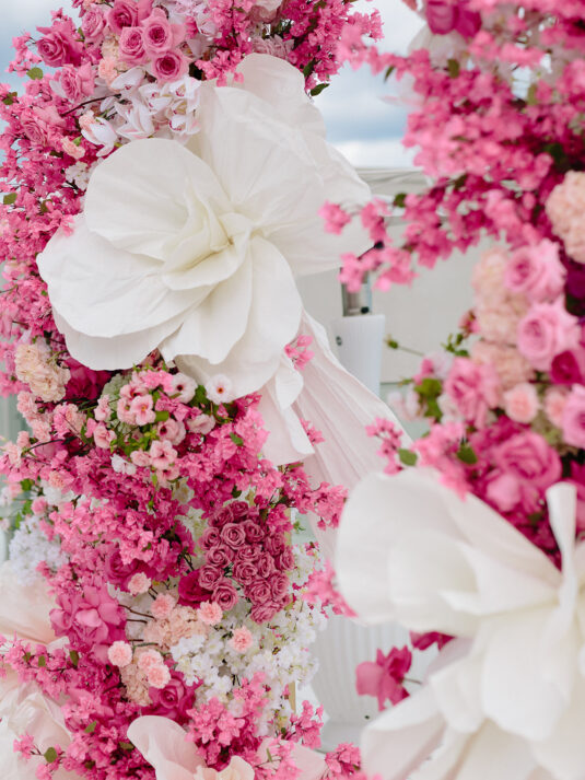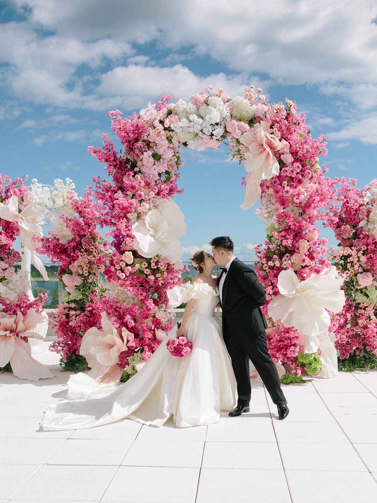 nailed the vibe, creating a dreamy, trendy space where every detail popped. From the giant paper flowers leading to a show-stopping floral arch to the shiny silver backdrop and floating balls in the reception room, this wedding was pure pink perfection. The different shades of fresh pink flowers against silver linens made the whole event a creative masterpiece.