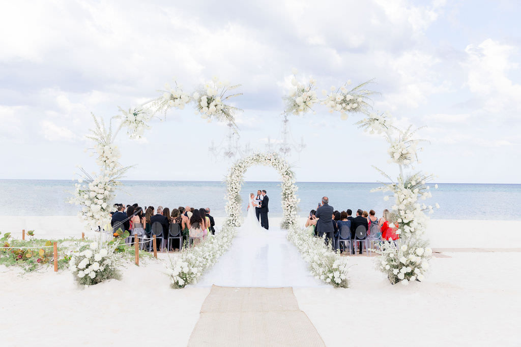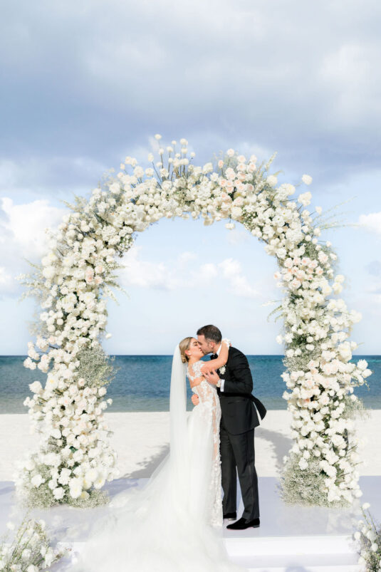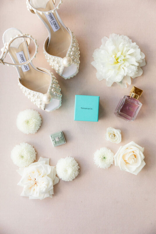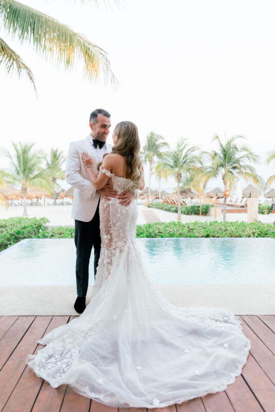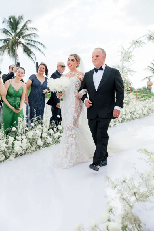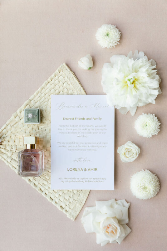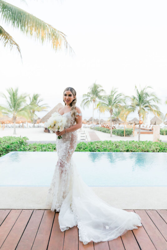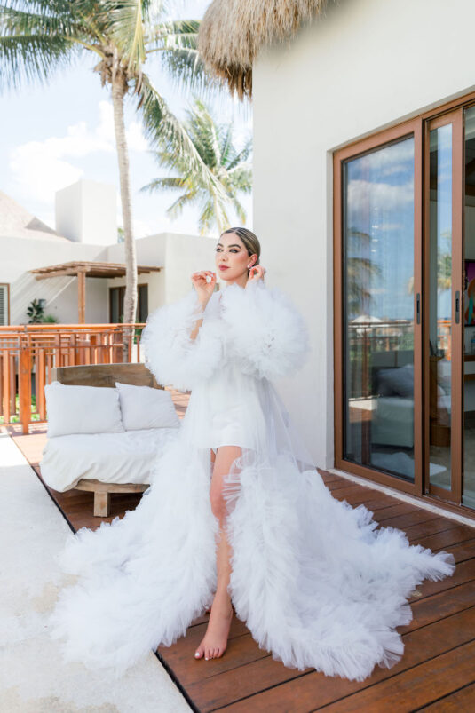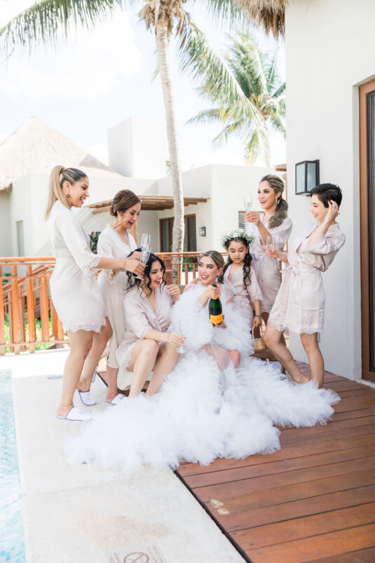 Lorena and Amir’s vision of a glamorous beachside destination wedding came to life in the most breathtaking way, creating an unforgettable celebration at the stunning Fairmont Mayakoba. From the very beginning, the bride’s details set the tone for the day, with her stunning pearl-adorned Jimmy Choo heels, a sparkling Tiffany & Co. ring, and soft ivory blooms artfully arranged. The bride and her bridal party began their day in style, enjoying a moment of celebration with champagne, clad in elegant blush satin robes. The backdrop of palm trees and the shimmering blue sea behind them set a perfect tone of tropical glamour.
