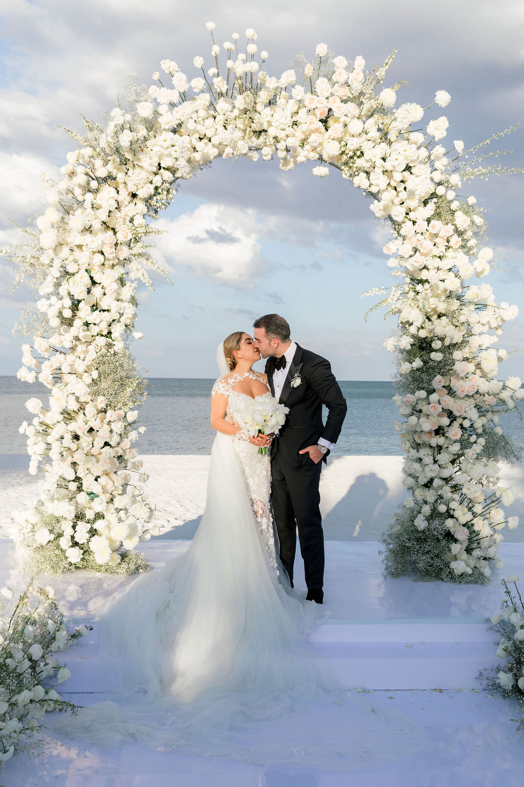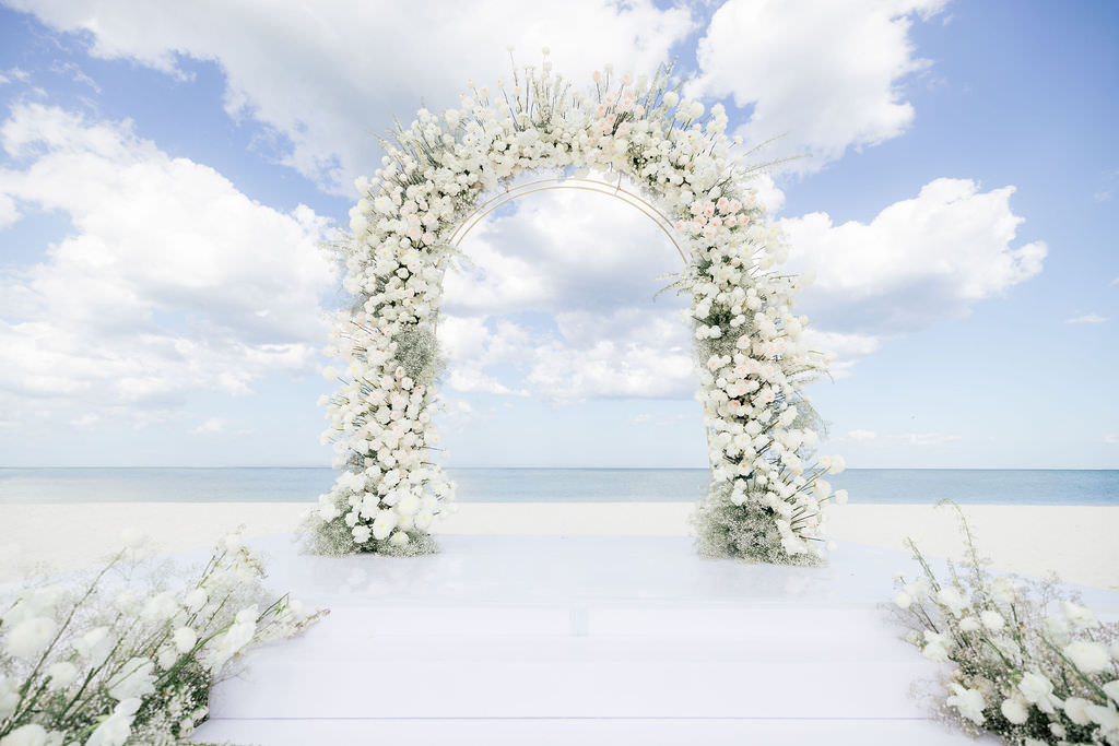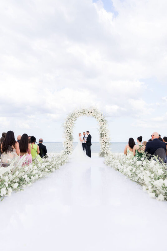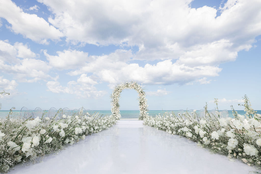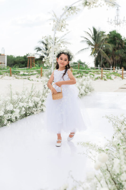 As the ceremony began, the stunning flower girl made her entrance, radiating innocence and beauty as she walked down the aisle in a delicate white dress, her basket in hand, and a crown of baby’s breath on her head. The aisle itself was a work of art—lined with pure white flowers, leading to a breathtaking archway overlooking the ocean. The floral design created a serene yet grand setting, perfectly framing the couple as they exchanged vows against a backdrop of blue skies and the endless horizon.