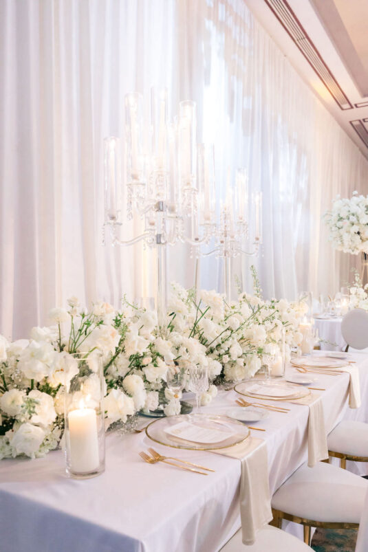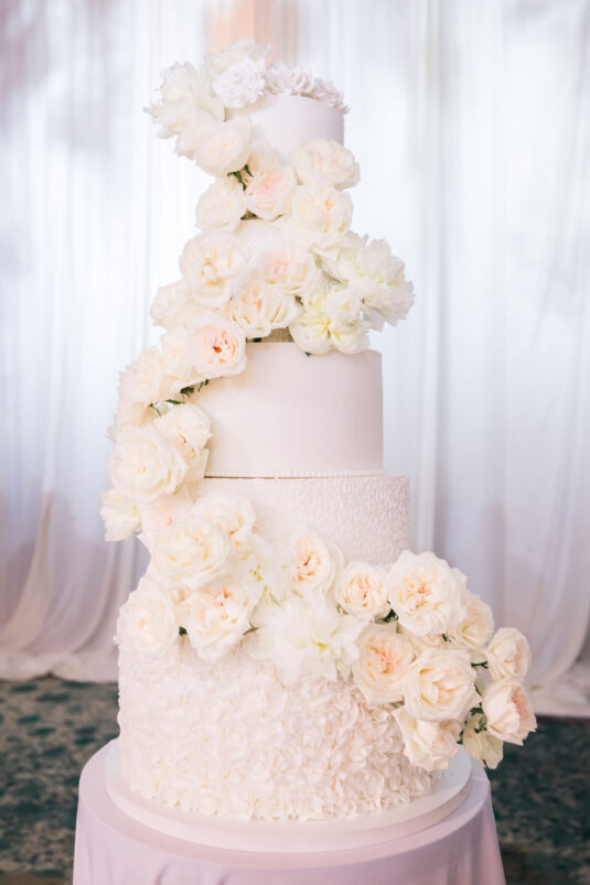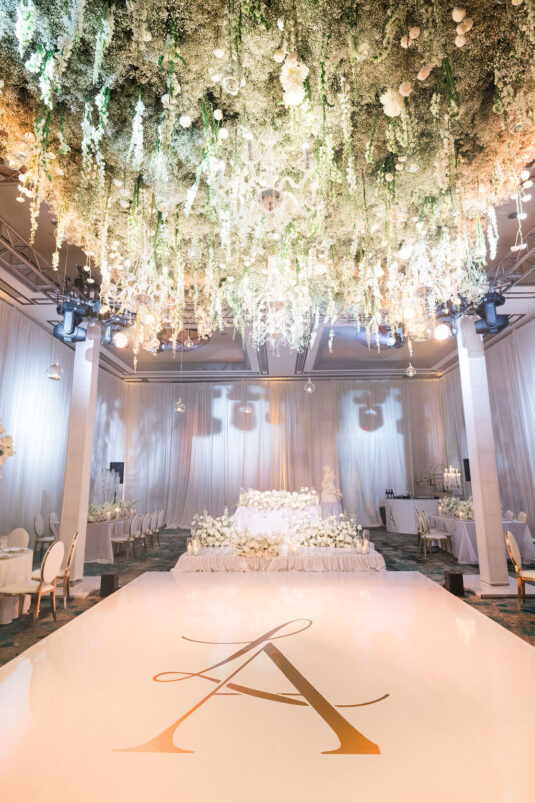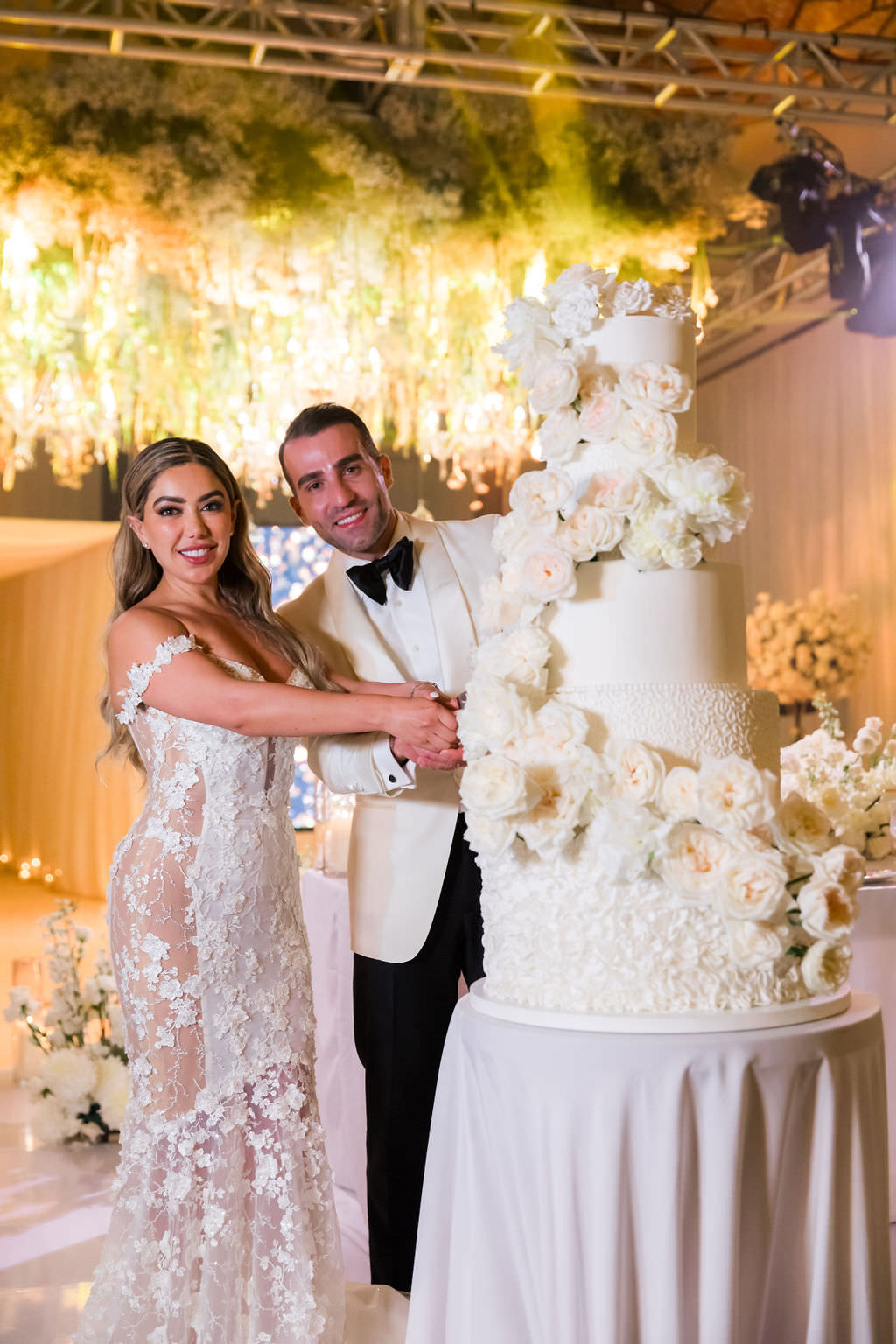 At the Reception, Crystal chandeliers hung from above, casting a romantic glow over the room, while golden accents shimmered in the candlelight. Lorena and Amir’s towering wedding cake, adorned with cascading white roses, was a showstopper that perfectly reflected the elegance of the evening. As the night progressed, the celebration transformed into a lively dance party. The dance floor was illuminated by vibrant lights as guests enjoyed the music and celebrated into the night. A special moment came when Lorena and Amir shared their first dance, with sparklers lighting up the floor, adding to the grandeur and spectacle of the evening.