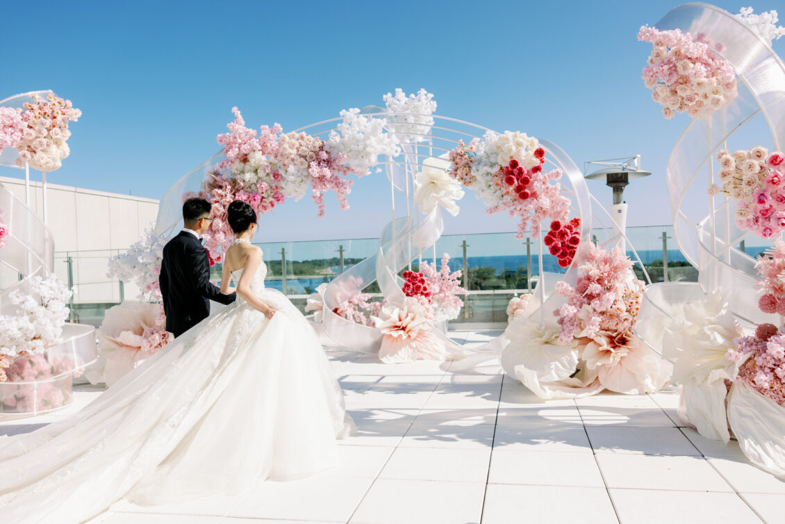 The centerpiece of the ceremony was a custom-built three-piece arch that artfully captured the gradient of pinks and reds, making a bold yet elegant statement. Rather than the traditional oversized floral installations, the couple opted for modern simplicity with giant white paper flowers, adding a whimsical touch to their outdoor setup. Each detail was meticulously crafted to highlight the ombre palette, from the soft blush tones at the start of the arch to the deep reds at its base.