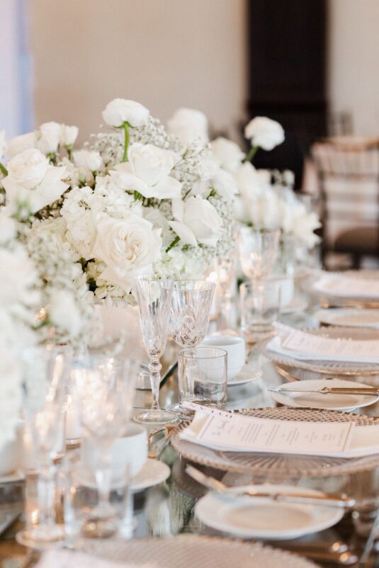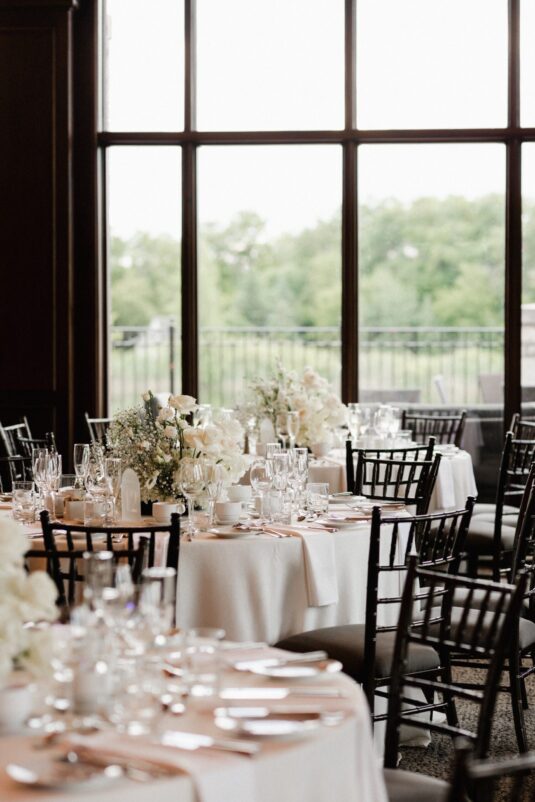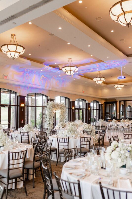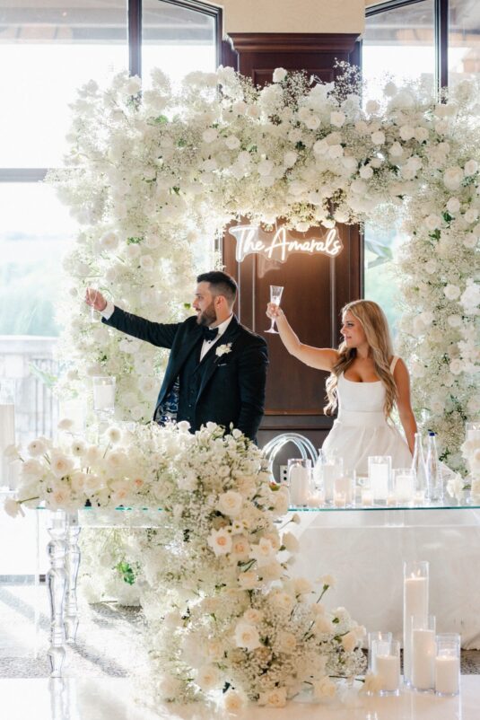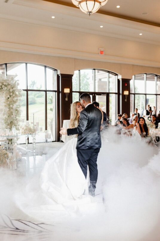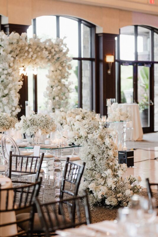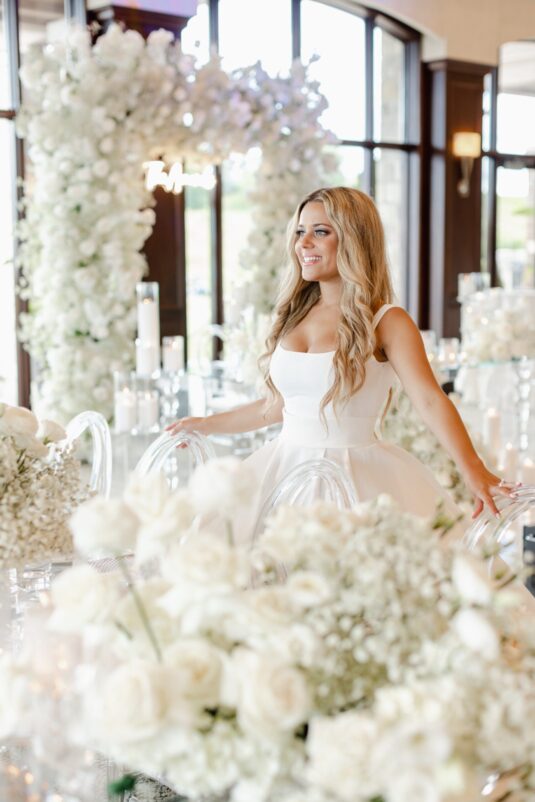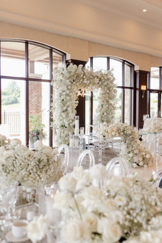 offering the perfect natural light to highlight the stunning floral arrangements by Right Choice Linen. The cascading flowers and soft pink tones of the bride’s custom Ines Di Santo gown created an ethereal feel, making the celebration even more unforgettable. The long summer day only added to the beauty, with sunlight flooding the room well into the evening, setting the perfect scene for a night of celebration.