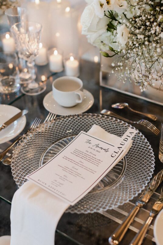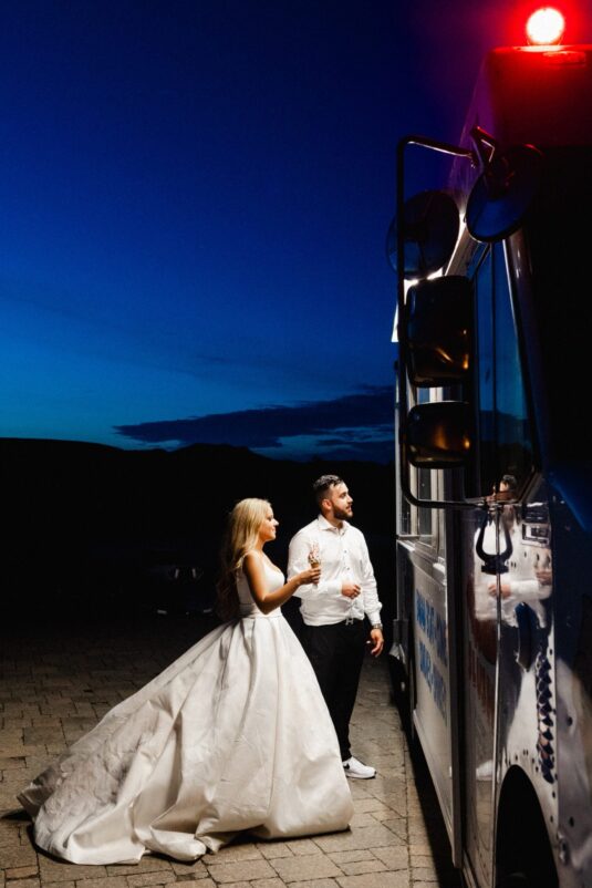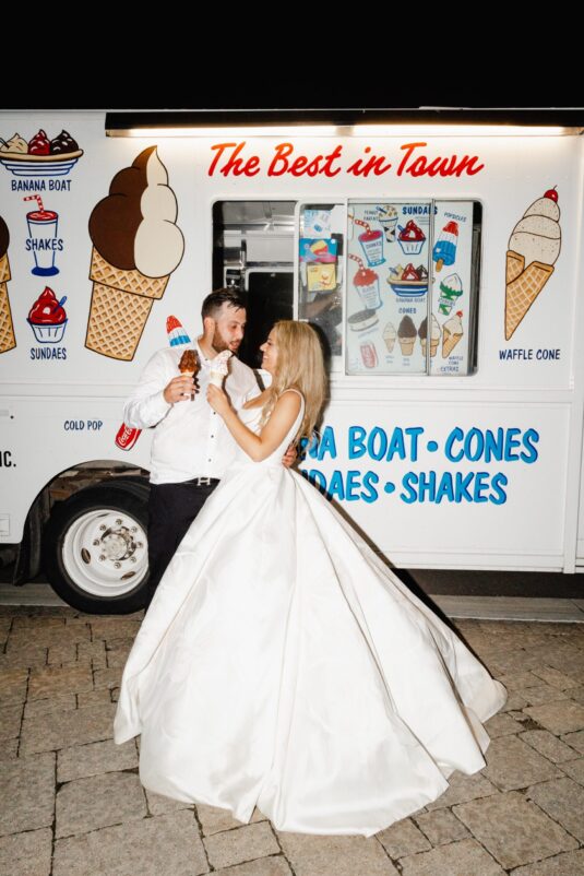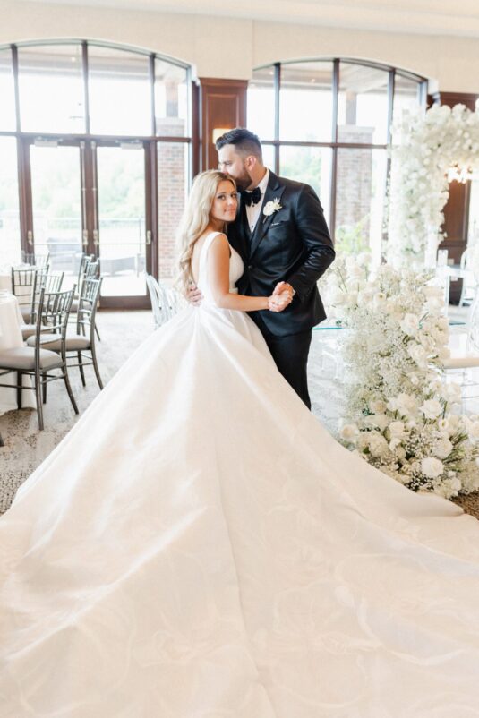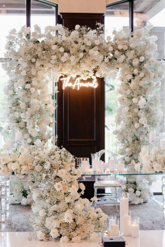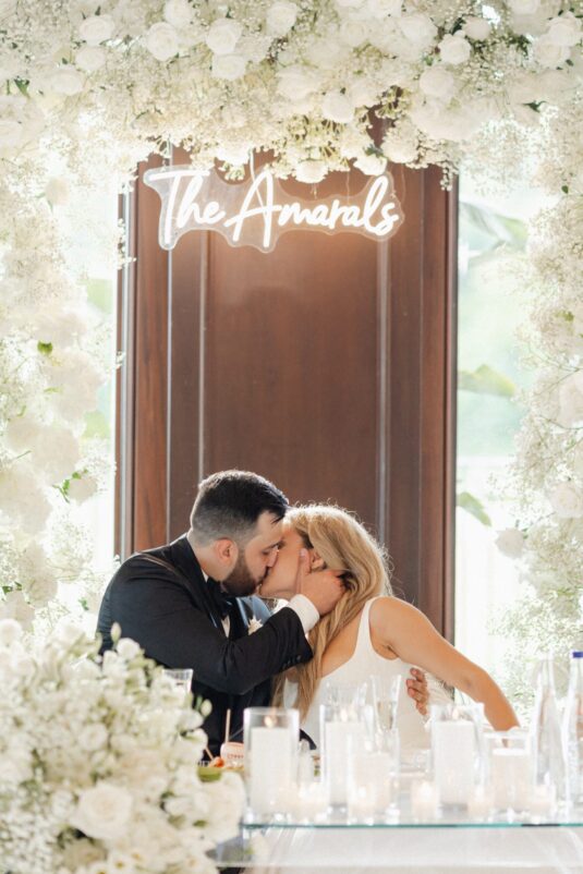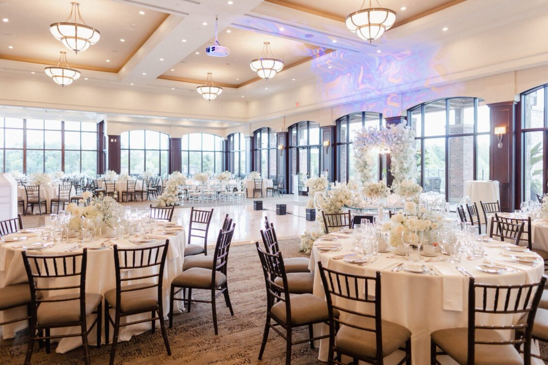 offering the perfect natural light to highlight the stunning floral arrangements by Right Choice Linen. The cascading flowers and soft pink tones of the bride’s custom Ines Di Santo gown created an ethereal feel, making the celebration even more unforgettable. The long summer day only added to the beauty, with sunlight flooding the room well into the evening, setting the perfect scene for a night of celebration.